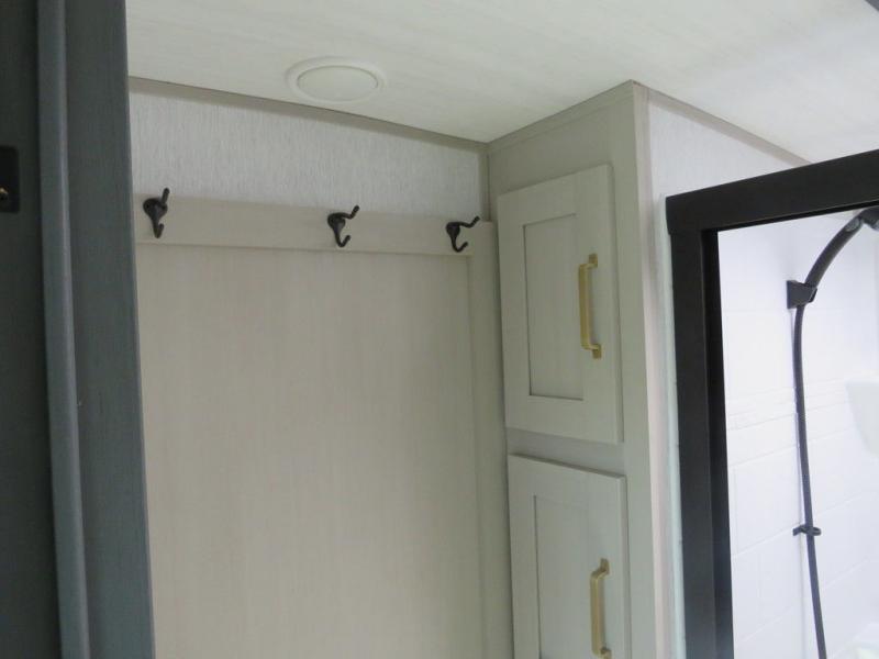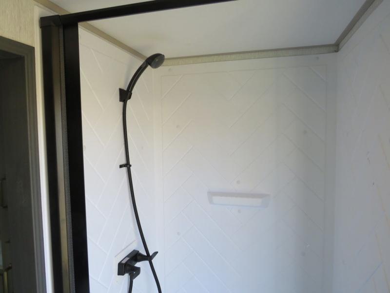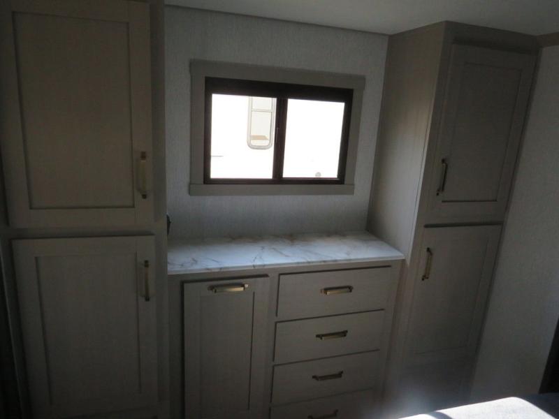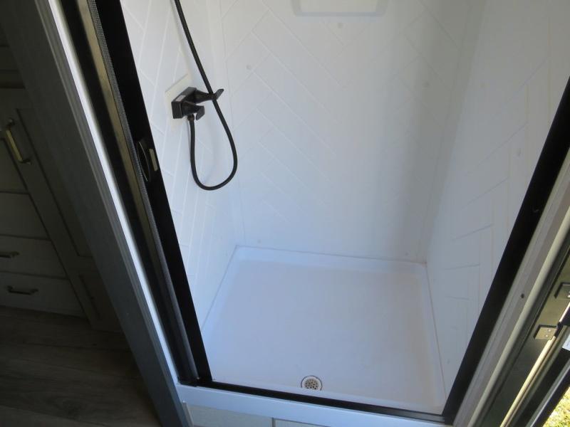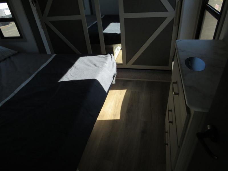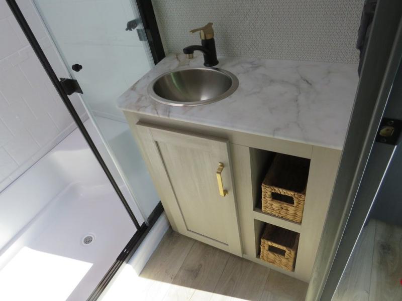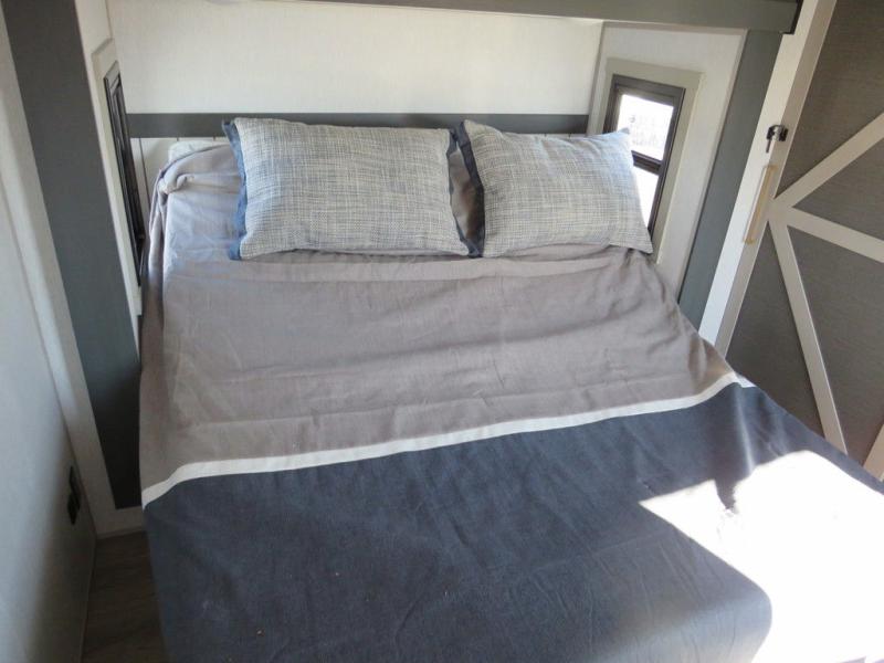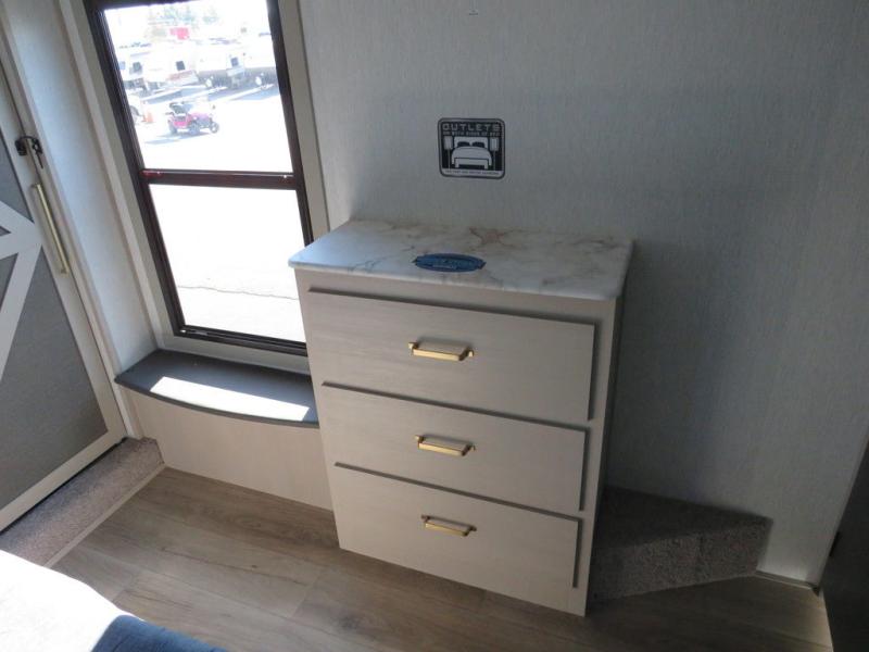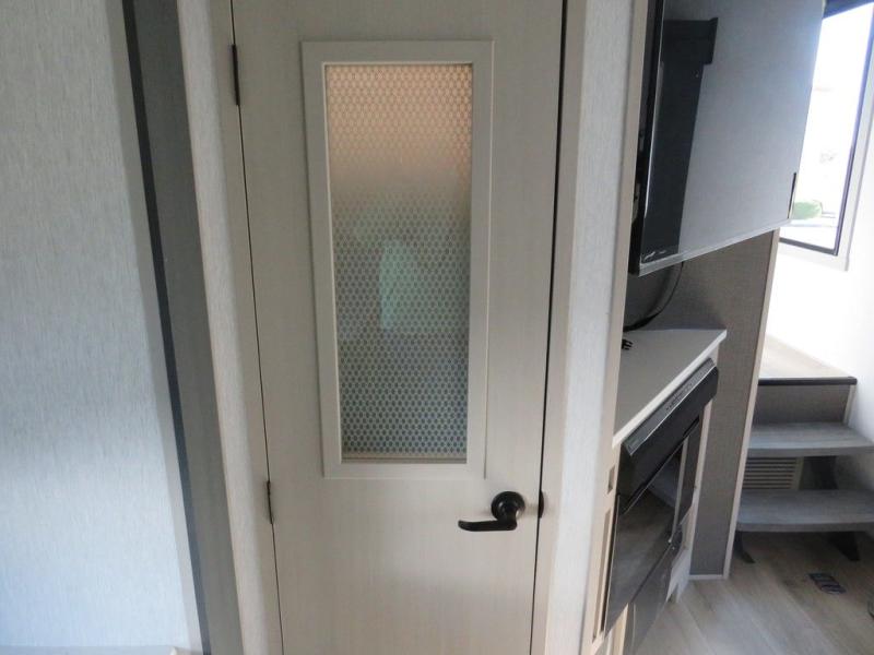With any Wildwood Heritage Glen fifth wheel by Forest River, the quality construction, attention to detail and design along with a bright and welcoming interior allows you to relax in comfort with conveniences while exploring outdoors. The European Oak colored horizontal plank linoleum flooring is unique, beautiful and durable, and there are gold-accented faucets with stainless steel sinks in the bathrooms for added luxury. The Accessibelly underbelly with 12V tank heaters will help protect your unit from the elements, and the power stabilizer jacks and landing gear will make set-up a breeze. More features that provide convenience include the high-end solid surface countertops, an RV Airflow System that provides at least 25% better airflow, an automotive grade painted front cap with a gel coat, and solar prep for off-grid capabilities.