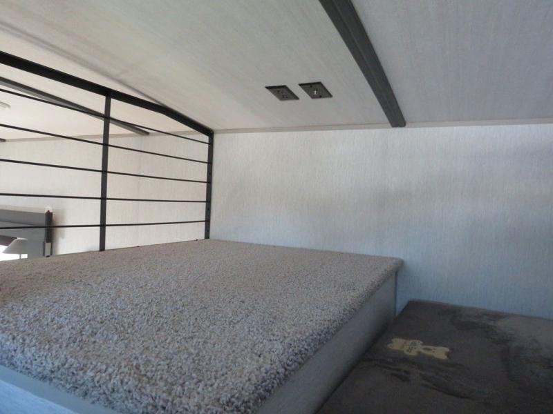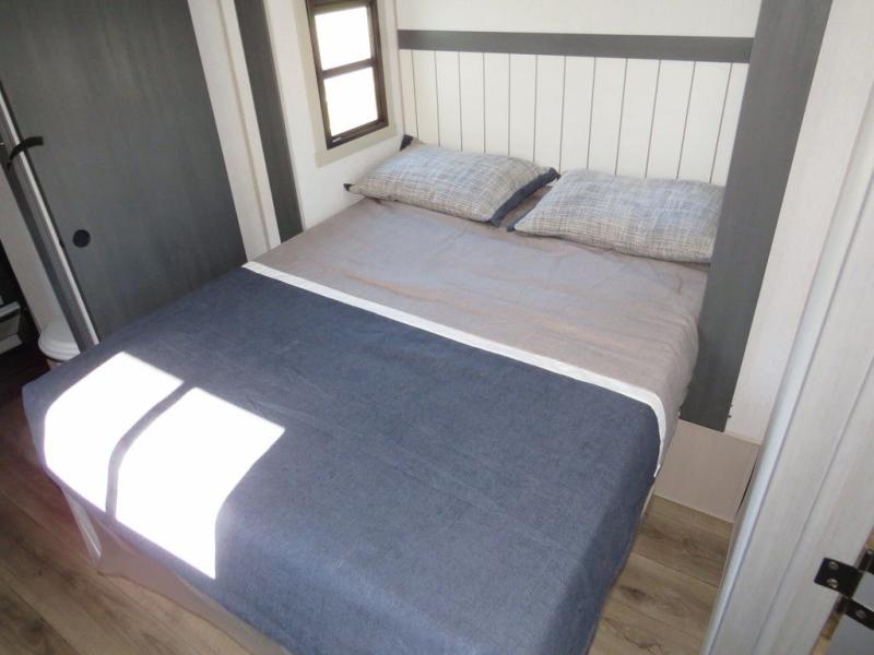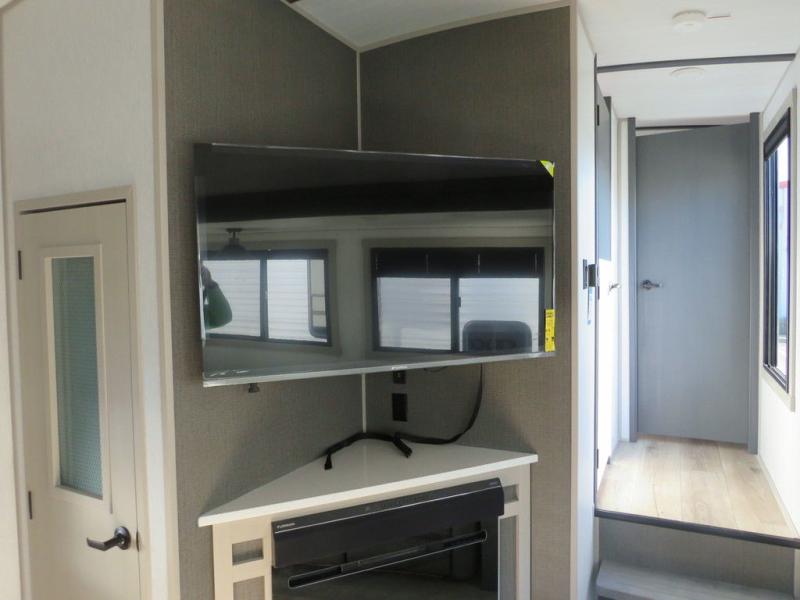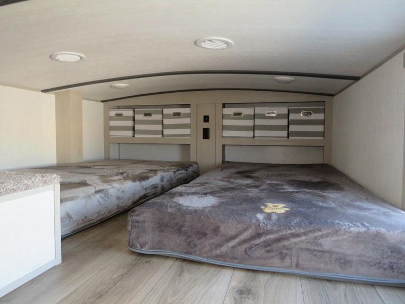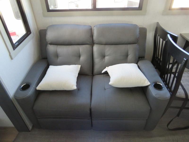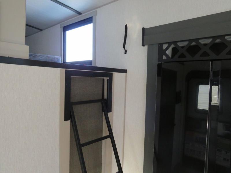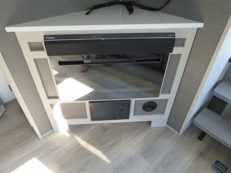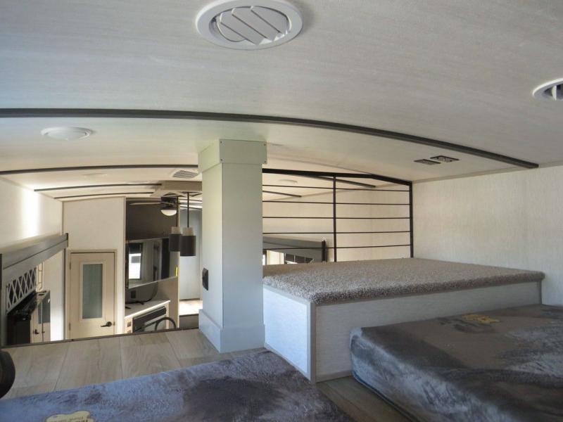 You can't beat this fifth wheel that has just about everything you could need for camping trips! There are two private bedrooms; one up front with a custom king bed with Versa Tilt and one in the back with a custom queen bed and its own full rear bath. You'll also find the second entry door located in the rear bathroom for added convenience! The kids are sure to love the loft with a ladder, two bunk mats, plus storage, or you can utilize this space for just storage if you don't have any guests staying over. The middle living area will be the perfect place to meet together since there are dual opposing slides for added space, theater seating and a table and chairs, plus a large kitchen island that will bring the whole room together. There is even a fireplace for a more cozy feel and a walk-in pantry to keep snacks
