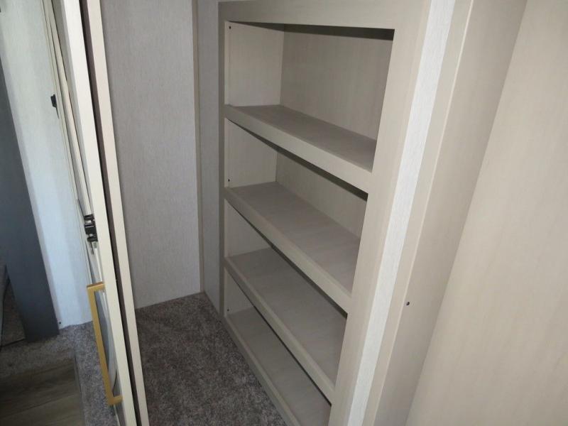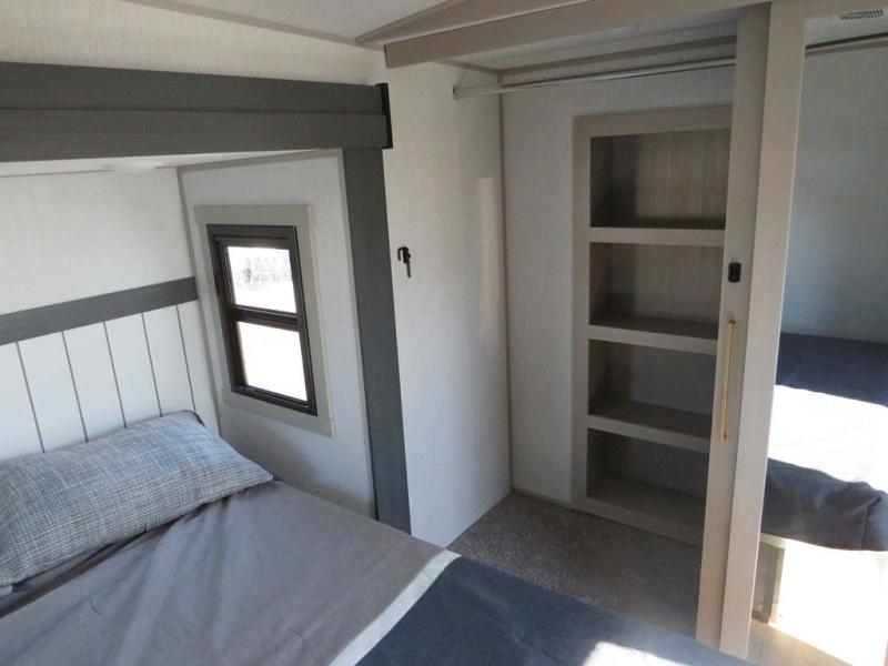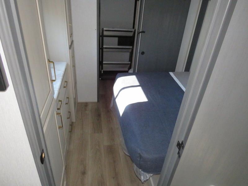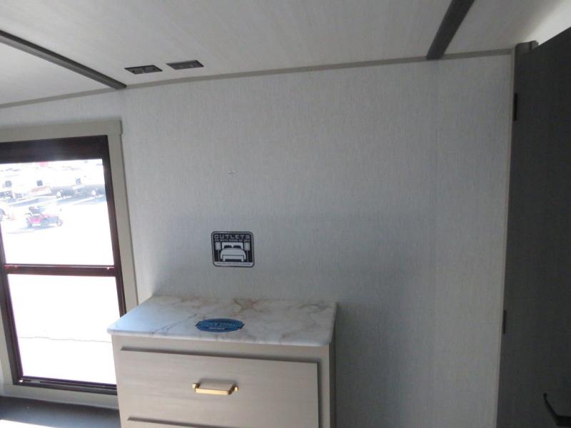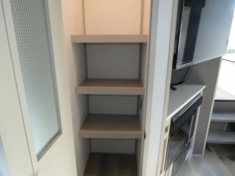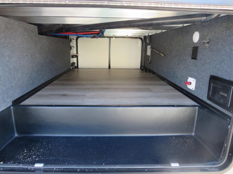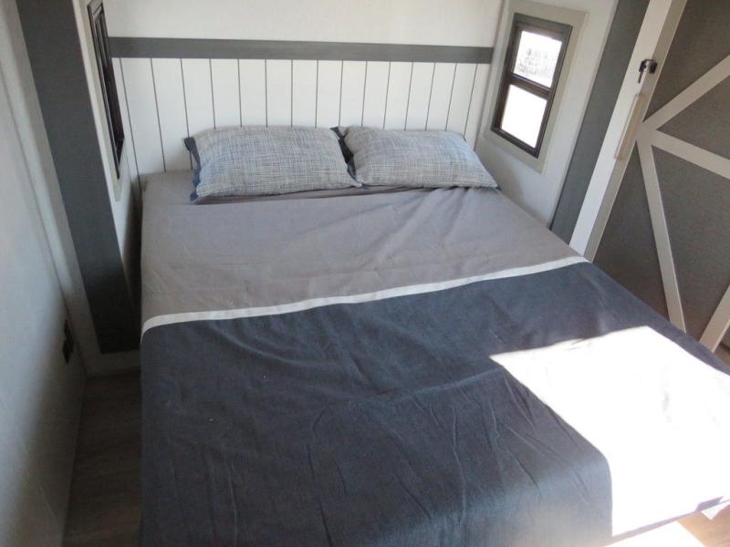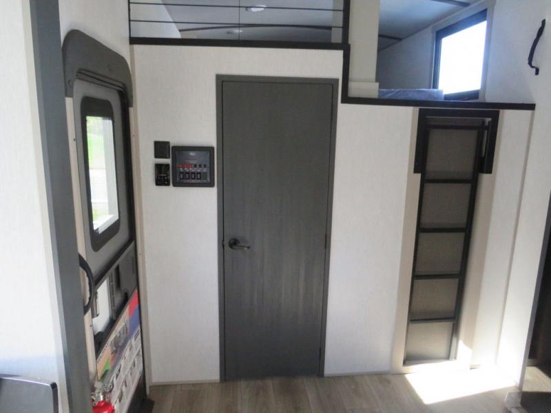 You can't beat this fifth wheel that has just about everything you could need for camping trips! There are two private bedrooms; one up front with a custom king bed with Versa Tilt and one in the back with a custom queen bed and its own full rear bath. You'll also find the second entry door located in the rear bathroom for added convenience! The kids are sure to love the loft with a ladder, two bunk mats, plus storage, or you can utilize this space for just storage if you don't have any guests staying over. The middle living area will be the perfect place to meet together since there are dual opposing slides for added space, theater seating and a table and chairs, plus a large kitchen island that will bring the whole room together. There is even a fireplace for a more cozy feel and a walk-in pantry to keep snacks