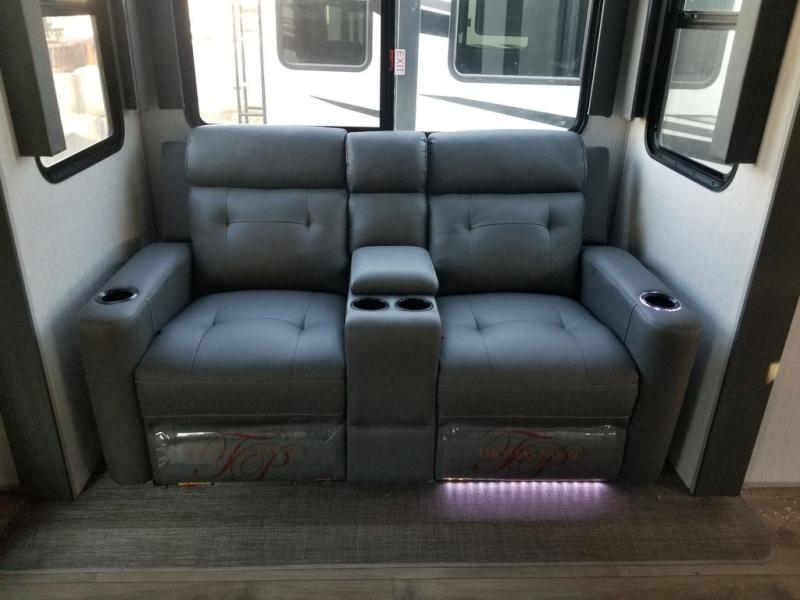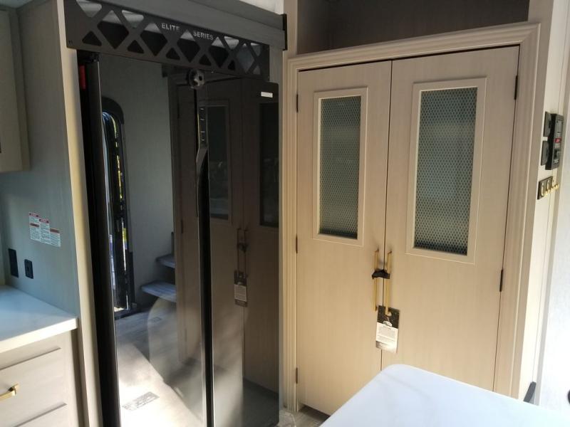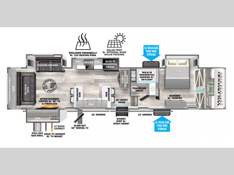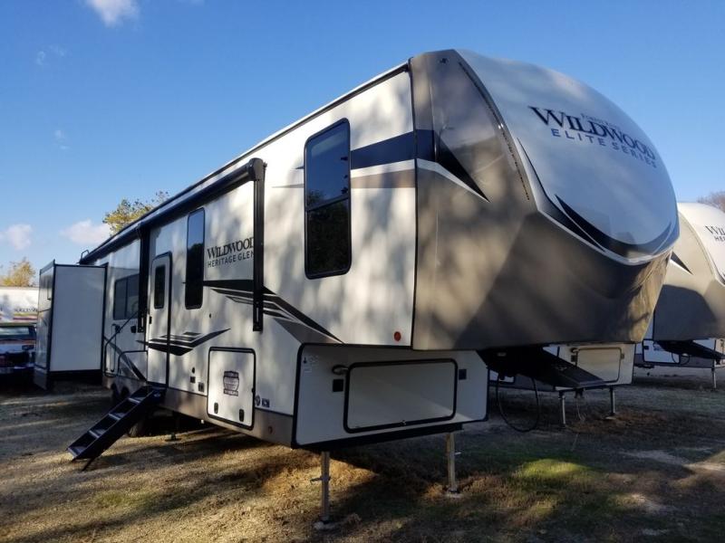 Travel in luxury with this Wildwood Heritage Glen Elite Series fifth wheel in tow! four slides create an open feel just like home. The front master bedroom is private and features a king bed with Versa-Tilt slide, a large front wardrobe, and a dresser with a hamper. A full bath with a walk-in shower including an overhead skylight will be a delight over using any campsite facilities. There is also a linen cabinet and porcelain toilet. On the main level, you will find a kitchen sink flanked by two breakfast bars each with two stools for dining. There is a deluxe French door pantry for your snacks and canned goods and a 20 cu. ft. 12V refrigerator for your perishable items. And the rear area living space features a theater seat slide, a tri-fold sofa, and an entertainment center with 50" TV, plus a fireplace for a cozy night inside. On the outside, you will enjoy the Texas XL sized pass-through storage for all of your outside games and camping gear, an exterior 50" swivel TV, and pull-out gas grill and a refrigerator so you can grill or entertain easily under the two patio awnings.