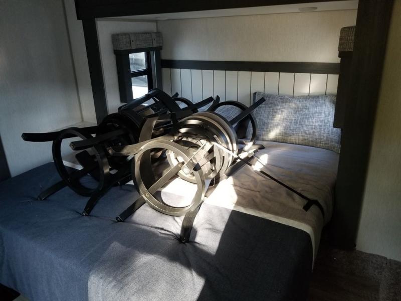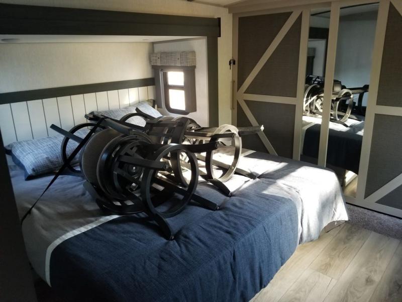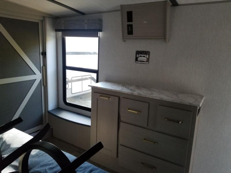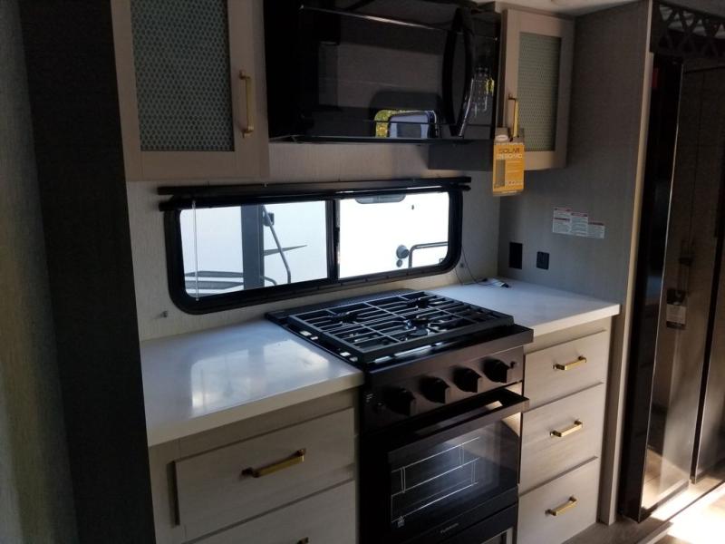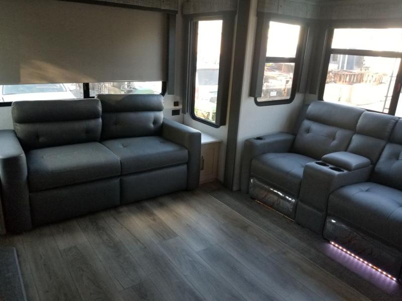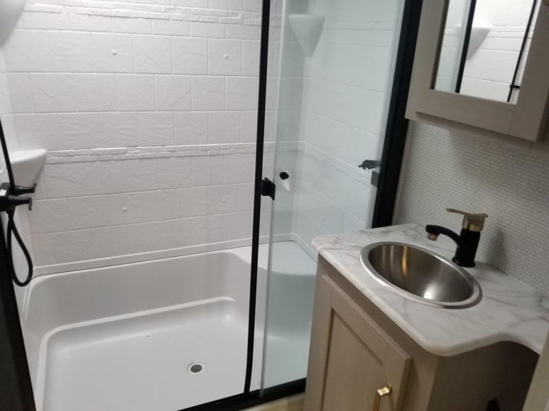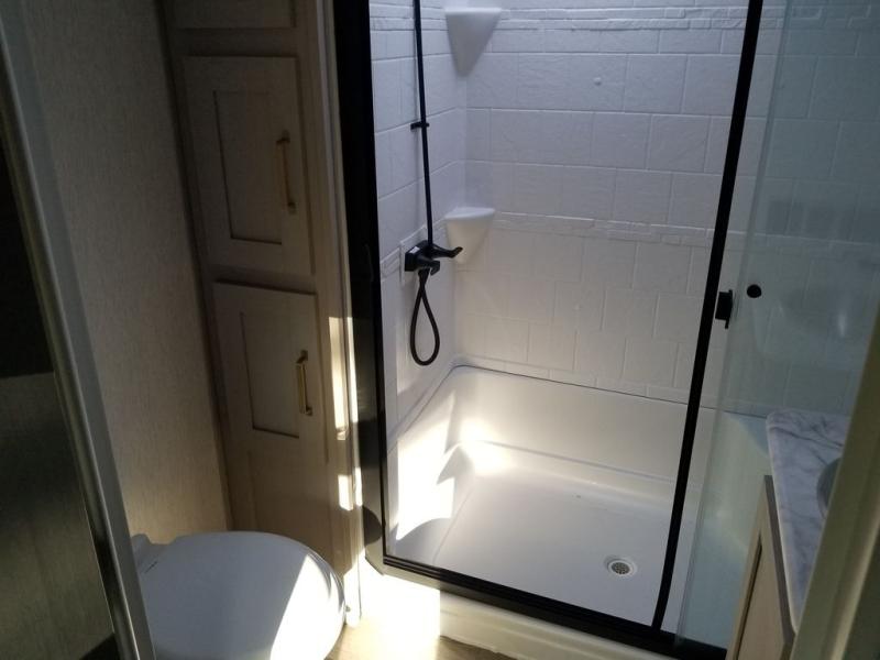 Each Wildwood Heritage Glen Elite Series fifth wheel by Forest River is constructed with vacuum bonded "Aluma Frame" sidewalls and floor, block foam insulation, and an AccessiBelly underbelly with 12V tank heaters on all holding tanks to help extend your camping season. There is an exterior docking station with hot and cold water, along with power stabilizer jacks and landing gear, and Goodyear radial tires with black accented rims. There is also an in-line water filtration system, an RV Airflow system, and an extra large pass-through storage with Slam Latch baggage doors and magnetic catches for hassle-free packing. You will love the high-end solid surface countertops inside, along with gold-accented faucets with stainless steel sinks in all bathrooms, and European oak colored horizontal plank linoleum flooring that is both stylish and easy to keep clean!