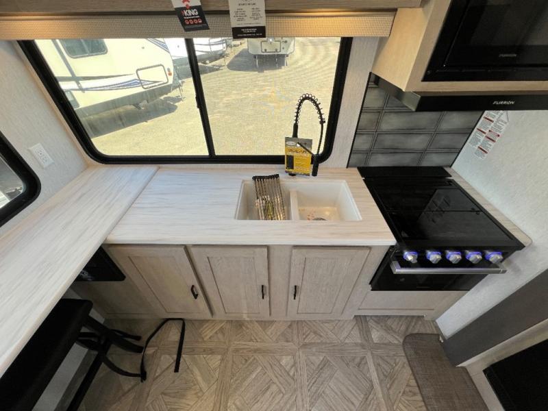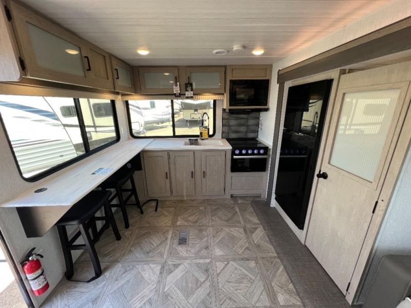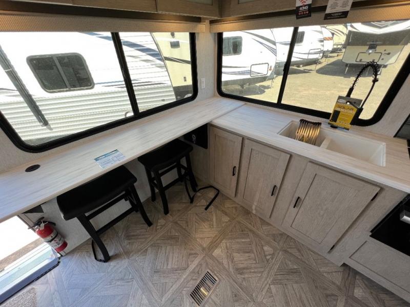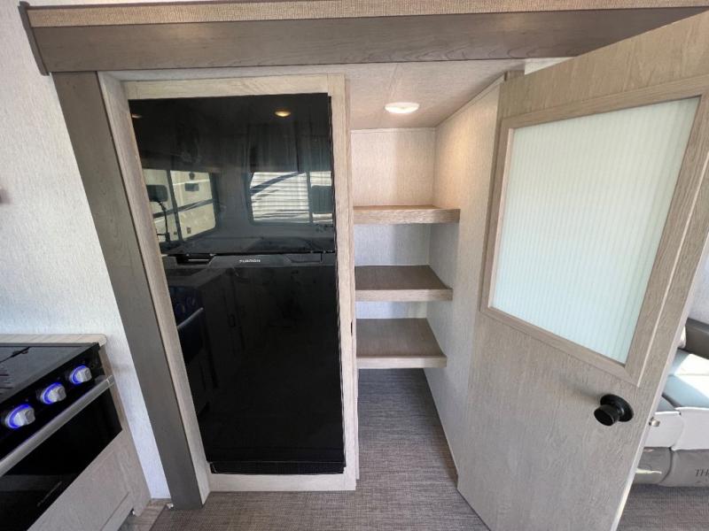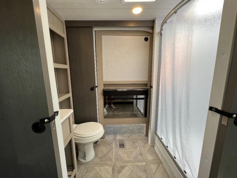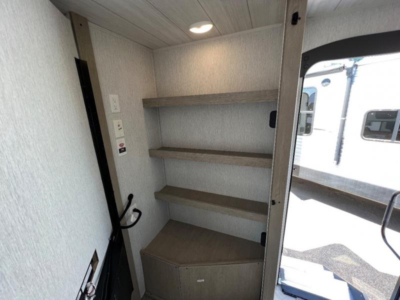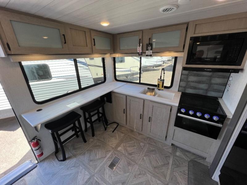 You're going to love cooking in the rear kitchen of this travel trailer! It has everything you need to prepare delicious home cooked meals including a large pantry and oversized fridge, plus there are two bar stools to sit on while you enjoy them. The theater seating is conveniently across from the swiveling entertainment center which has hidden shelves behind it for your games and movies. As you walk-through the bathroom, you will notice a walk-in shower to the left and a toilet and sink to the right. It leads directly into the front private bedroom which has a Versa-Tilt custom king bed to lay your head on at night and wardrobes/nightstands on either side for your items!