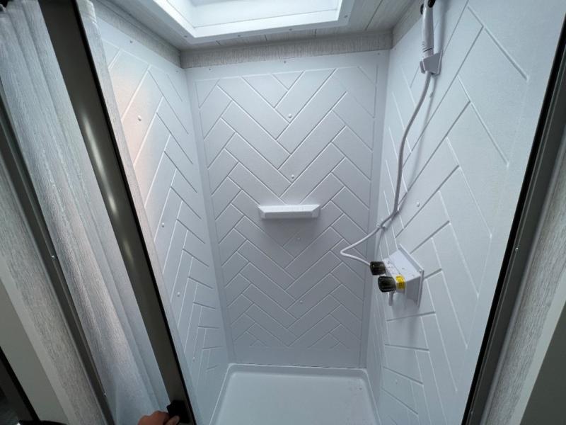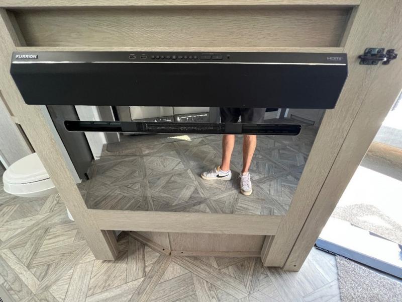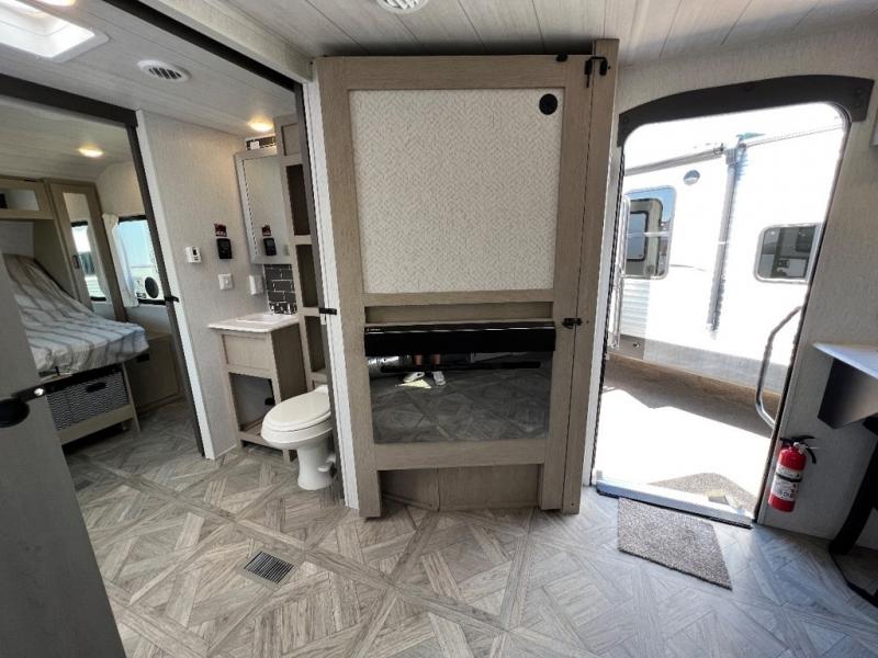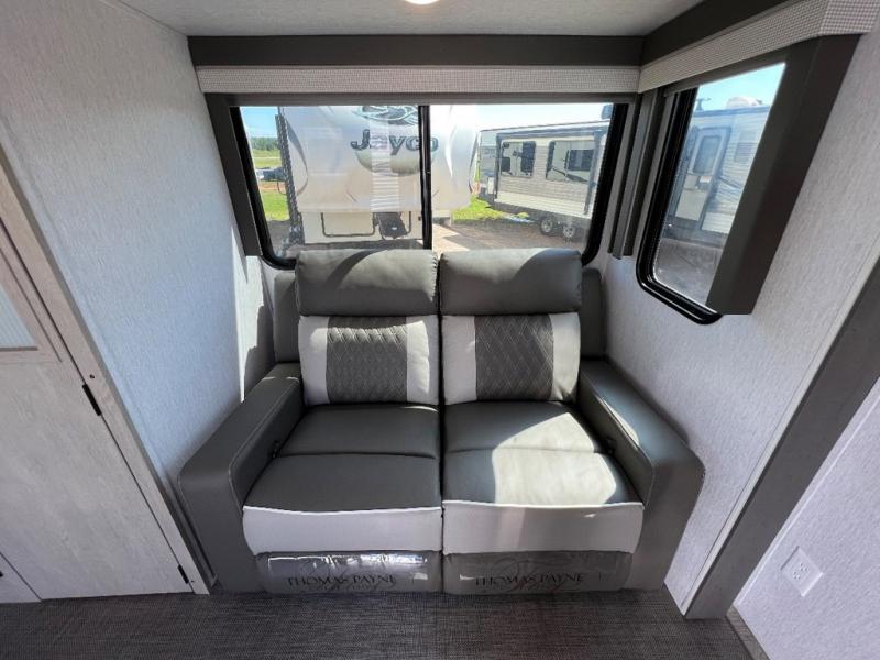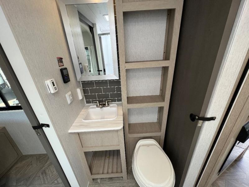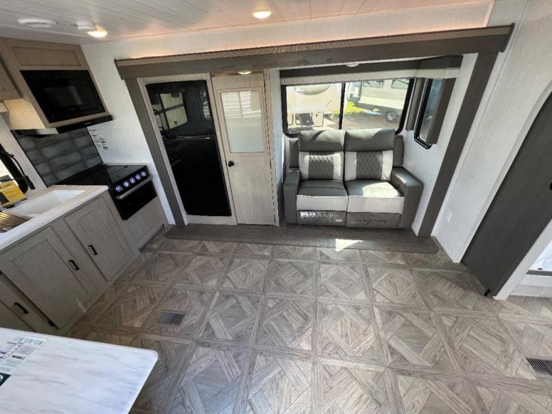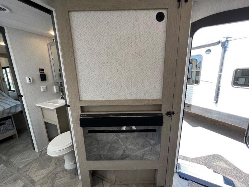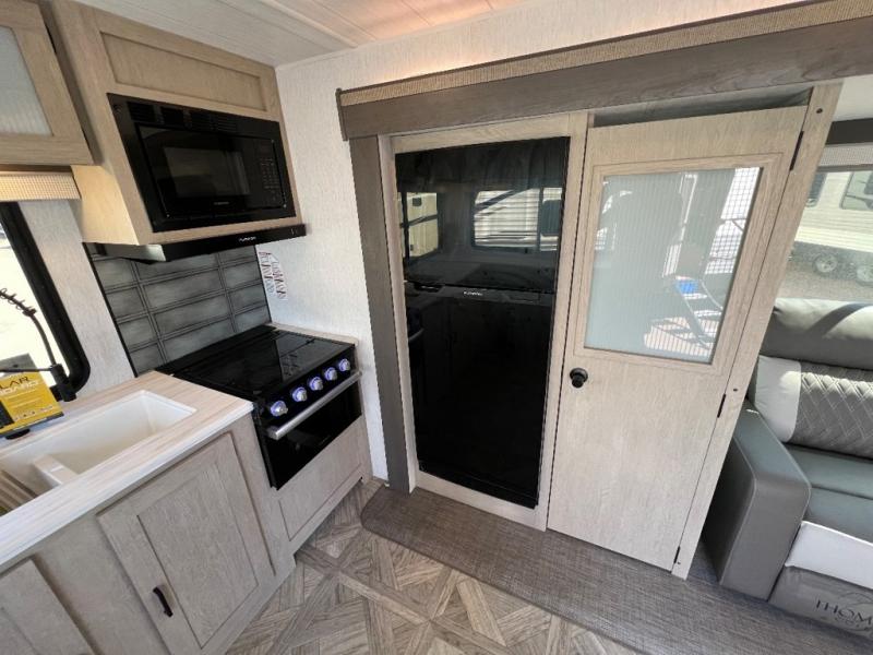 You're going to love cooking in the rear kitchen of this travel trailer! It has everything you need to prepare delicious home cooked meals including a large pantry and oversized fridge, plus there are two bar stools to sit on while you enjoy them. The theater seating is conveniently across from the swiveling entertainment center which has hidden shelves behind it for your games and movies. As you walk-through the bathroom, you will notice a walk-in shower to the left and a toilet and sink to the right. It leads directly into the front private bedroom which has a Versa-Tilt custom king bed to lay your head on at night and wardrobes/nightstands on either side for your items!
