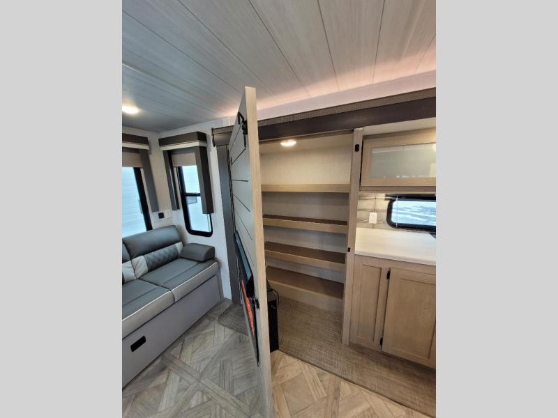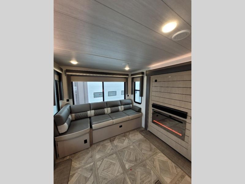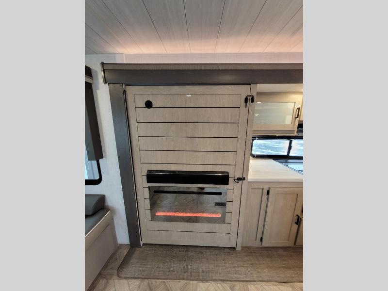 You will be absolutely impressed with this Wildwood travel trailer! The interior is so relaxing and inviting with its two lounge chairs, entertainment center with a fireplace, and rear sofa. There are also two opposing slides, a booth dinette, and a kitchen island. The bedroom is kept spacious by the custom king bed slide, and the large closet will give you room to keep your clothes neatly hung. There is also a separate closet that is prepped for an optional washer/dryer.