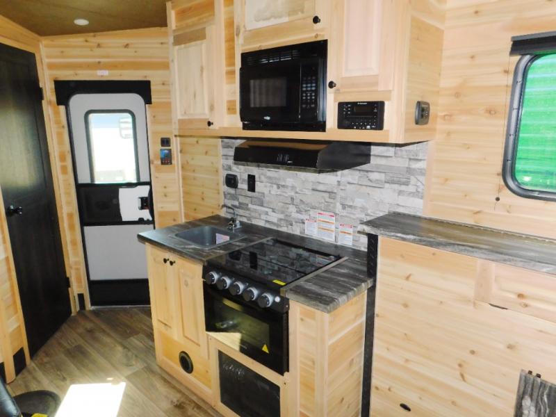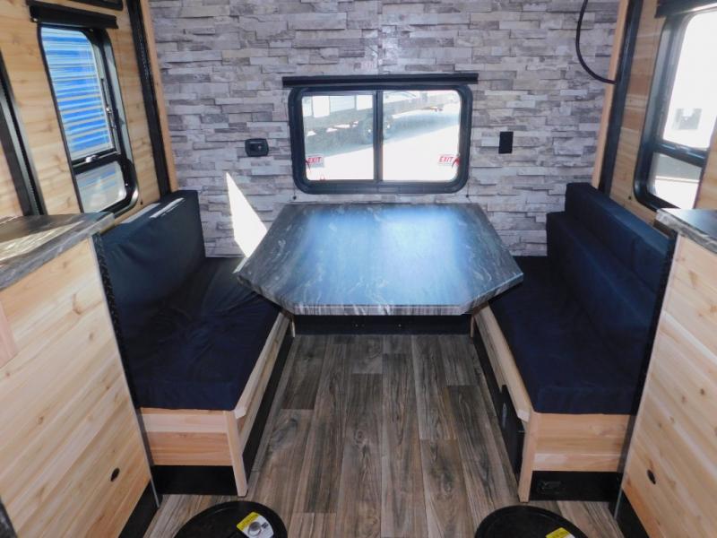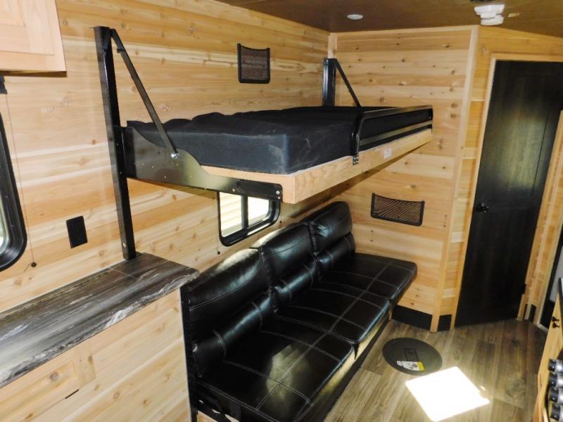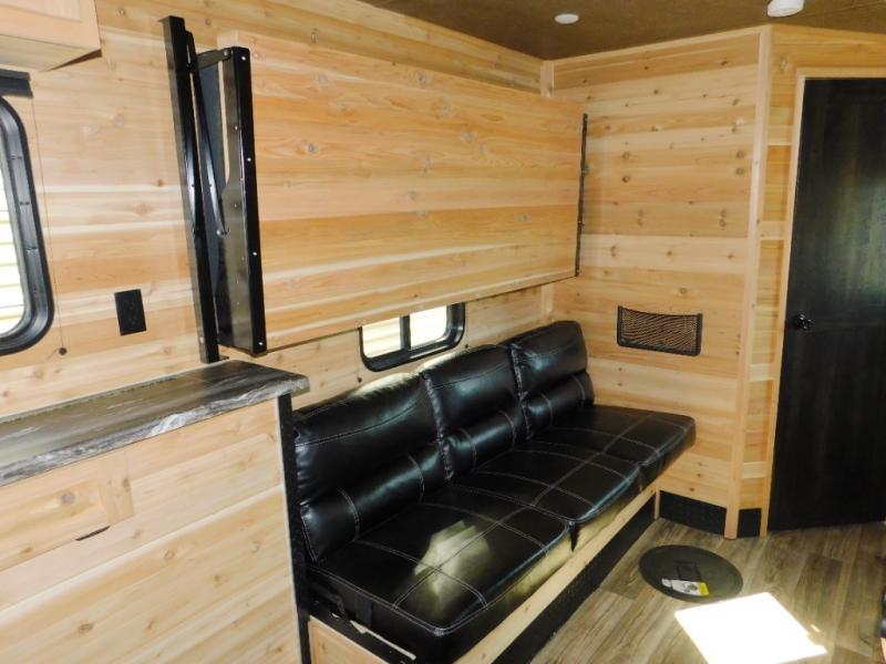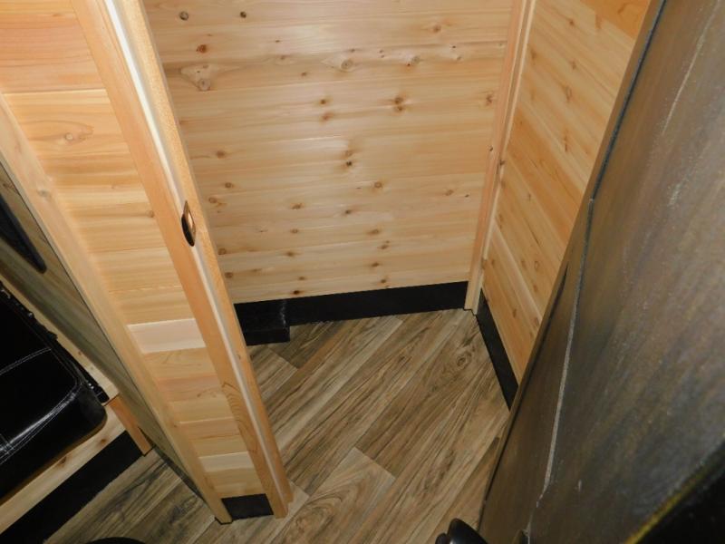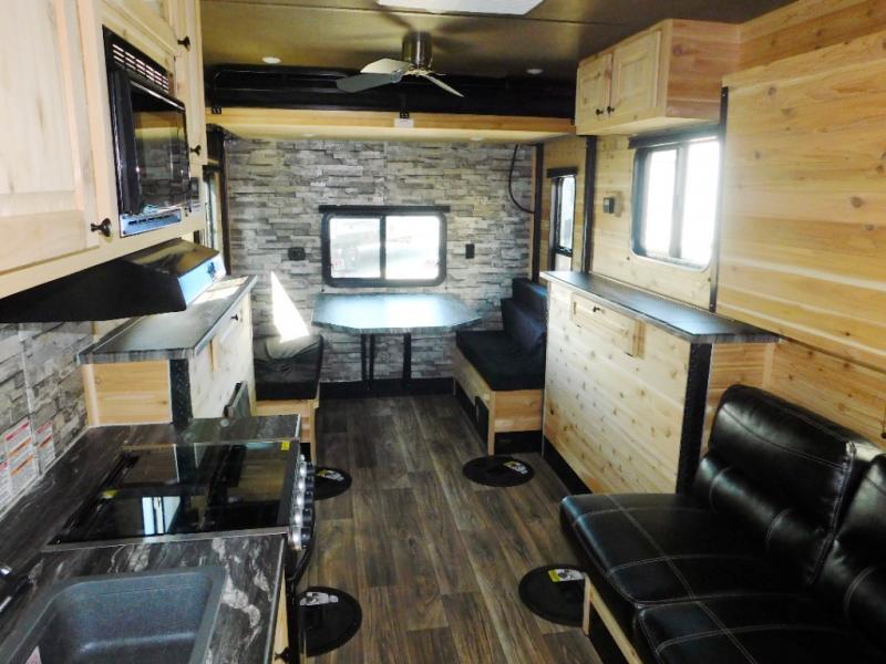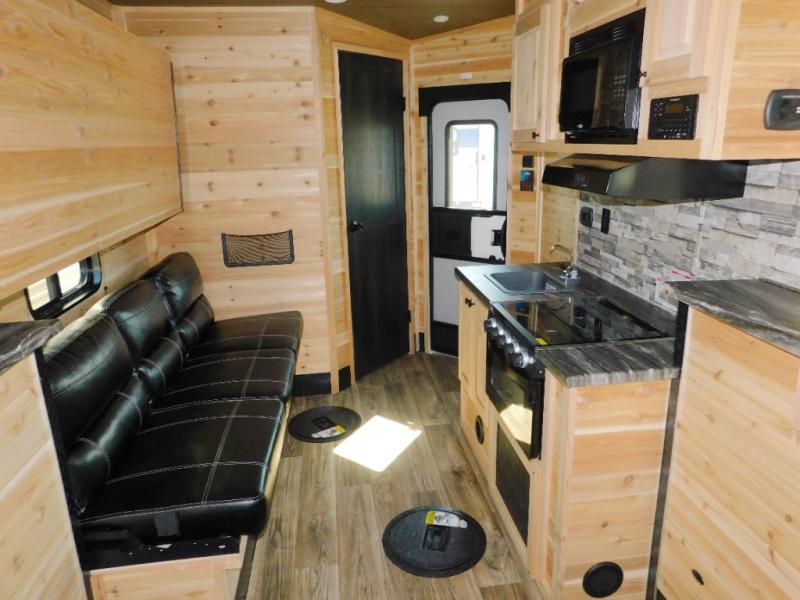 You can use the TV antenna with HDMI hook-ups to watch the optional TV, or you can listen to the AM/FM Bluetooth stereo before you fall asleep on the bunk bed over the dinette. Easily set up the dinette with benches plus the couch to make a cozy sleeping space for your family or friends after a long day of fishing. The self-edge countertop will allow you to have space to prepare and serve meals as well as set your belongings. And you will find upper cabinets as well as a storage space up front for all your things.