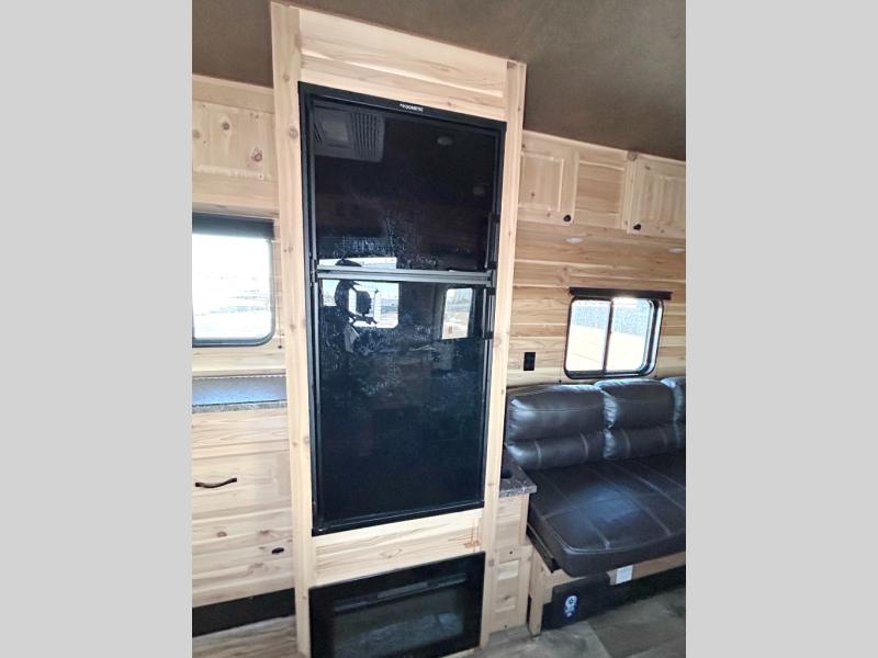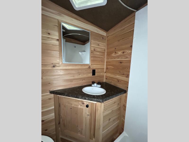 A furnace, an A/C, and a power ceiling vent will allow you to get the inside just right for fishing or sleeping. There are eight ice holes to choose from, a power awning to relax under when the weather is just right, and a full bathroom up front as an added convenience. Someone can cook using the three-burner range with oven, grab drinks from the 4-cu. ft. refrigerator, and everyone can eat at the dinette in the rear or at the fold-down table if you brought along a few chairs. When it's bedtime, the rear lift bunk, the fold-down bunk, and the furniture offer sleeping space for five fishermen. You will find storage throughout as well.