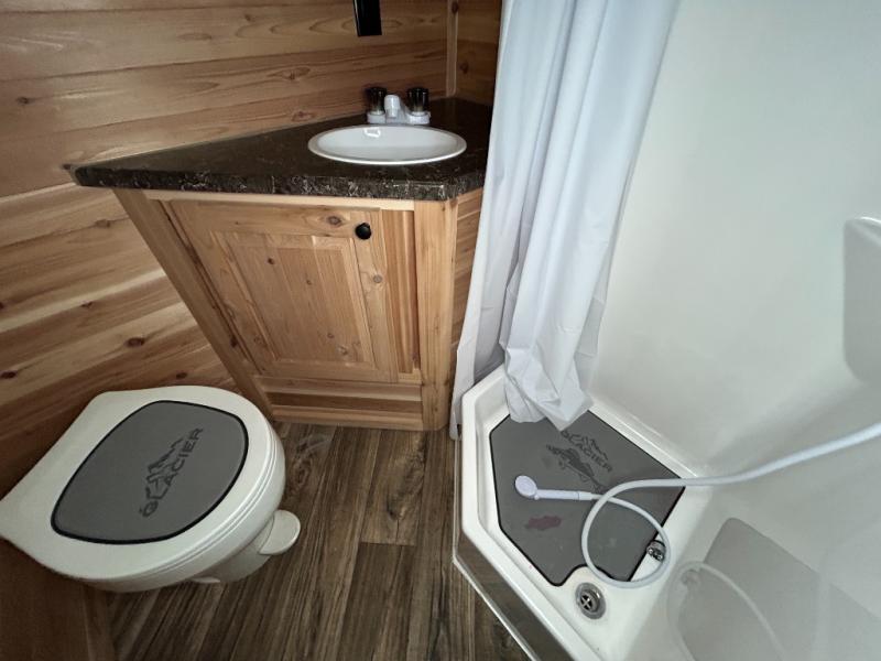 Each RV Explorer ice house by Glacier Ice House comes with a trussed roof for a greater snow load, a voltage meter, black diamond plate wheel wells and front nose, a reflective graphics package, LED speakers, and LED ice hole lights. Inside, you will find a microwave oven, a forced-air furnace, a non-ducted A/C, dual-pane windows, LED interior and exterior lighting, and cedar interior. Choose the model that fits your fishing or camping needs, and experience the ultimate way to play!
