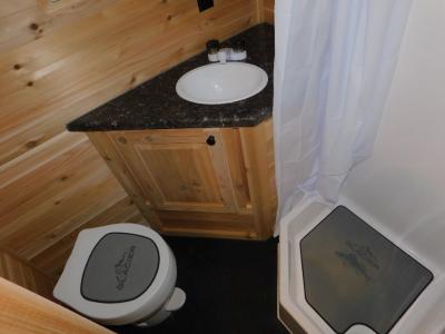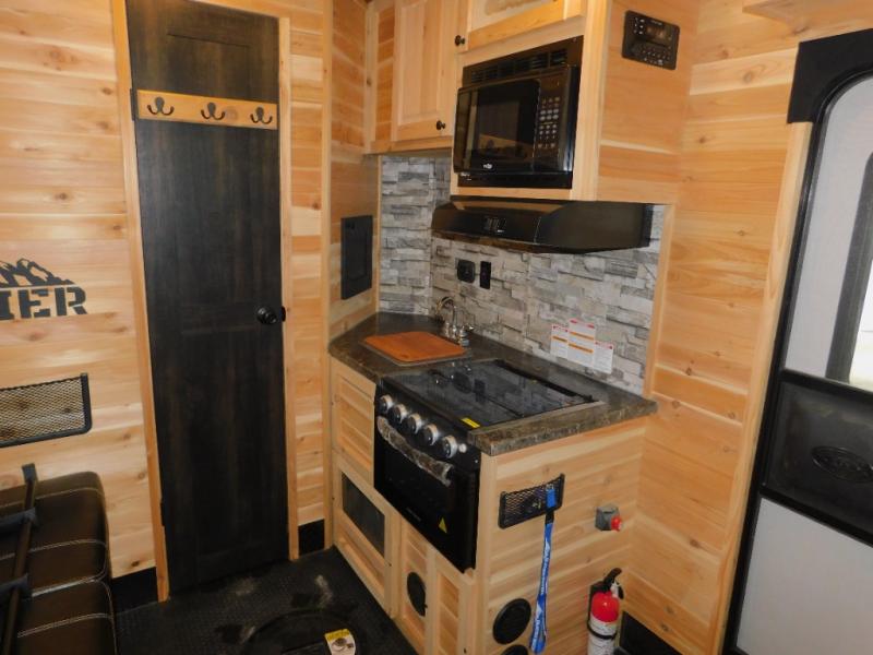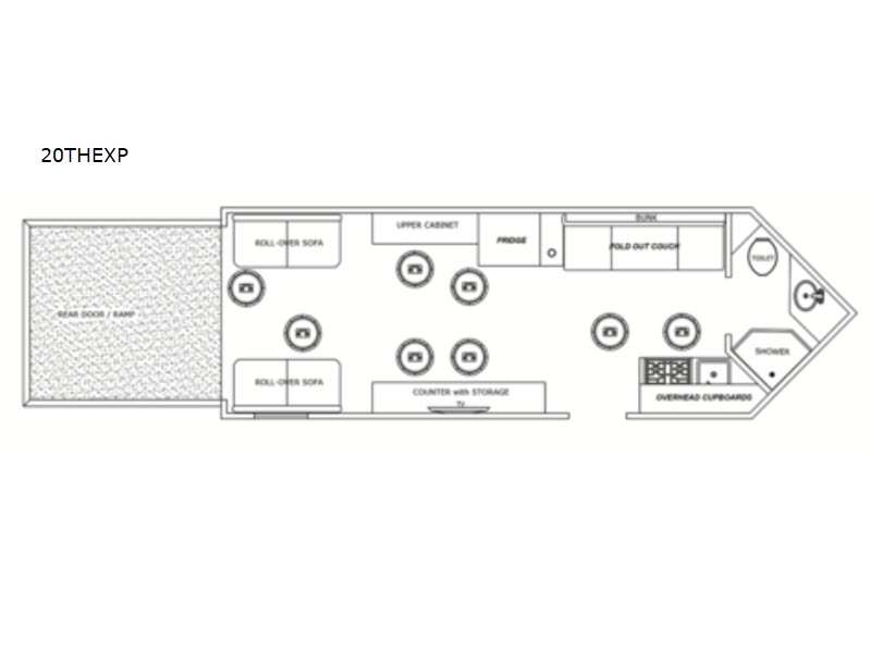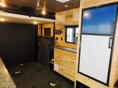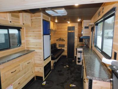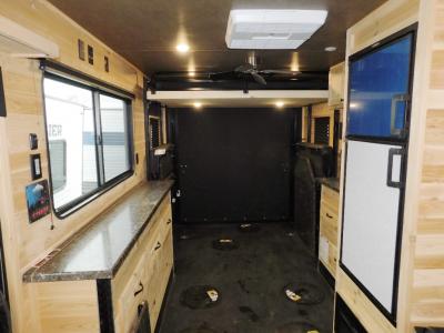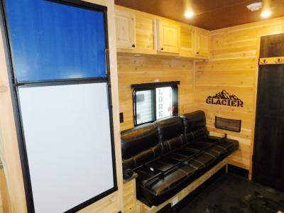 You can easily load up your toys or ATV using the ramp door when the dual opposing sofas are folded up into the wall. Once you have arrived at your camping spot, you can set up and begin fishing from one of the eight ice holes which includes lights for nighttime fishing. You will appreciate the forced-air furnace during the cooler months and the non-ducted A/C when it gets a little too hot inside. The cook can make meals on the three-burner range with oven, store leftovers in the 4-cu. ft. refrigerator, and everyone can dine from one of the sofas or the couch. The front full bathroom will keep you clean after riding your toys, and you will find storage for all your things on the countertops, in overhead cabinets, and inside the bathroom.