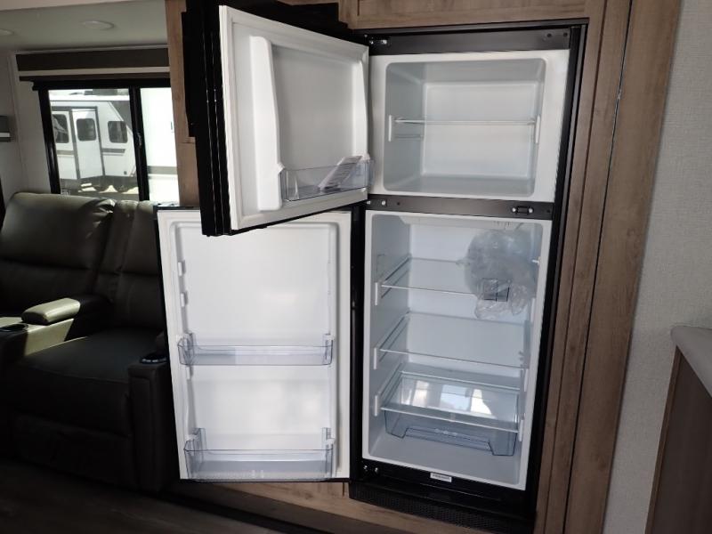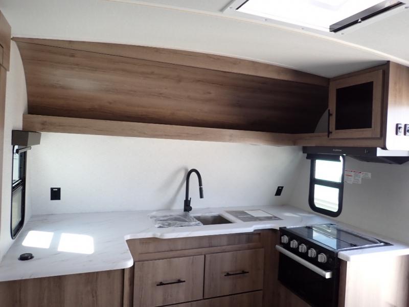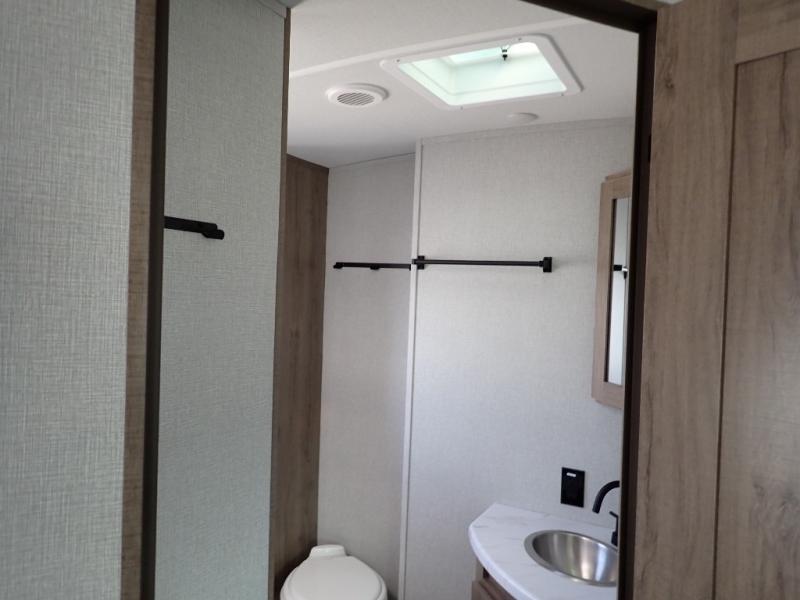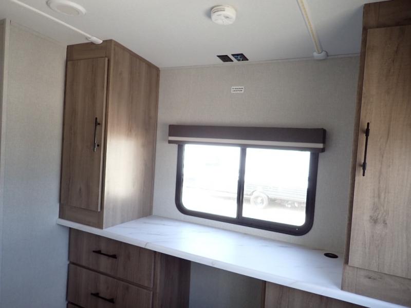 You will love this front kitchen layout couples trailer with dual entry/exit doors with one door leading directly into your full bath! Here you will find a shower, toilet, a corner vanity with sink and overhead cabinet, plus linen storage. The second entry closest to the front leads directly into your spacious front kitchen. Here you will enjoy lots of counter prep space for cooking, a three burner range and oven, plus shelves and storage. Your refrigerator and pantry are within the large slide that also houses theater seating for relaxing, or you could choose the optional tri-fold sofa if you are used to having overnight guests. For you, a rear private bedroom featuring a queen bed slide, a desk and dual wardrobes, plus a space saving sliding door. On the outside, a spray port to rinse off feet or your furry pal, LP quick connect, and a 21' awning to provide added living space to enjoy outdoors!