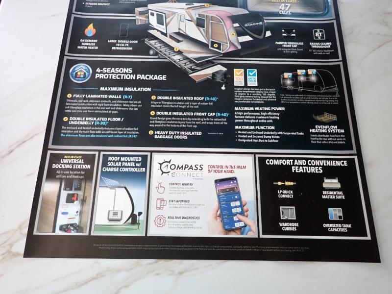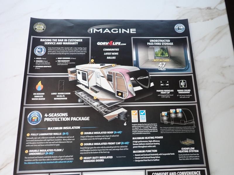 Just imagine leaving the world behind and secluding yourself away with your favorite people in your Grand Design Imagine travel trailer! The Imagine has been designed to enjoy extended season camping and includes a high-capacity furnace, a heated and enclosed underbelly with suspended tanks, a designated heat duct to the subfloor, and a high-density roof insulation with attic vent. You'll have maximum headroom with radius interior ceilings, and large panoramic windows to let in natural lighting. The exclusive drop-frame pass-through storage compartment is going to allow you to bring along lots of equipment, and the universal docking station is an all-in-one location for utilities and hook-ups. You'll also have industry-leading tank capacities so that you can fill and empty your tanks less often.