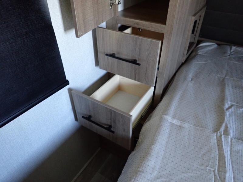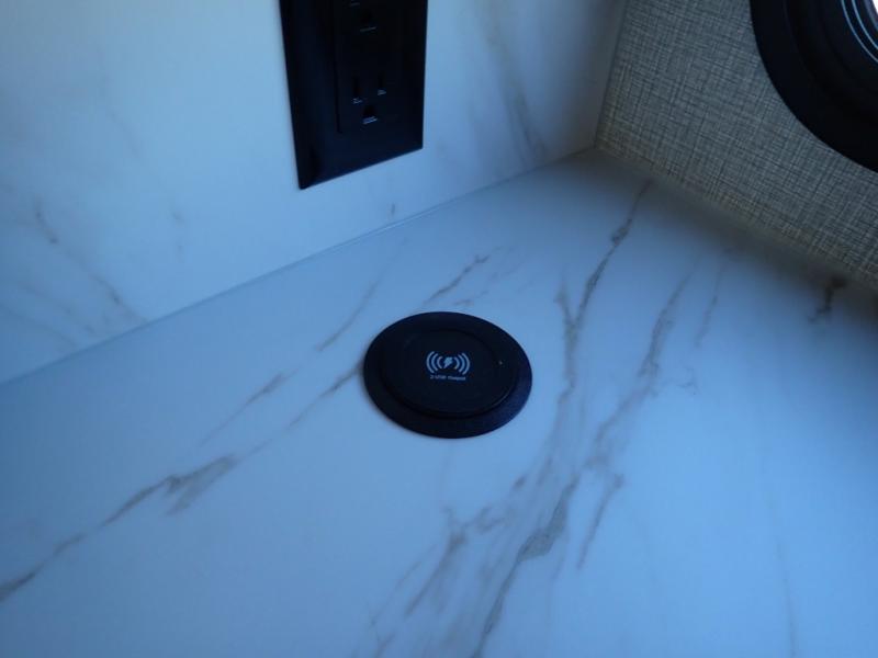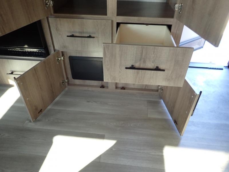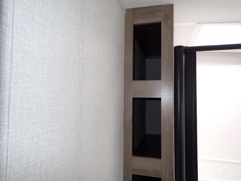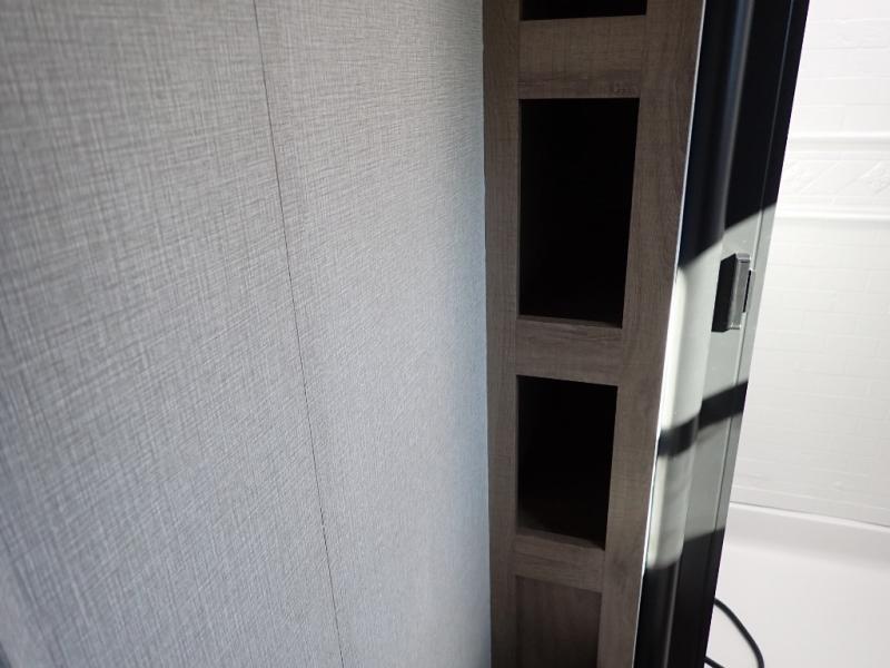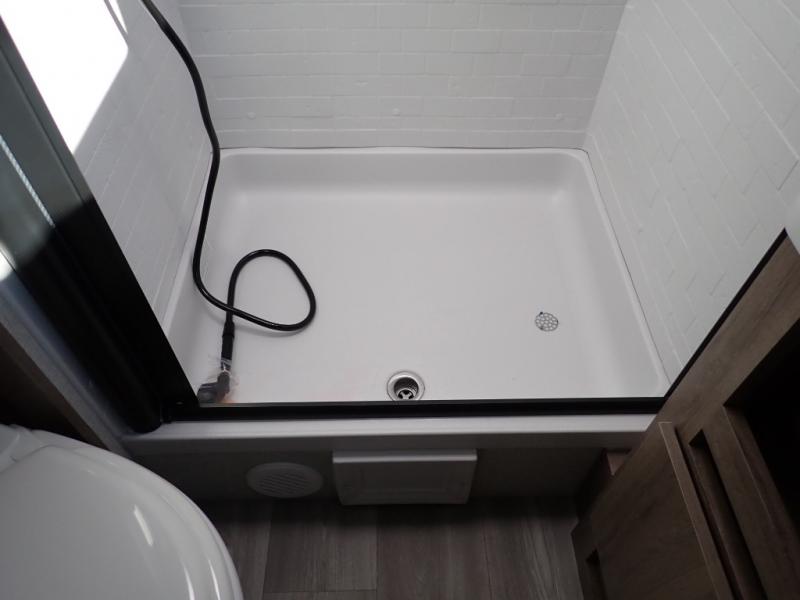 What I liked most: Bunk area area lifts up for additional storage which is very unique. Place for shoes. The bathroom shower surround has a brick molded design look.