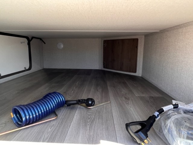 Your small family or group will have a fun time camping in this travel trailer! There is a queen bed below a 40" x 80" flip top bunk above it for comfortable sleeping spaces. You could even transform the booth dinette into an extra sleeping space when you aren't using it to enjoy a meal prepared with the front kitchen. You could even grill up some burgers on the outside griddle. Underneath the queen bed is a storage portal and the exterior has baggage doors to keep all of your gear out of the way. A unique feature on this model is the full bath with a flip-up bath sink that will provide more space when you're getting dressed!