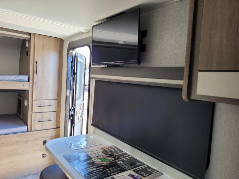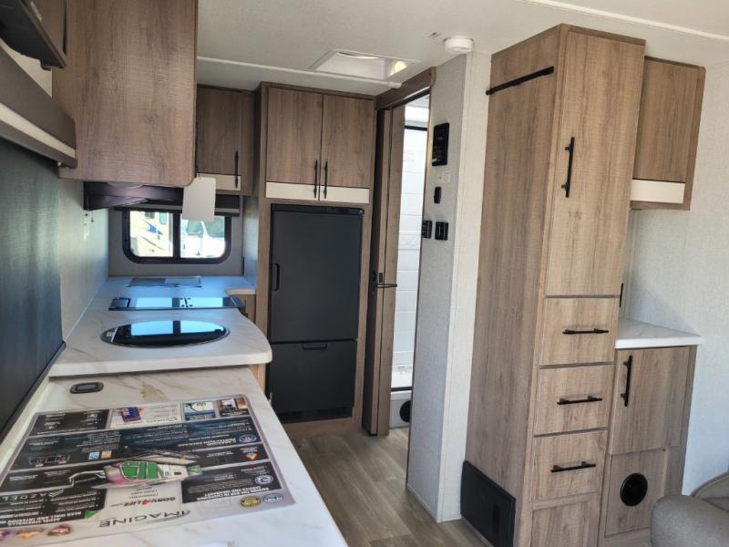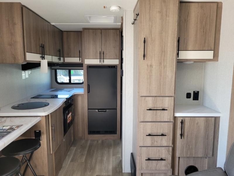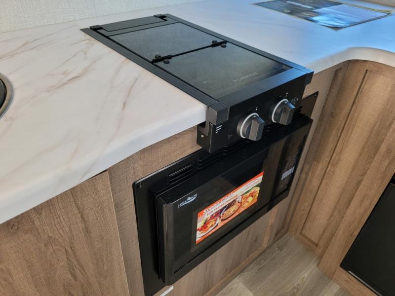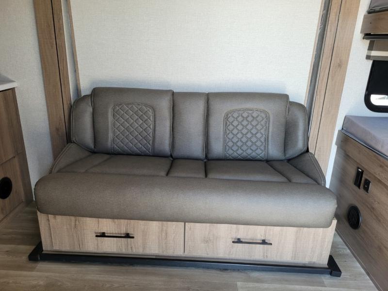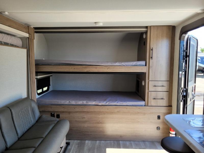 Head to far-off adventures in this lightweight travel trailer that can sleep four each night. There are front bunk beds with pull-down privacy blinds and a wardrobe to keep clothes tidy. You'll enjoy the Murphy bed slide out for seating and sleeping space, and there is also a removable table here and two drawers for storage. The full kitchen includes a two burner cooktop, a convection microwave, plus a 12V refrigerator for food storage. You can dine each day at the bar tabletop with three stools, or take your plate outdoors to sit under the 12' power awning with LED lights.