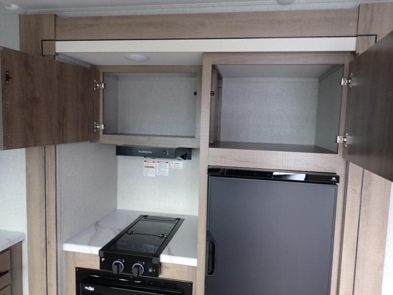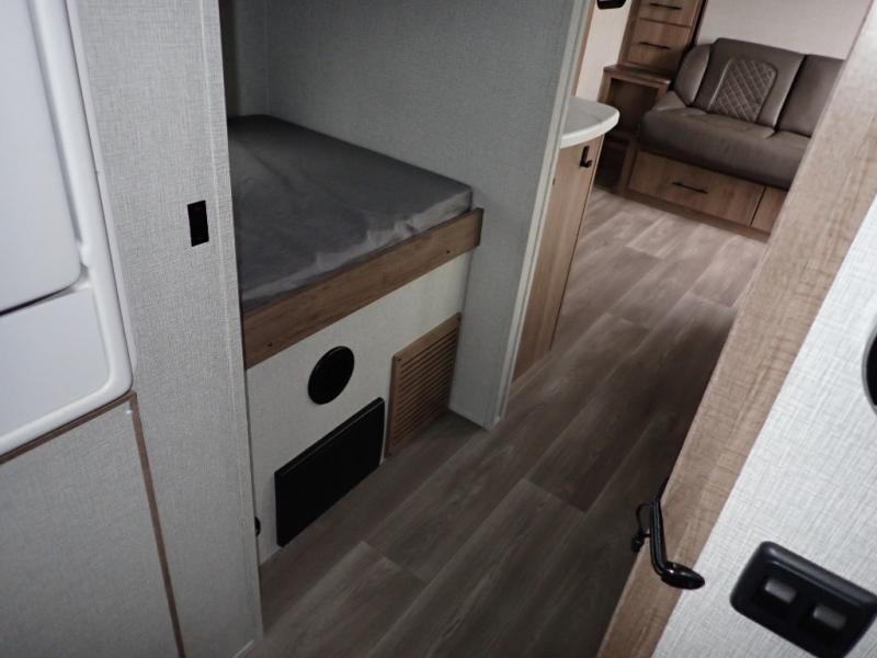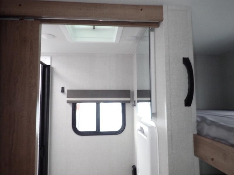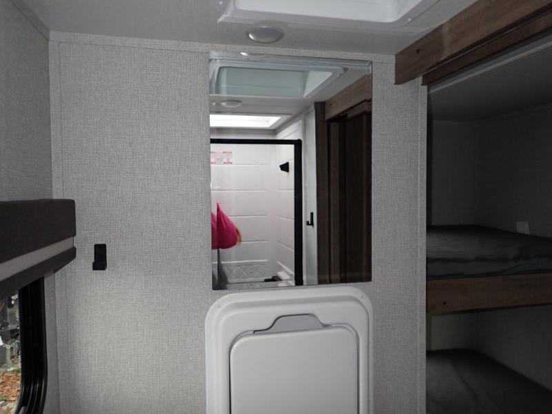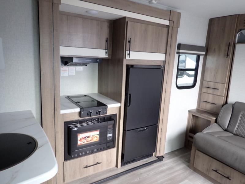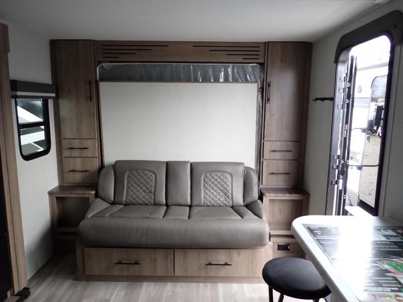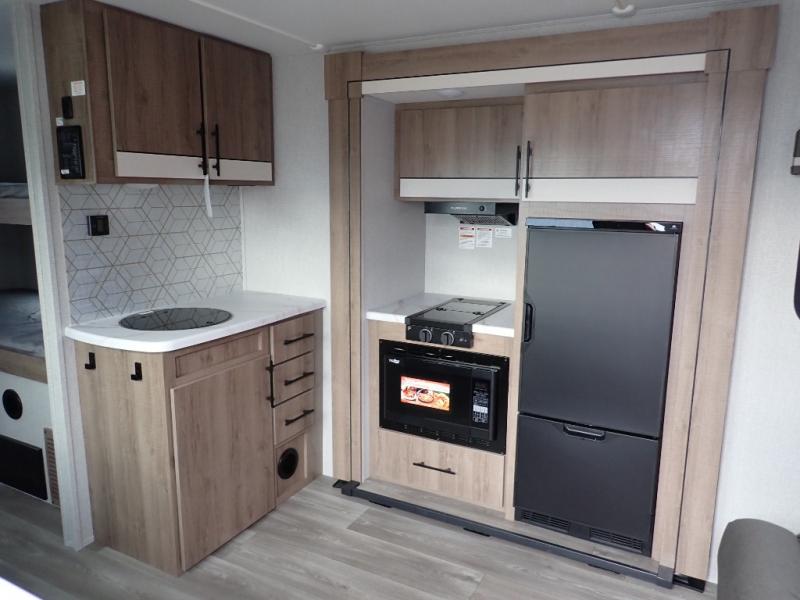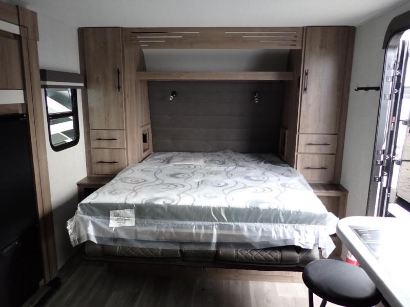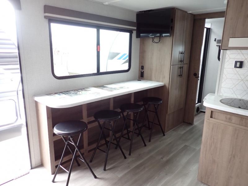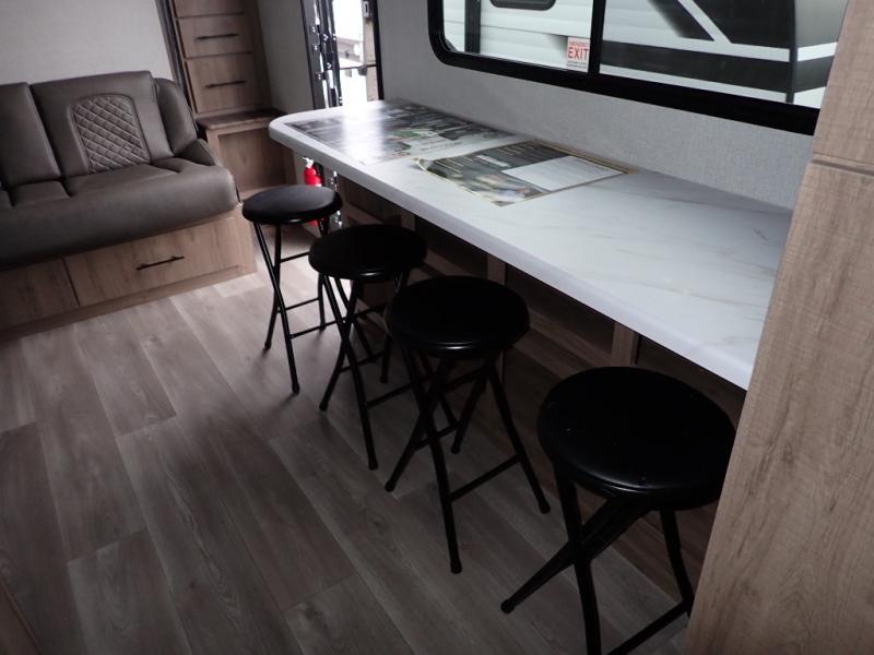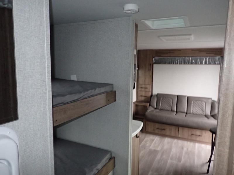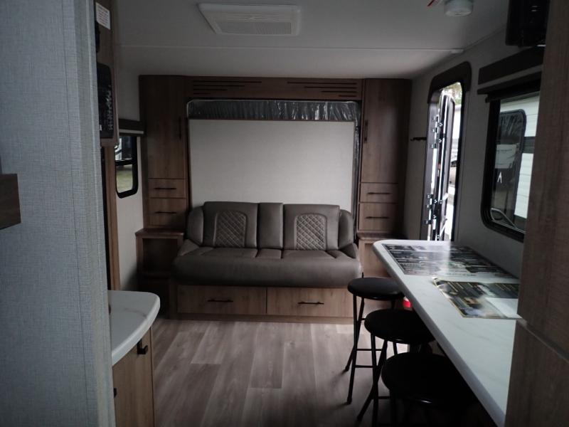 You will feel right at home in this travel trailer! Everyone will have a comfortable place to sleep between the front queen Murphy bed which can transform into a sofa and the 32" x 72" bunk beds. After you have prepared a delicious meal on the two burner cooktop or outside griddle, you can enjoy it at the bar tabletop dinette with four stools for seating. The full bathroom has a walk-in shower with a skylight to let in natural lighting and a flip-up sink to save on space!