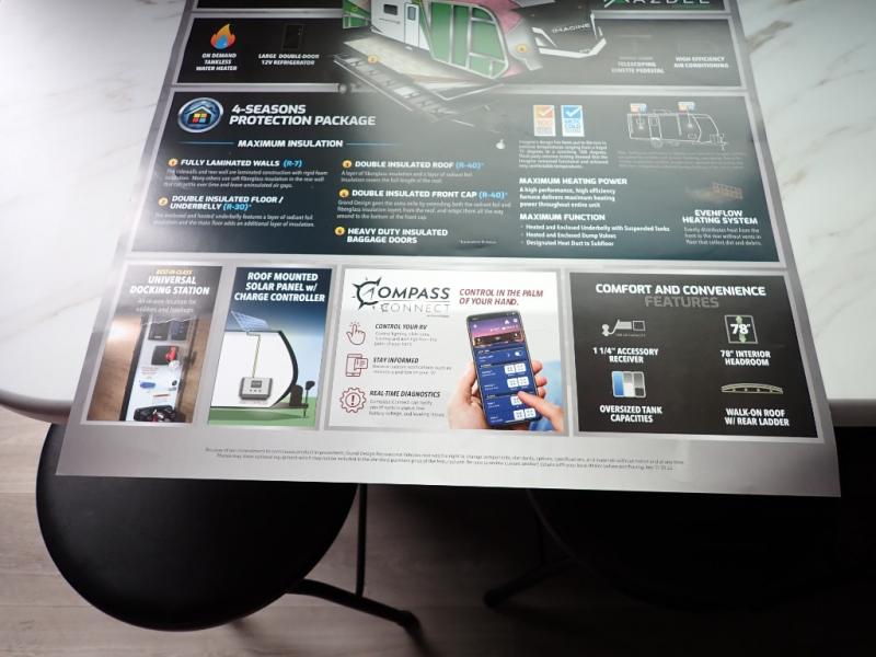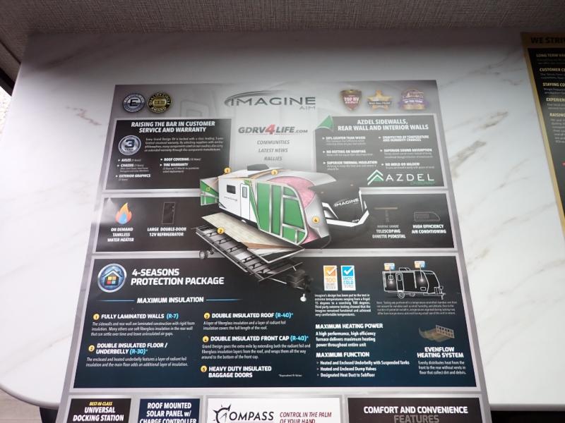 Aim for new destinations in one of these Grand Design Imagine AIM travel trailers! They are constructed to a superior standard with the 4-Seasons Protection Package that features a heated and enclosed underbelly with suspended tanks, a moisture barrier floor enclosure, a double insulated roof and front wall, and more. There is backup camera prep outside, along with a universal docking station, a power tongue jack, and durable Tuff-Ply pass-thru flooring for your camp gear. You are sure to feel at home with residential cabinetry, premium window treatments, residential countertops, and a spacious walk-in shower to name a few comforts. The on-demand tankless water heater is a feature you won't want to camp without and the hi-definition LED TV will ensure you'll never go bored on rainy days. Each model also comes with four AIM packages; the Peace of Mind Package, The Ultimate Power Package, The 4-Season Protection Package, and the Solar Package!