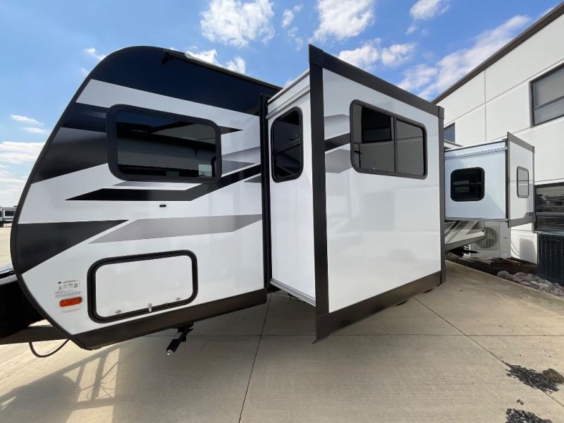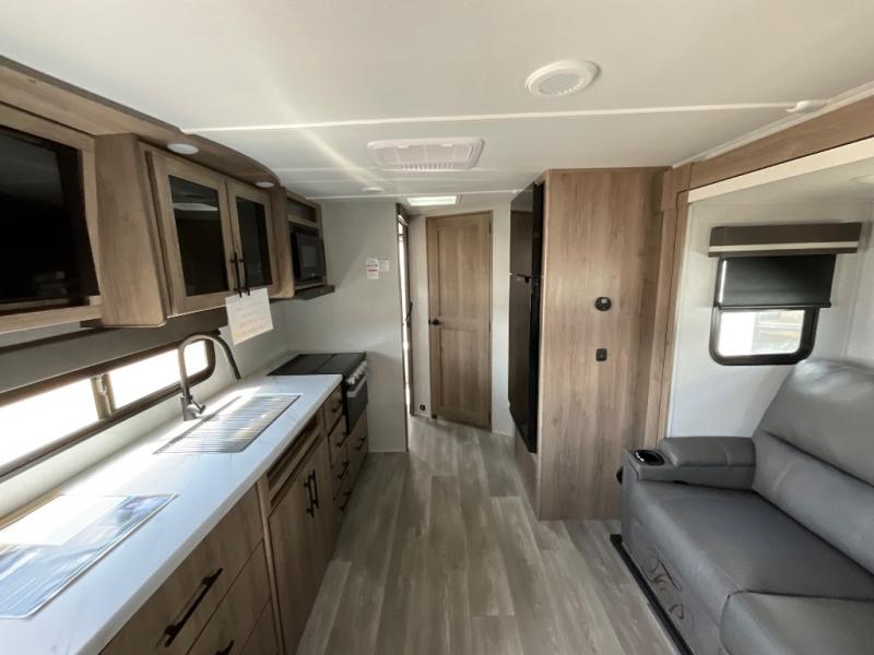 Start camping the right way with this travel trailer! The rear corner bedroom can sleep two people on the queen-size bed slide across from a mirror and a hutch alongside another wall for your clothes. It is also conveniently next to the rear corner bathroom which has a 27" x 36" walk-in shower, a linen closet, hooks for your towels, and even one of the dual entry doors to the unit. The 52" x 93" U-shaped dinette can transform from a dining location into a sleeping location, and the theater seating slide is right across from the high definition LED TV for a comfortable movie night. The fully equipped kitchen has everything you need to keep your bellies full of delicious meals, and the unobstructed exterior pass-through storage area has plenty of room for your outdoor gear!