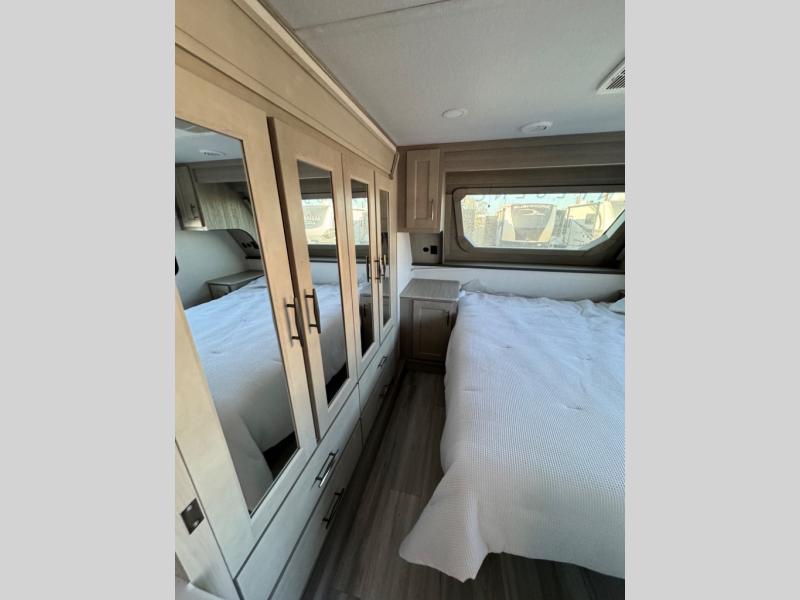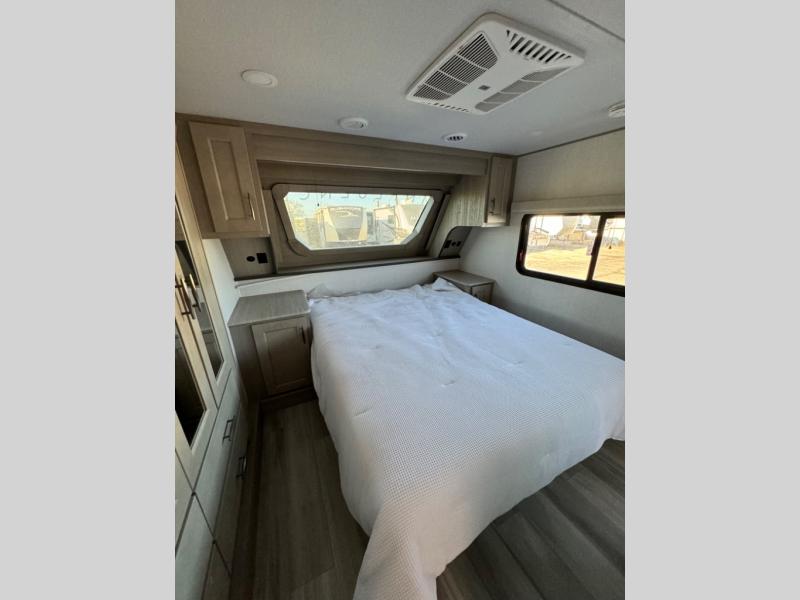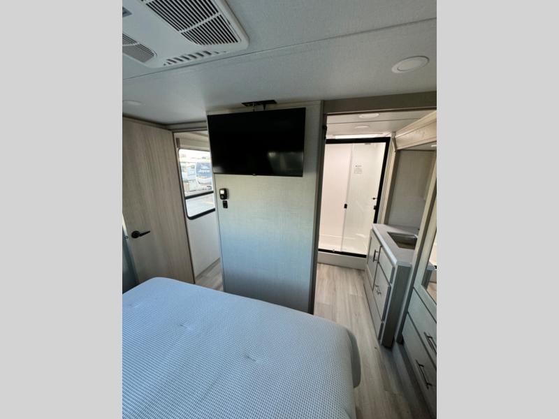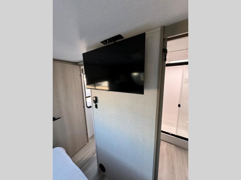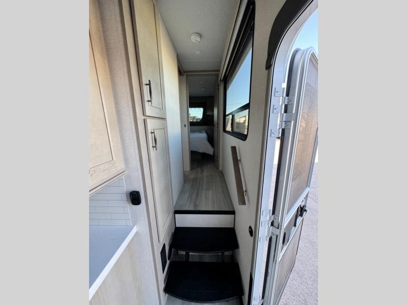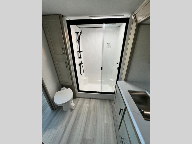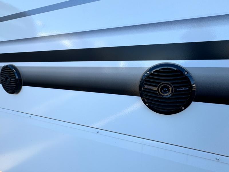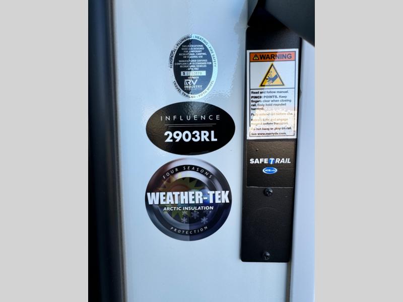 Any Grand Design Influence fifth wheel features five-sided aluminum cage construction with a walk-on roof and a fully enclosed underbelly with heated tanks and storage for all weather camping. For peace of mind, the MORryde CRE3000 Suspension system and ABS braking system will provide safe and smooth towing, and the 101" widebody construction offers all the room you need and that is before multiple slides are fully engaged. You will appreciate the keyed alike locks, slam-latch baggage doors with magnetic door catches, exterior security light, and solid surface entry steps. On the inside, Congoleum flooring, premium roller shades for privacy, a hallway handrail for safety, and nightstands with USB ports to keep all of your electronics fully charged. You will also love the On Demand tankless water heater when showering, plus the added heat and ambiance from an electric fireplace, and so much more!