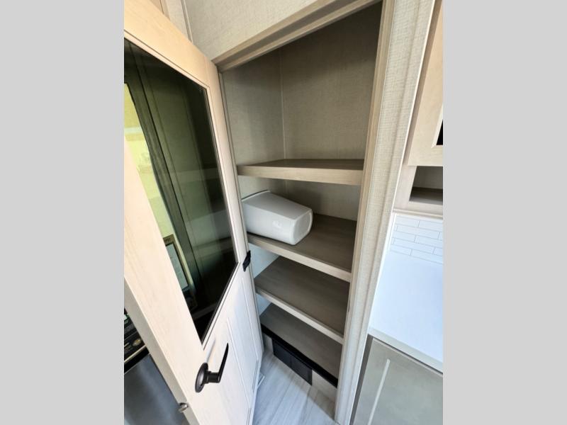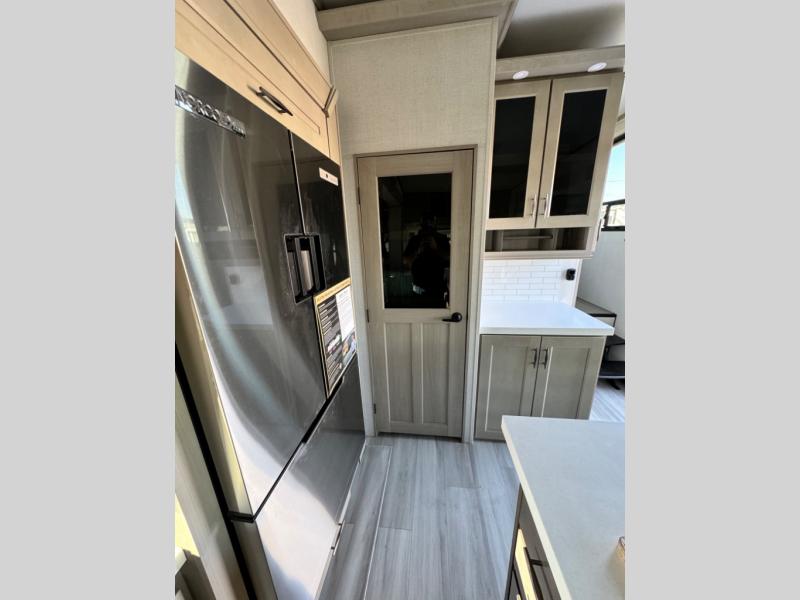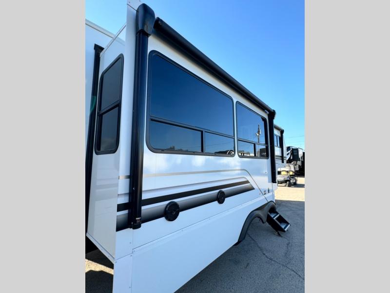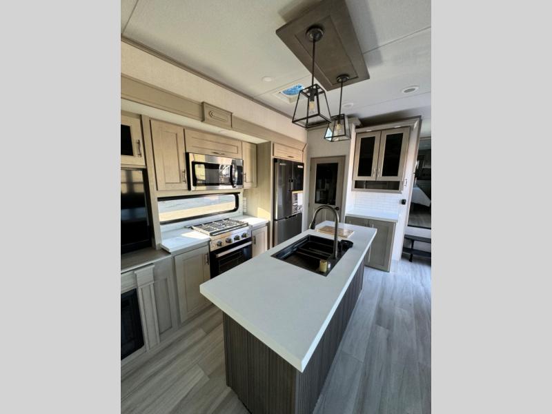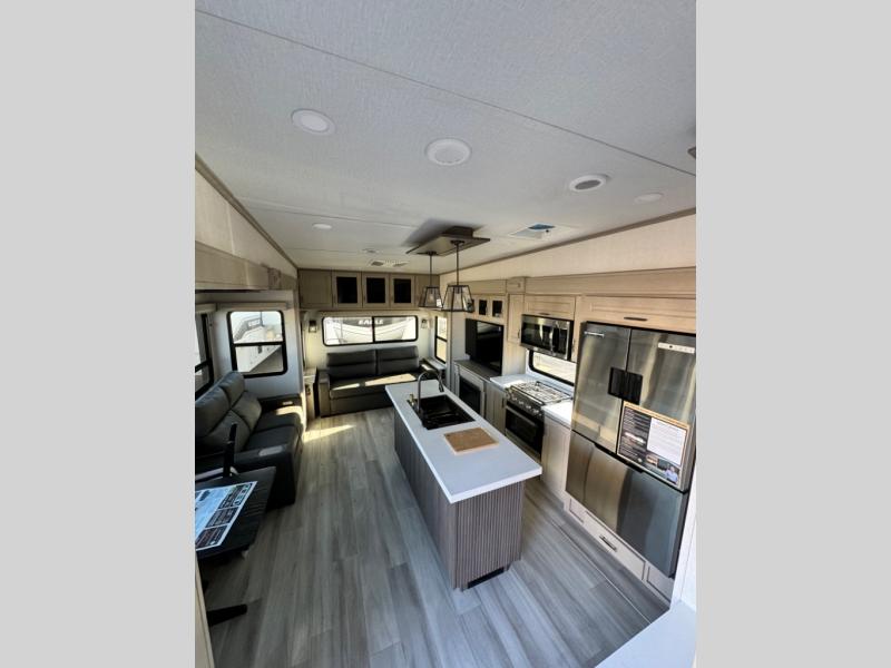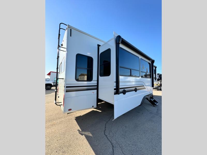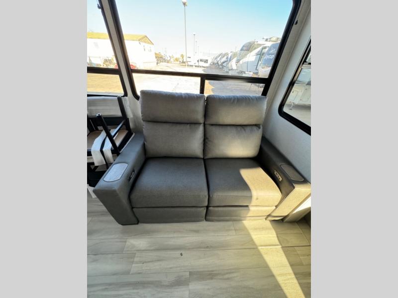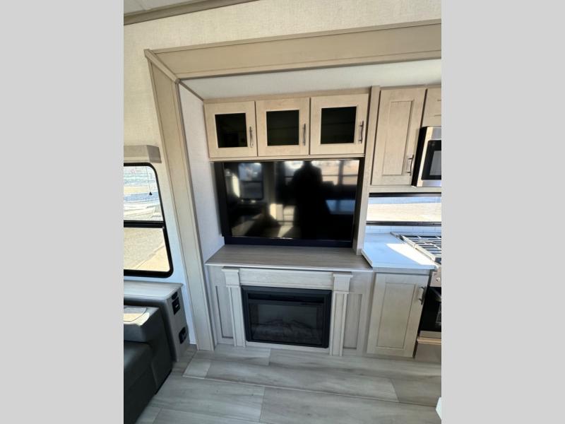 You'll feel right at home in this spacious fifth wheel with triple slides, a front master bedroom, and a kitchen island with extra counter space. The theatre seating is right across from the entertainment center which includes a 40" TV and fireplace, and there is a rear tri-fold sofa if you have any guests staying over. This model includes a hutch in the kitchen with cabinets above to store you nice dishes, plus there is a large pantry with washer and dryer prep if you plan to go full-time. Head to the dual entry bath that includes a linen closet and a spacious shower with a skylight, and check out the front master bedroom with its queen bed, and slide out wardrobe. You can choose the optional king bed if you enjoy a bit more room in bed!