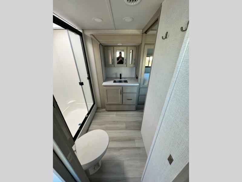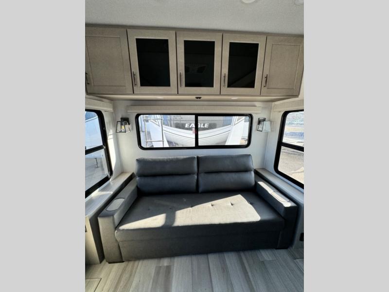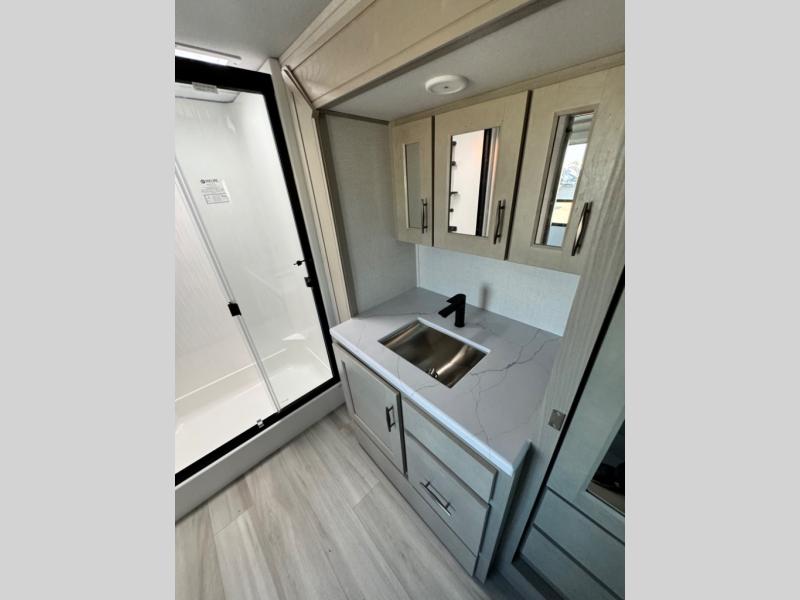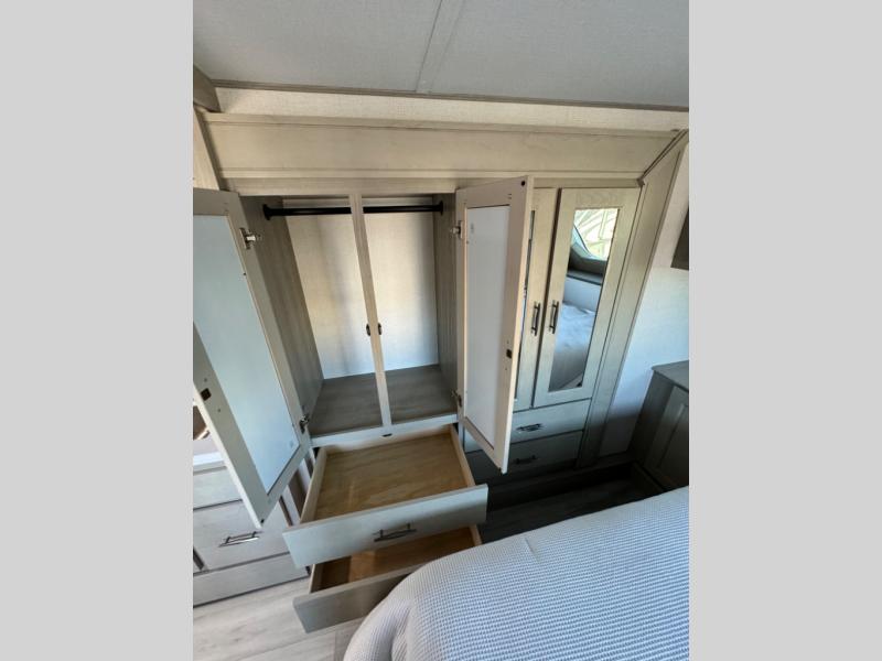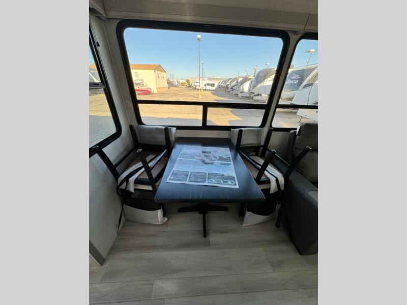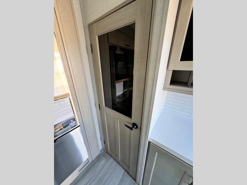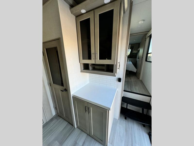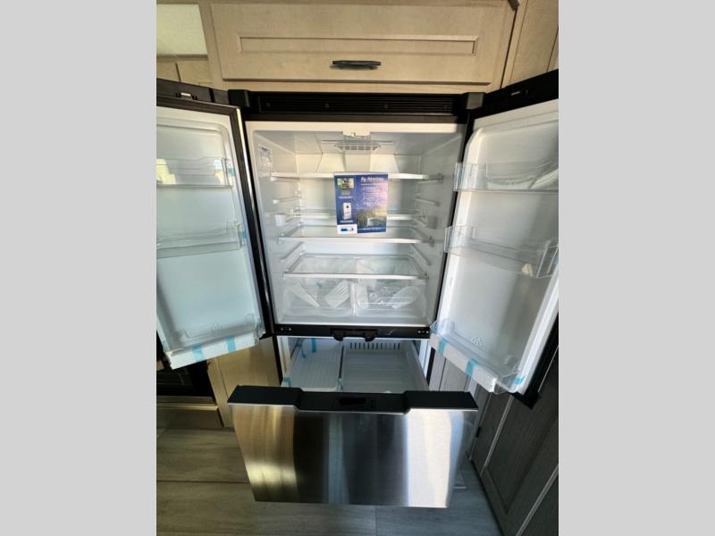 You'll feel right at home in this spacious fifth wheel with triple slides, a front master bedroom, and a kitchen island with extra counter space. The theatre seating is right across from the entertainment center which includes a 40" TV and fireplace, and there is a rear tri-fold sofa if you have any guests staying over. This model includes a hutch in the kitchen with cabinets above to store you nice dishes, plus there is a large pantry with washer and dryer prep if you plan to go full-time. Head to the dual entry bath that includes a linen closet and a spacious shower with a skylight, and check out the front master bedroom with its queen bed, and slide out wardrobe. You can choose the optional king bed if you enjoy a bit more room in bed!