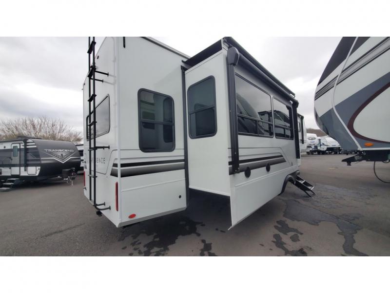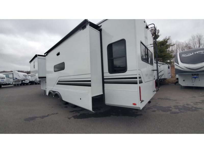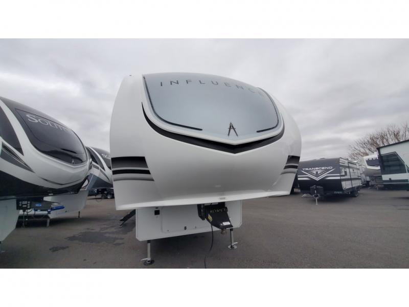 Any Grand Design Influence fifth wheel features five-sided aluminum cage construction with a walk-on roof and a fully enclosed underbelly with heated tanks and storage for all weather camping. For peace of mind, the MORryde CRE3000 Suspension system and ABS braking system will provide safe and smooth towing, and the 101" widebody construction offers all the room you need and that is before multiple slides are fully engaged. You will appreciate the keyed alike locks, slam-latch baggage doors with magnetic door catches, exterior security light, and solid surface entry steps. On the inside, Congoleum flooring, premium roller shades for privacy, a hallway handrail for safety, and nightstands with USB ports to keep all of your electronics fully charged. You will also love the On Demand tankless water heater when showering, plus the added heat and ambiance from an electric fireplace, and so much more!
