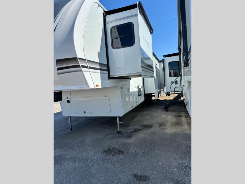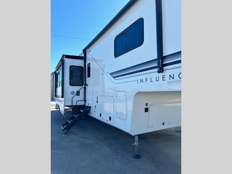 Any Grand Design Influence fifth wheel features five-sided aluminum cage construction with a walk-on roof and a fully enclosed underbelly with heated tanks and storage for all weather camping. For peace of mind, the MORryde CRE3000 Suspension system and ABS braking system will provide safe and smooth towing, and the 101" widebody construction offers all the room you need and that is before multiple slides are fully engaged. You will appreciate the keyed alike locks, slam-latch baggage doors with magnetic door catches, exterior security light, and solid surface entry steps. On the inside, Congoleum flooring, premium roller shades for privacy, a hallway handrail for safety, and nightstands with USB ports to keep all of your electronics fully charged. You will also love the On Demand tankless water heater when showering, plus the added heat and ambiance from an electric fireplace, and so much more!