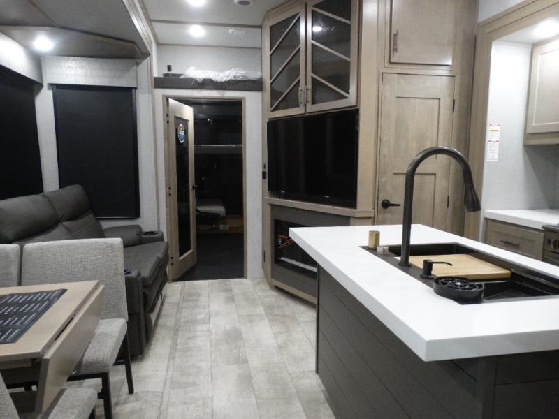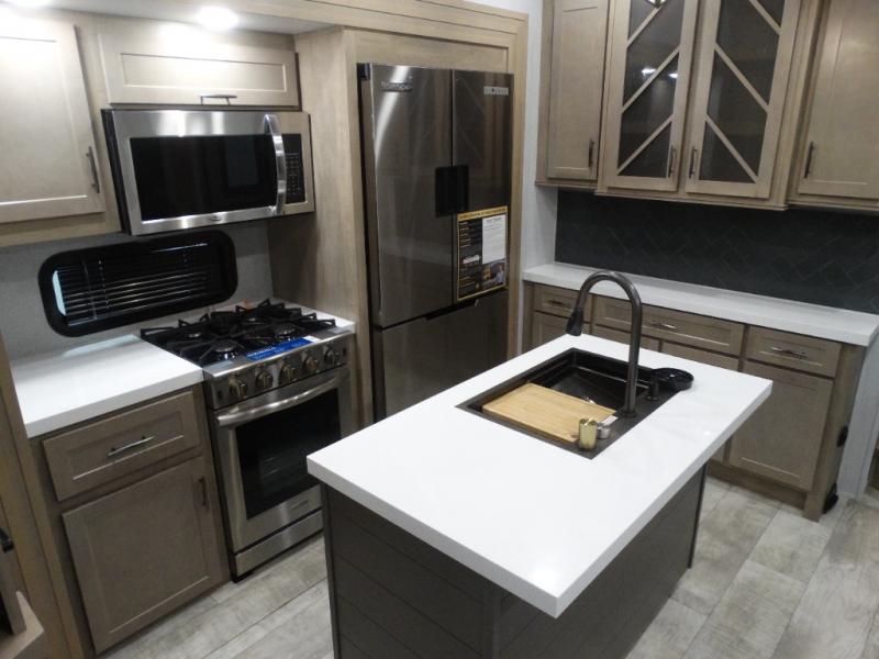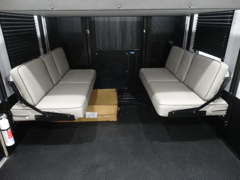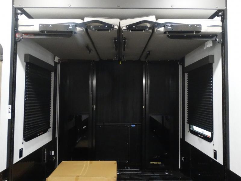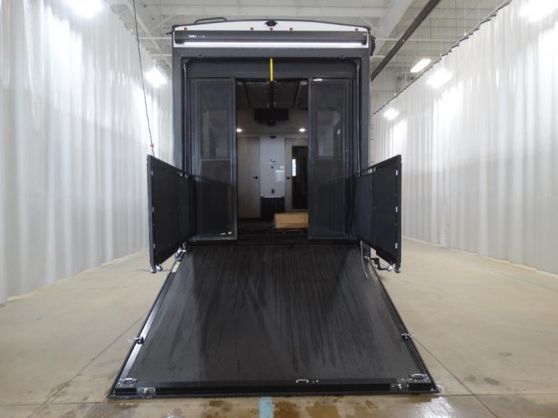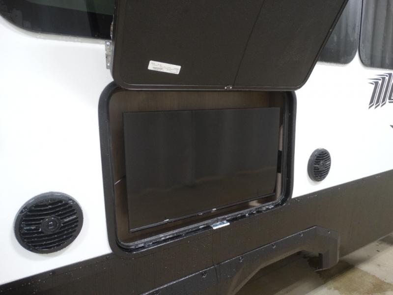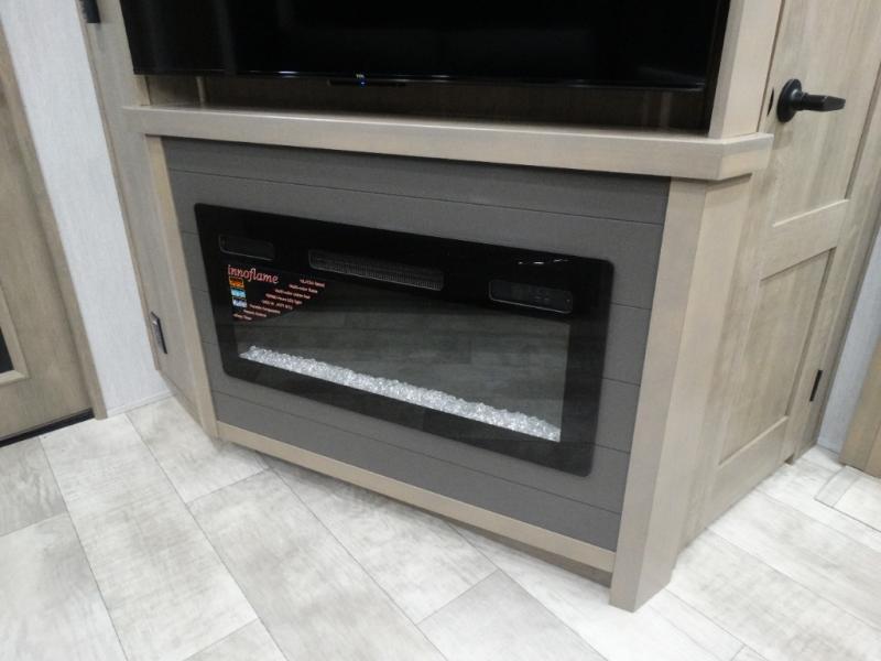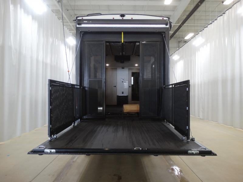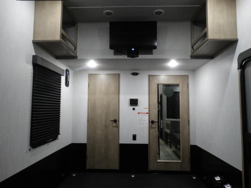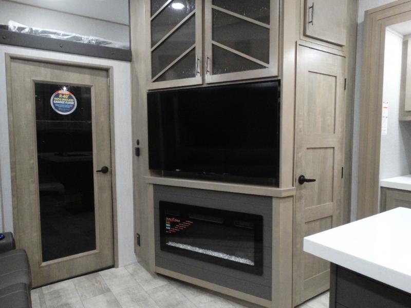 Load up your toys, your clothes and food and start your adventure as you smoothing tow this fifth wheel to your campsite. You will enjoy the Fast Ramp rear ramp door, the Ram-Air garage vents on both sides, and the 2,500 lb. rated flush-mount tie-downs to keep your toys secure. You will surely appreciate the full bathroom and LED TV, plus the Happi-Jac rollover sofas/table with a top bed. The main area provides a living and kitchen area with a 49" LED TV and a fireplace, theatre seating and a free standing dinette, plus full kitchen amenities. There is also a new Smart Sink with a removable cutting board, produce strainer and glass rinser you are sure to love. Head up front to use the full bathroom with a one-piece fiberglass shower with a glass door and teak seat, and fall quickly to sleep on your own king bed in the front bedroom.