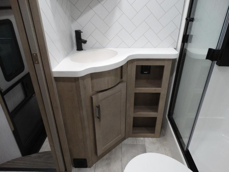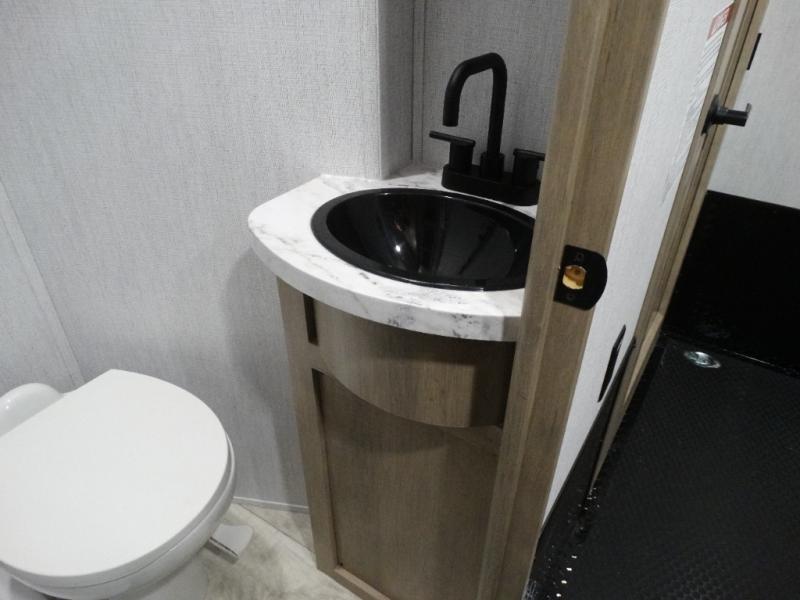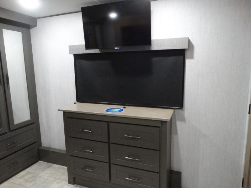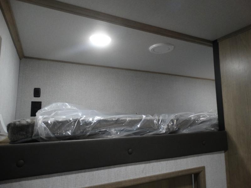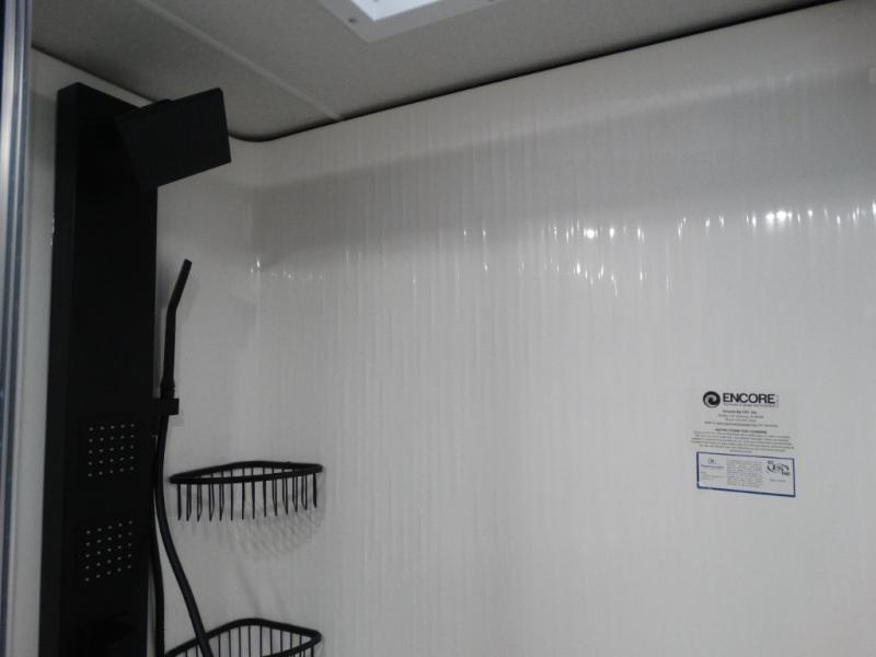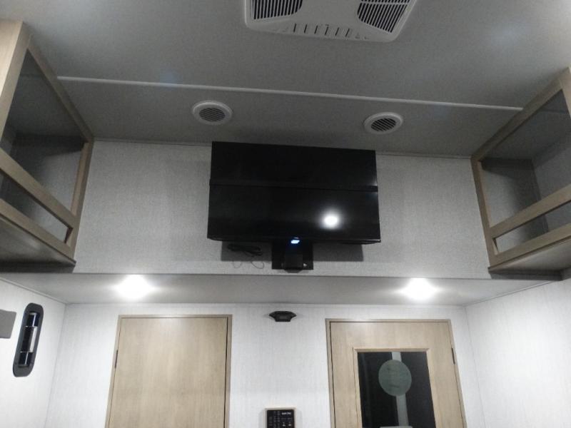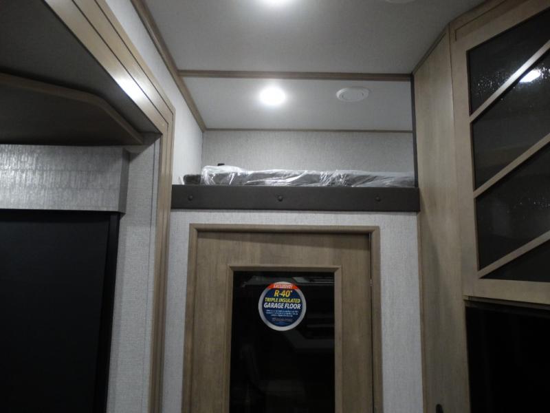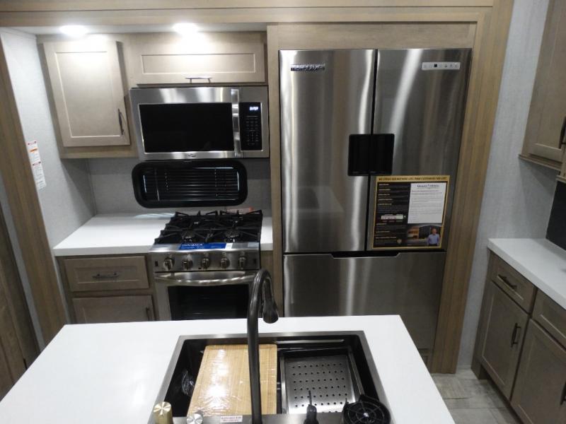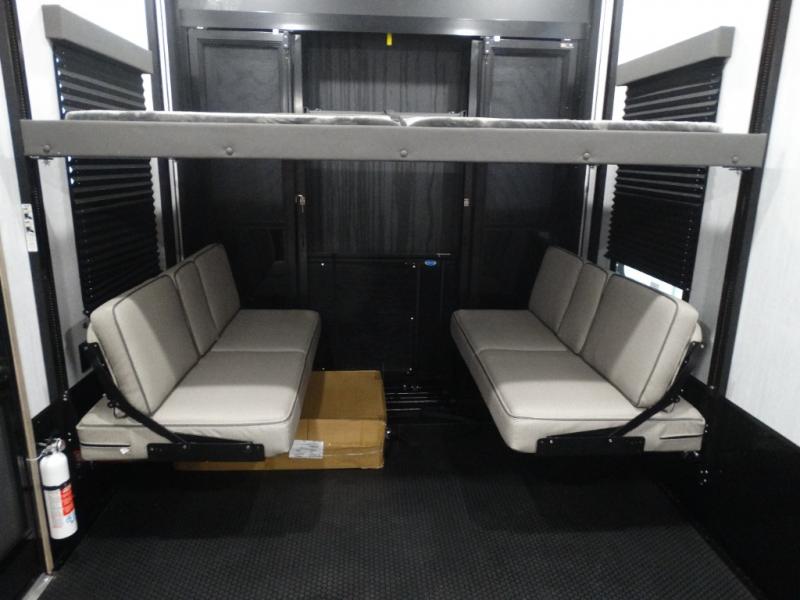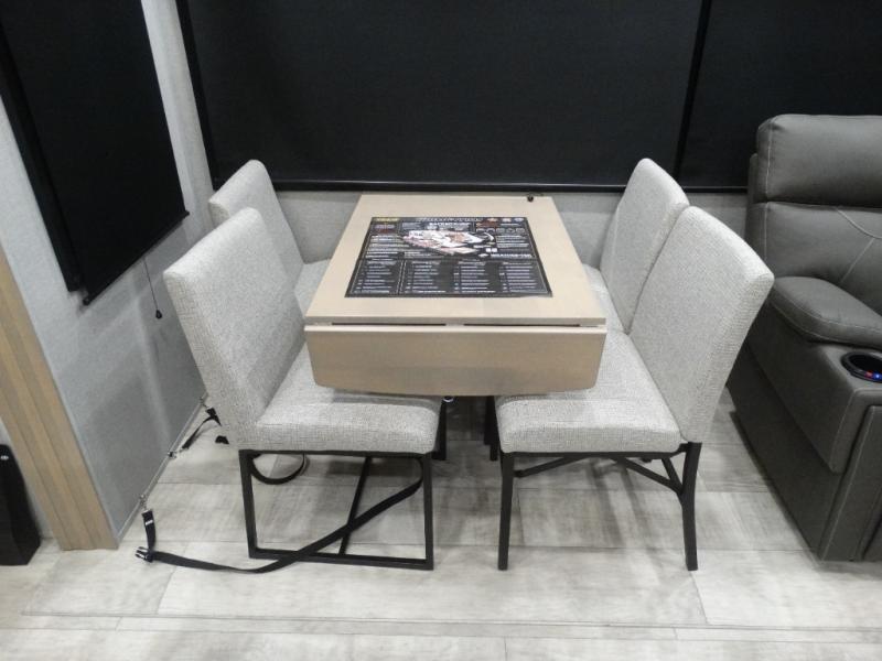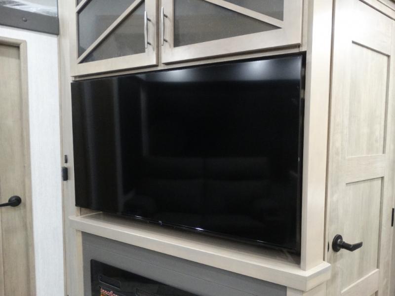 Load up your toys, your clothes and food and start your adventure as you smoothing tow this fifth wheel to your campsite. You will enjoy the Fast Ramp rear ramp door, the Ram-Air garage vents on both sides, and the 2,500 lb. rated flush-mount tie-downs to keep your toys secure. You will surely appreciate the full bathroom and LED TV, plus the Happi-Jac rollover sofas/table with a top bed. The main area provides a living and kitchen area with a 49" LED TV and a fireplace, theatre seating and a free standing dinette, plus full kitchen amenities. There is also a new Smart Sink with a removable cutting board, produce strainer and glass rinser you are sure to love. Head up front to use the full bathroom with a one-piece fiberglass shower with a glass door and teak seat, and fall quickly to sleep on your own king bed in the front bedroom.
