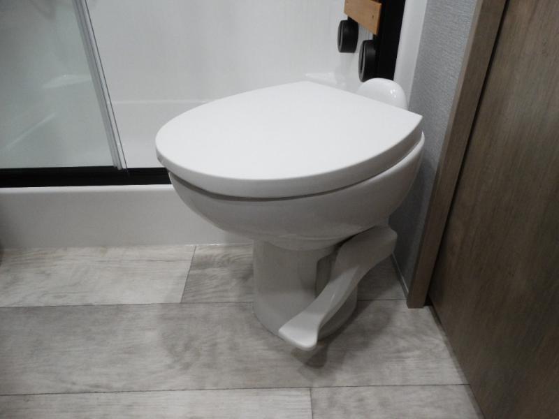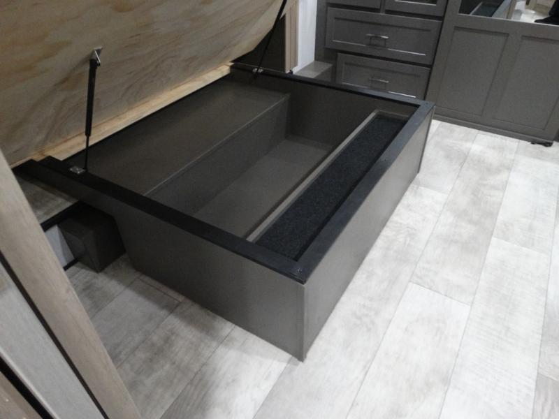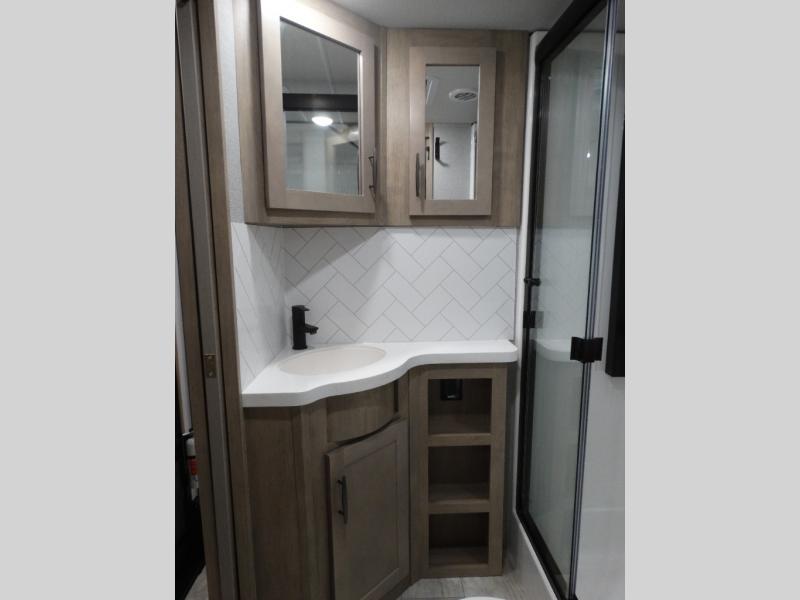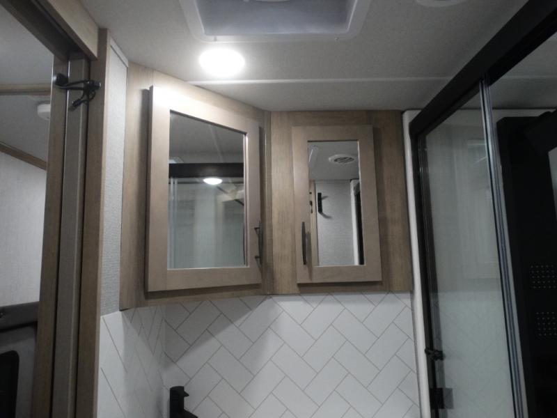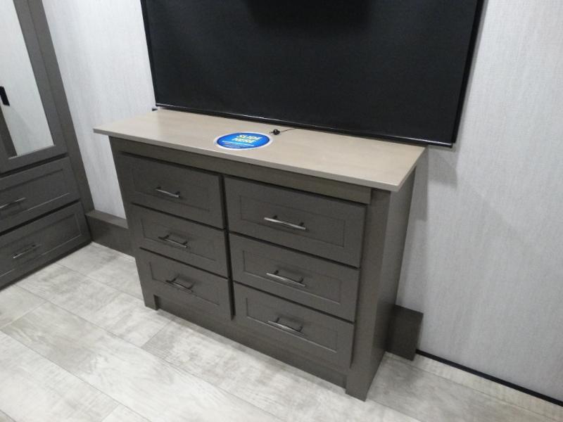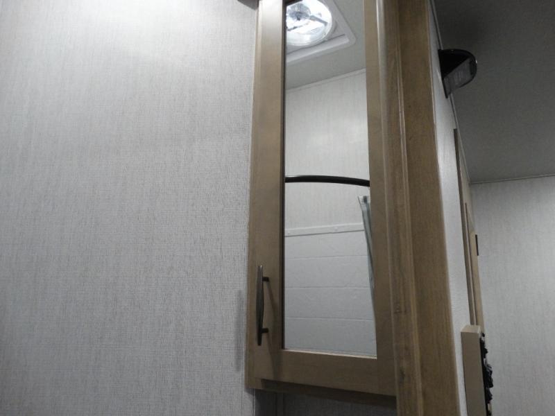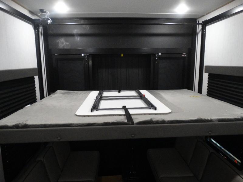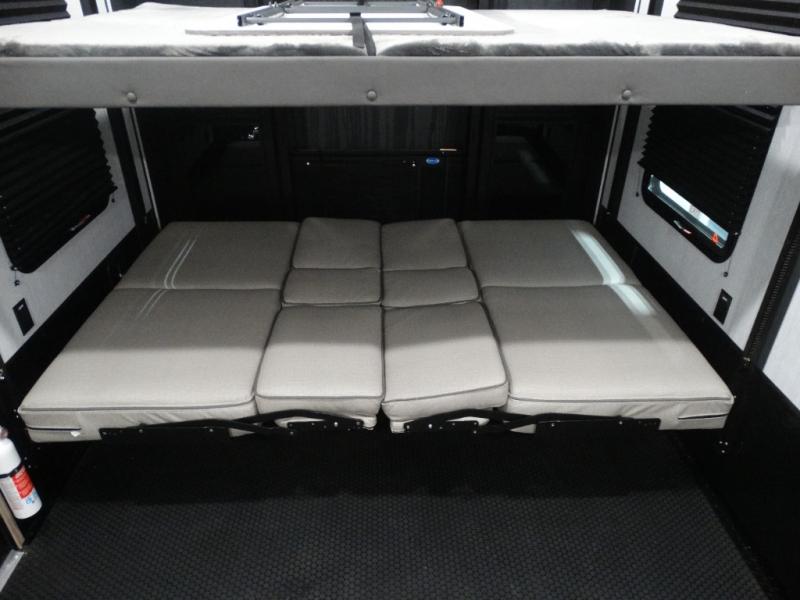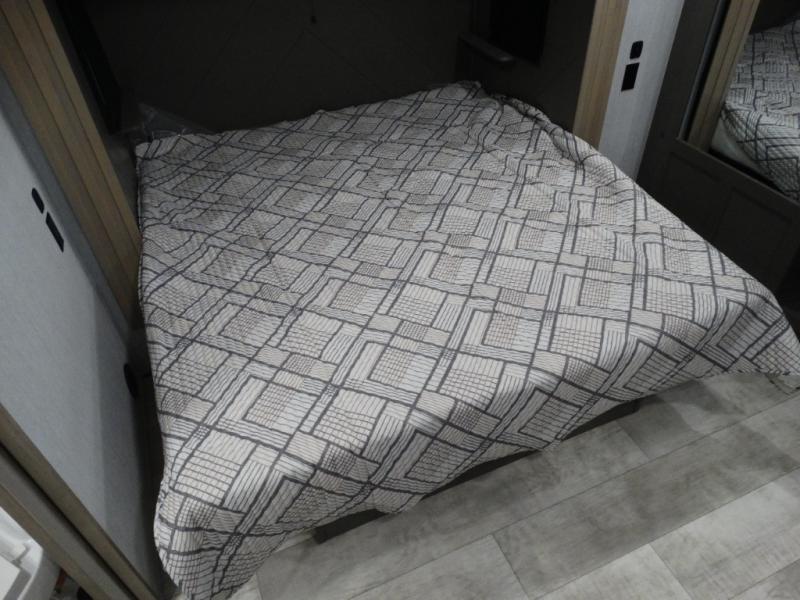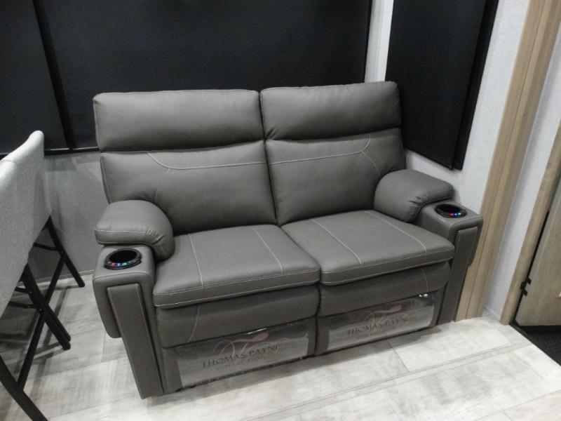 Load up your toys, your clothes and food and start your adventure as you smoothing tow this fifth wheel to your campsite. You will enjoy the Fast Ramp rear ramp door, the Ram-Air garage vents on both sides, and the 2,500 lb. rated flush-mount tie-downs to keep your toys secure. You will surely appreciate the full bathroom and LED TV, plus the Happi-Jac rollover sofas/table with a top bed. The main area provides a living and kitchen area with a 49" LED TV and a fireplace, theatre seating and a free standing dinette, plus full kitchen amenities. There is also a new Smart Sink with a removable cutting board, produce strainer and glass rinser you are sure to love. Head up front to use the full bathroom with a one-piece fiberglass shower with a glass door and teak seat, and fall quickly to sleep on your own king bed in the front bedroom.