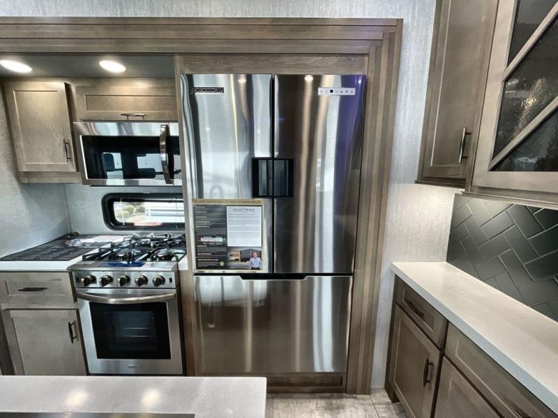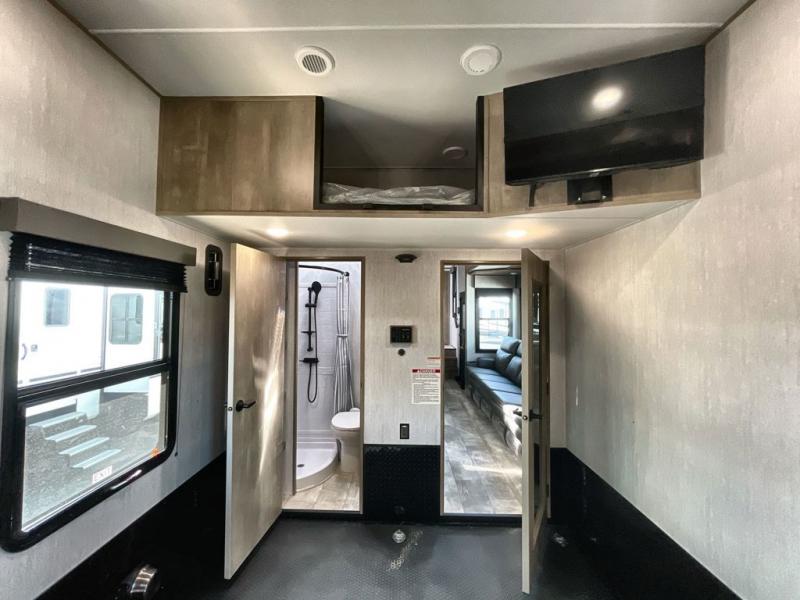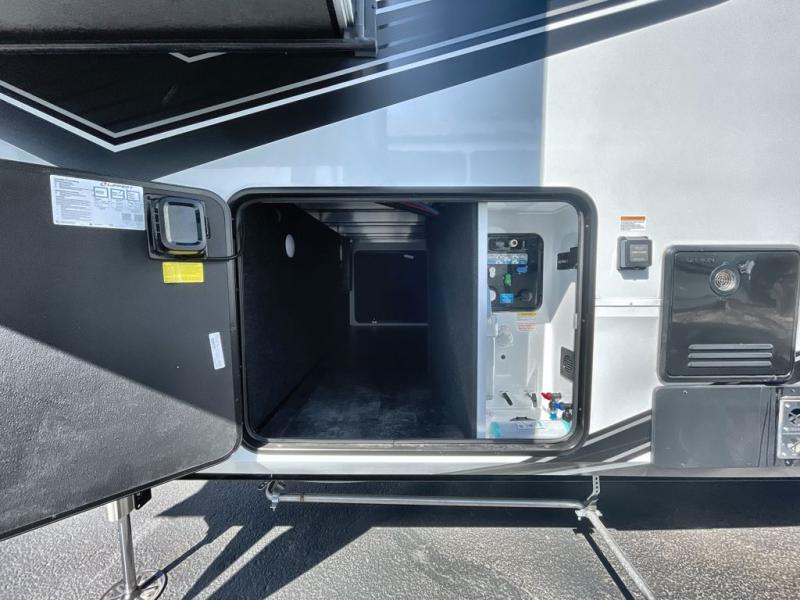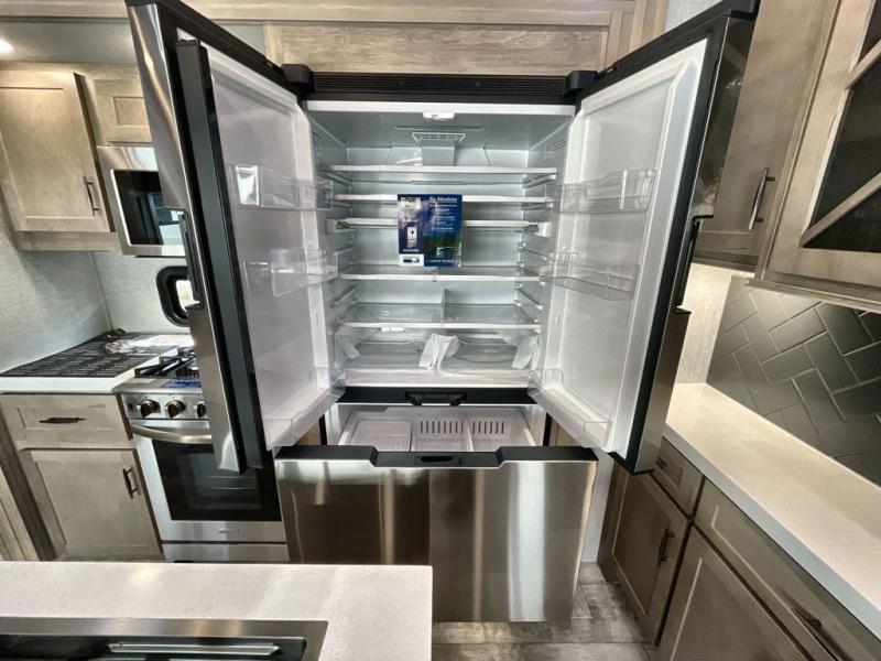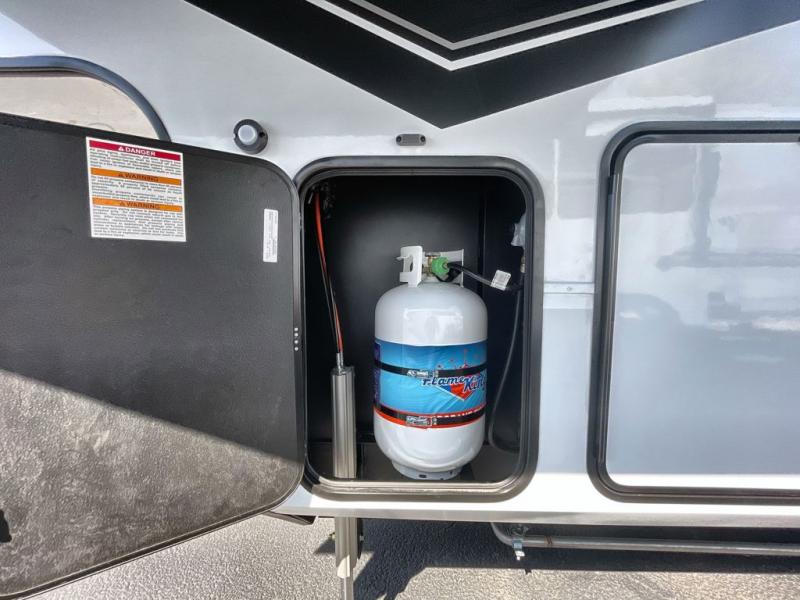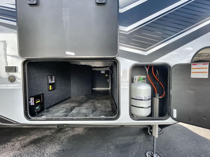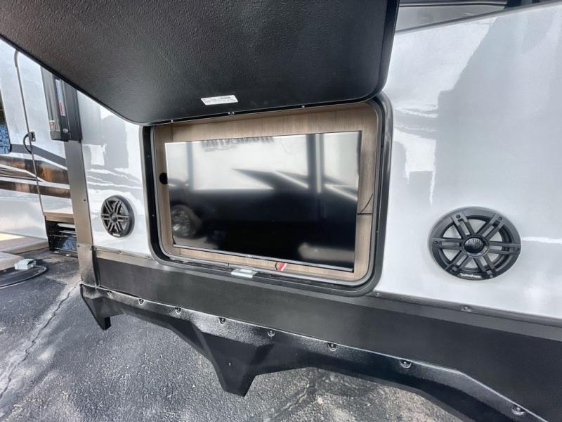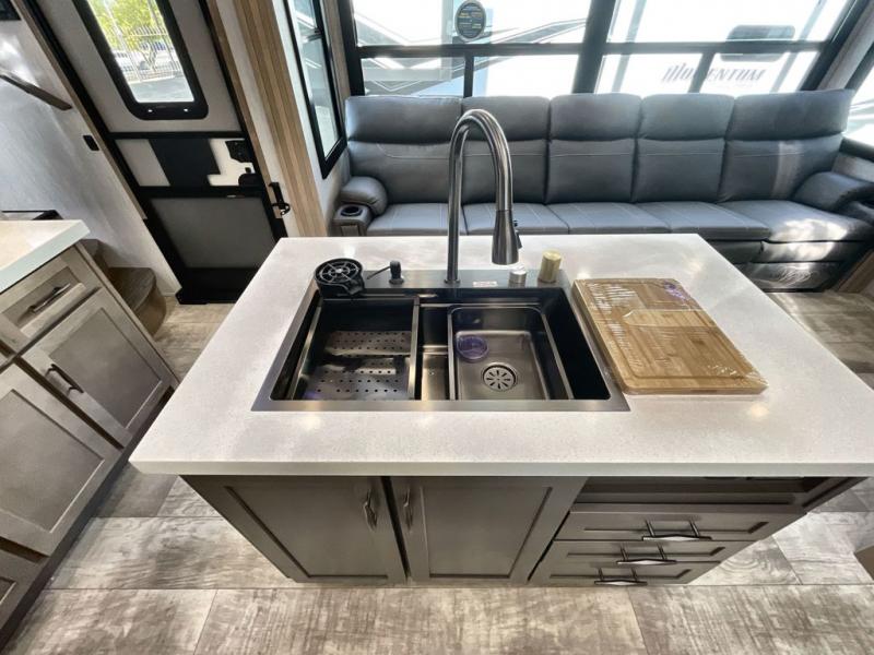 Load up your toys, your clothes and food and start your adventure as you smoothing tow this fifth wheel to your campsite. You will enjoy the Fast Ramp rear ramp door, the Ram-Air garage vents on both sides, and the 2,500 lb. rated flush-mount tie-downs to keep your toys secure. You will surely appreciate the full bathroom and LED TV, plus the option to add Happi-Jac rollover sofas/table with a top bed. The main area provides a living and kitchen area with a 49" LED TV and a fireplace, theatre seating and a free standing dinette, plus full kitchen amenities. There is also a new Smart Sink with a removable cutting board, produce strainer and glass rinser you are sure to love. Head up front to use the full bathroom with a one-piece fiberglass shower with a glass door and teak seat, and fall quickly to sleep on your own queen bed or choose a king option in the front bedroom.