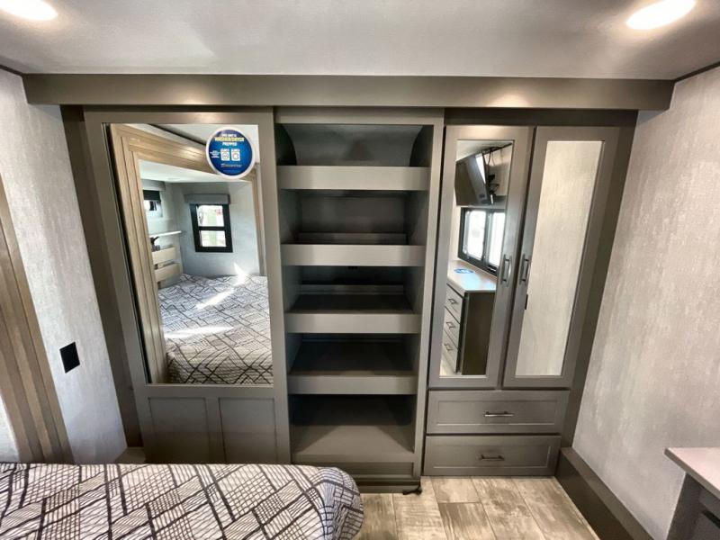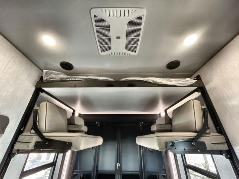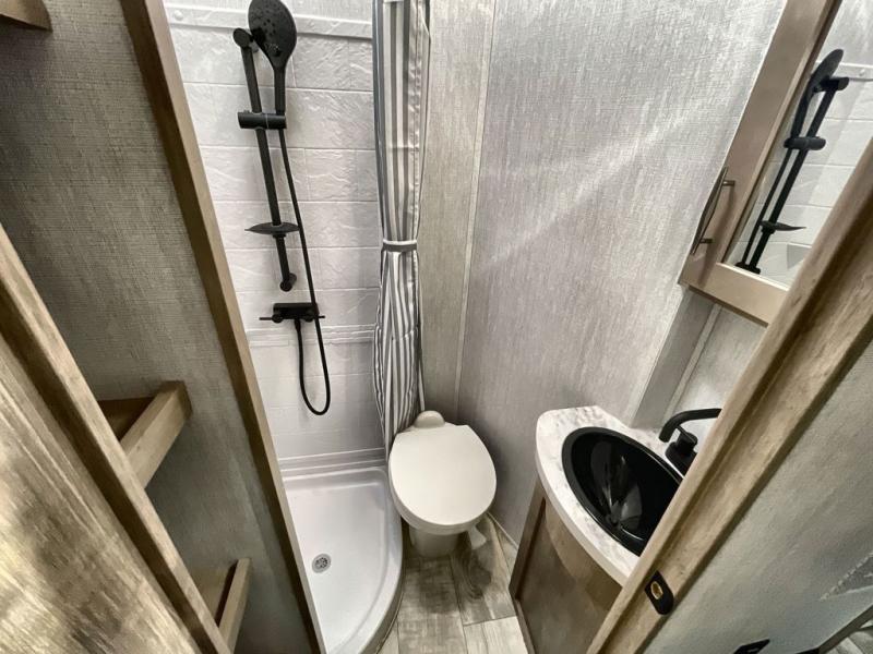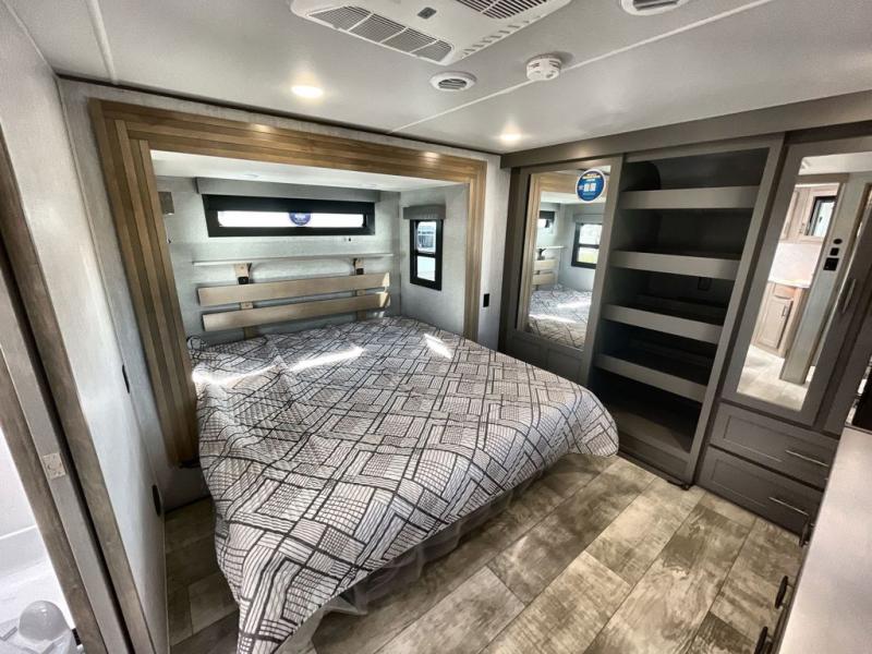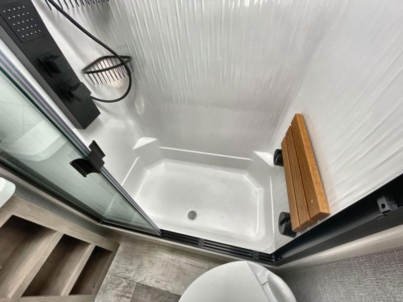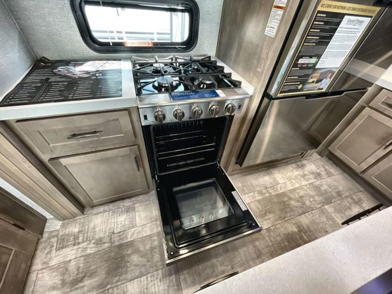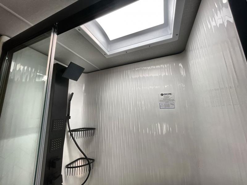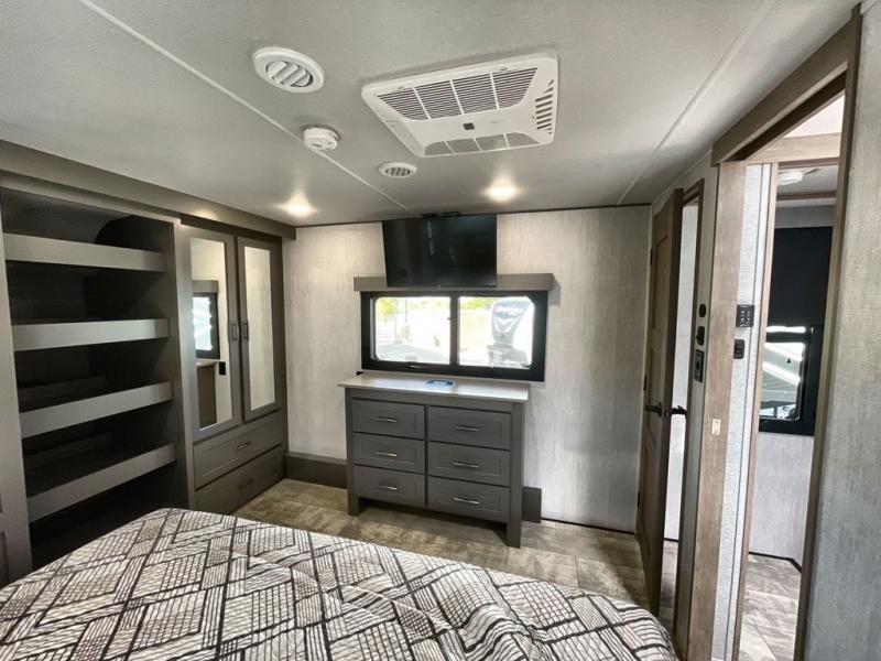 Load up your toys, your clothes and food and start your adventure as you smoothing tow this fifth wheel to your campsite. You will enjoy the Fast Ramp rear ramp door, the Ram-Air garage vents on both sides, and the 2,500 lb. rated flush-mount tie-downs to keep your toys secure. You will surely appreciate the full bathroom and LED TV, plus the option to add Happi-Jac rollover sofas/table with a top bed. The main area provides a living and kitchen area with a 49" LED TV and a fireplace, theatre seating and a free standing dinette, plus full kitchen amenities. There is also a new Smart Sink with a removable cutting board, produce strainer and glass rinser you are sure to love. Head up front to use the full bathroom with a one-piece fiberglass shower with a glass door and teak seat, and fall quickly to sleep on your own queen bed or choose a king option in the front bedroom.