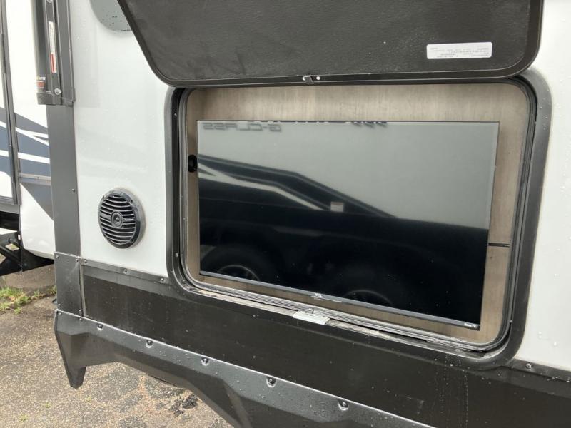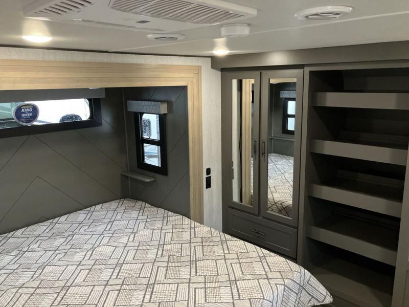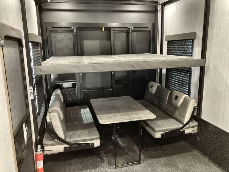 Load up your toys, your clothes and food and start your adventure as you smoothing tow this fifth wheel to your campsite. You will enjoy the Fast Ramp rear ramp door, the Ram-Air garage vents on both sides, and the 2,500 lb. rated flush-mount tie-downs to keep your toys secure. You will surely appreciate the full bathroom and LED TV, plus the option to add Happi-Jac rollover sofas/table with a top bed. The main area provides a living and kitchen area with a 49" LED TV and a fireplace, theatre seating and a free standing dinette, plus full kitchen amenities. There is also a new Smart Sink with a removable cutting board, produce strainer and glass rinser you are sure to love. Head up front to use the full bathroom with a one-piece fiberglass shower with a glass door and teak seat, and fall quickly to sleep on your own queen bed or choose a king option in the front bedroom.