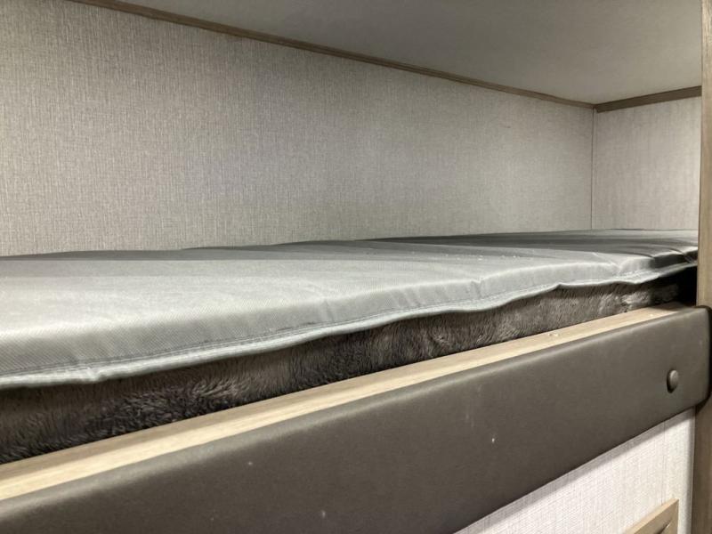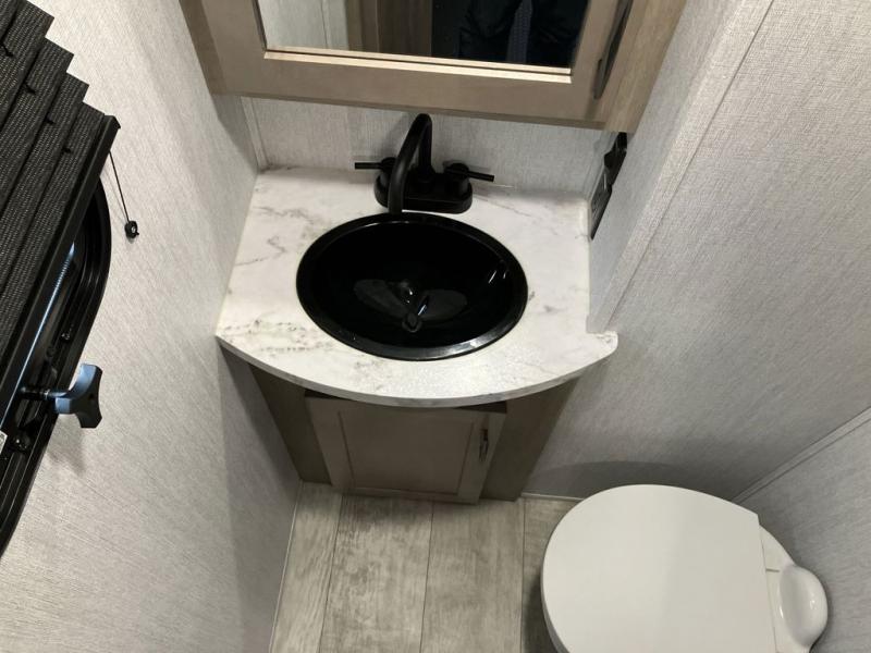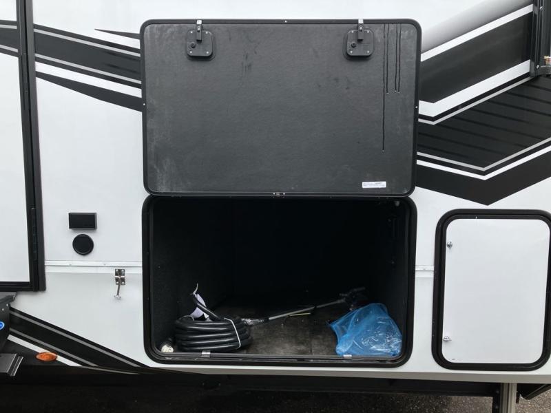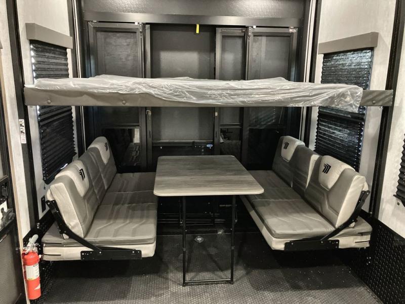 Get ready for a lot of fun when you head out to the off-road park, a special event, or a long trip with your toys! You will love the garage with the Fast Ramp rear ramp door, the Ram-Air garage vents on both sides, the 2,500 lb. rated flush-mount tie-downs and the protective diamond plate on the garage sidewalls. This area can become a bedroom or an extra living area if you want to add Happi-Jac rollover sofas/table with a top bed option, plus you will already have a half bath for convenience, an overhead loft bed plus a flip-up pet dish for your furry friends. The living and kitchen area is spacious with dual slides and a kitchen island with bar stools, a free standing dinette and theatre seating. The fold-down side patio offers a great place to relax outdoors above ground, and there are many more features to enjoy plus several options to customize your fifth wheel.