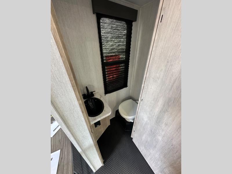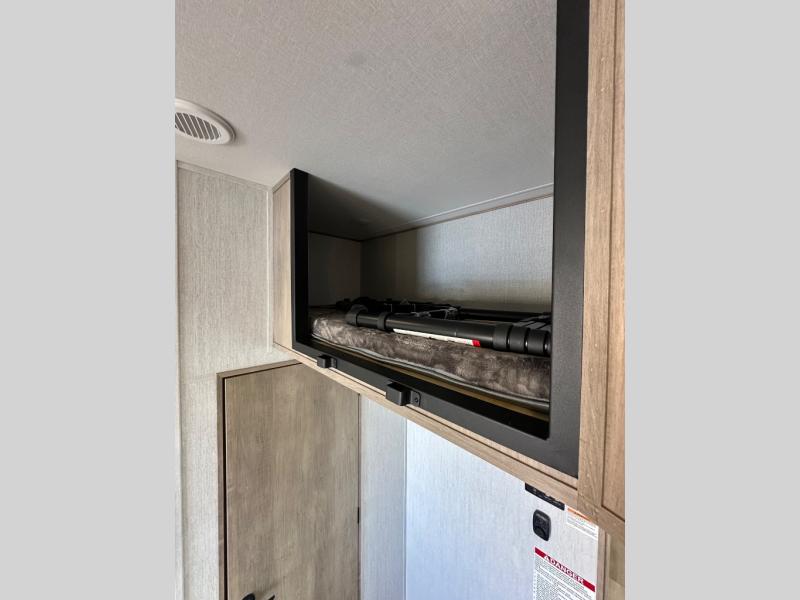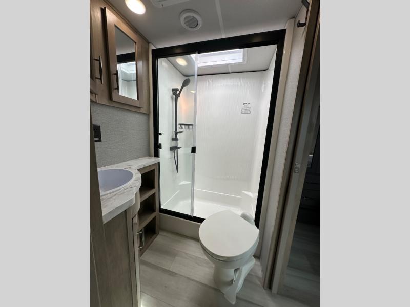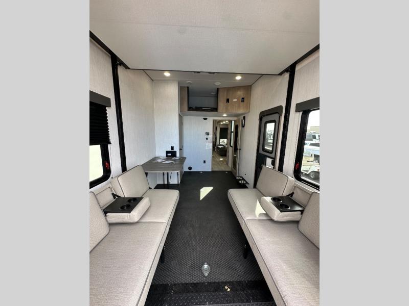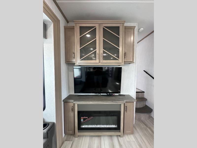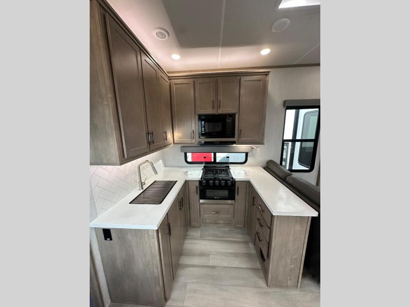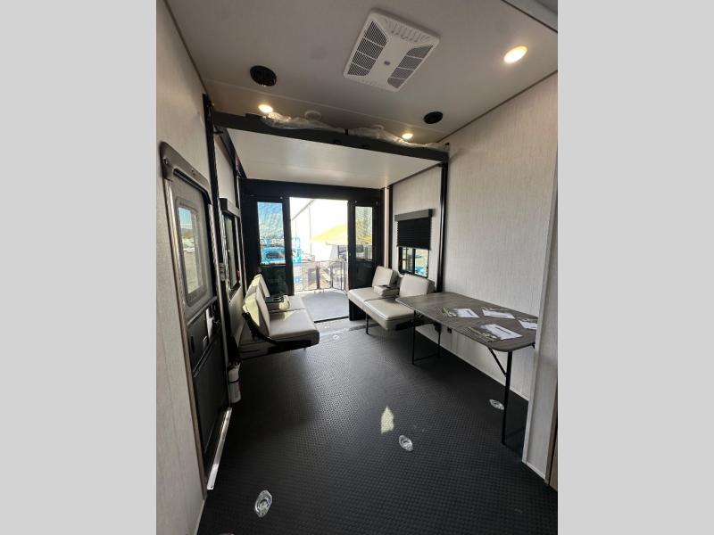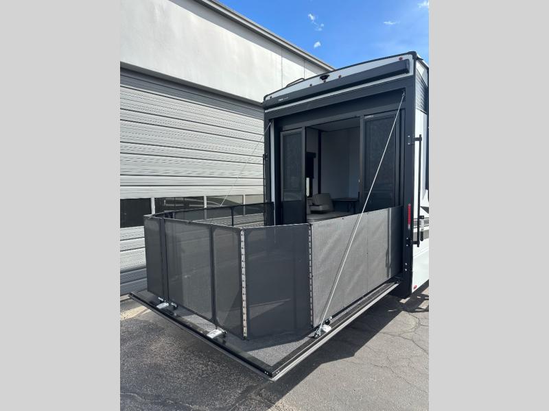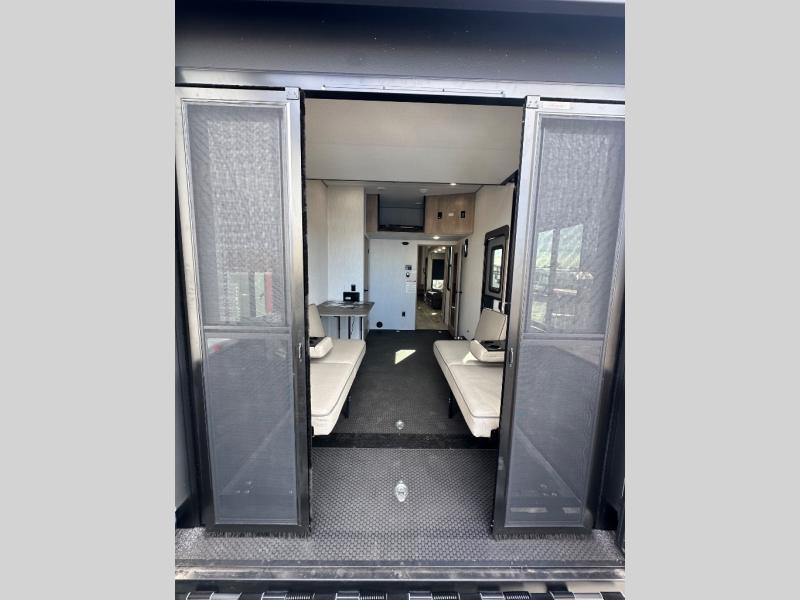 A 14' separate garage in this toy hauler offers plenty of space for your off-road toys! You will appreciate the convenience of having a full bathroom with a walk-in shower and you can even add an optional half bath to the garage area. You will also appreciate the two entry doors, and flip-up pet dish. The rear ramp door can even be converted into a patio, plus there are exterior speakers to keep the party going. Everyone will love hanging out in the separate living area with a fireplace at the entertainment center, two theater seating slides, and a third theater seating. The fully equipped kitchen has everything you need to prepare delicious home cooked meals. The front private bedroom offers an escape to rest and relax on a queen bed for the next ride!