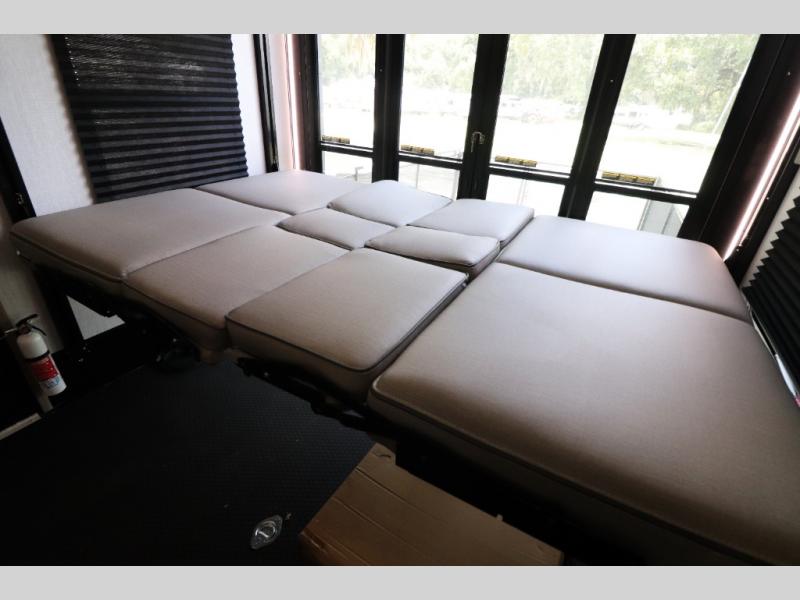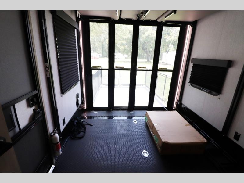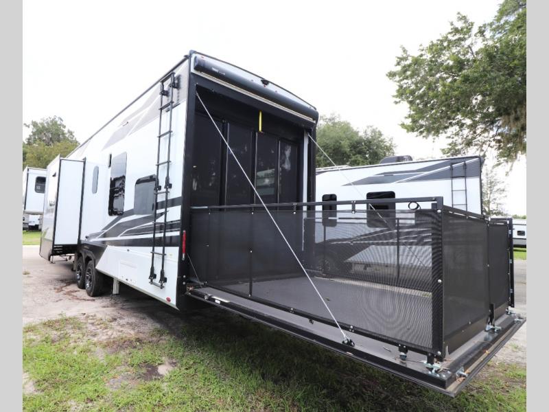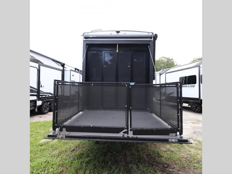 - Toy Hauler Garage: 11-foot garage with tie-downs, convertible sofas, and a loft bed.