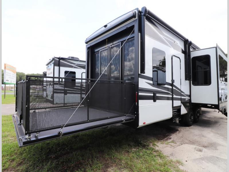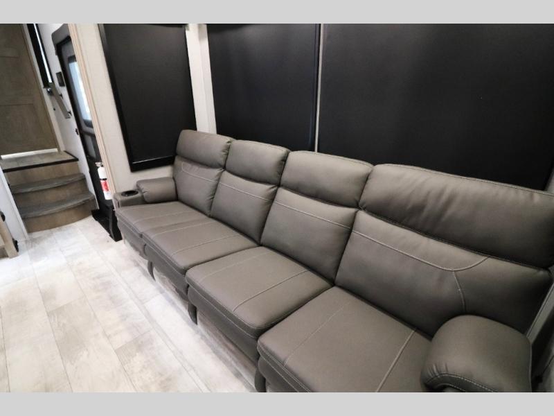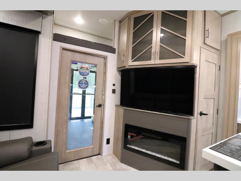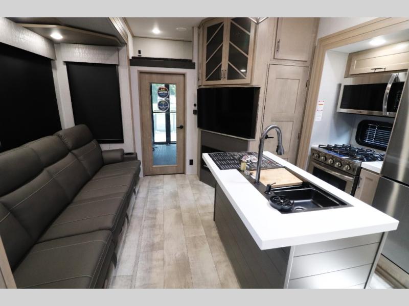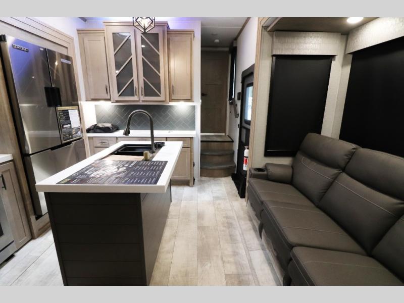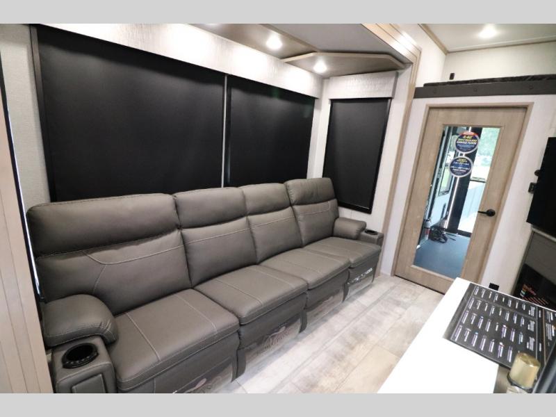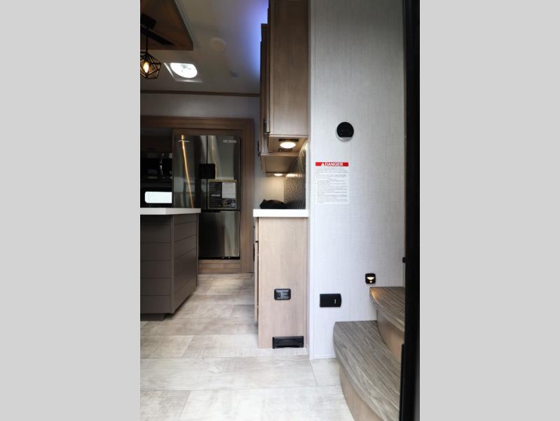 - Outdoor Living: Exterior entertainment center, electric awnings with LED lights, and outdoor kitchen options.