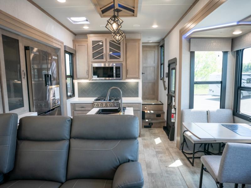 With any Momentum M-Class toy hauler by Grand Design, you will enjoy luxury at every turn! They have been constructed to a superior standard with a thermal roof design, triple insulated main floor and garage floor, and a Rail-Tite underbelly seal that will allow you to camp in all elements. Each model also features an 8' 5" wide body chassis with a wide rail design, no wheel wheels, and a dovetail entry for easier loading. The Stealth A/C system provides maximum cooling power, and the CRE3000 suspension system means you can enjoy a smooth tow each time. You will love the luxurious interior with a professional grade stainless steel cooktop, interior color changing LED accent lighting, a fiberglass shower with a glass door, and solid surface countertops.