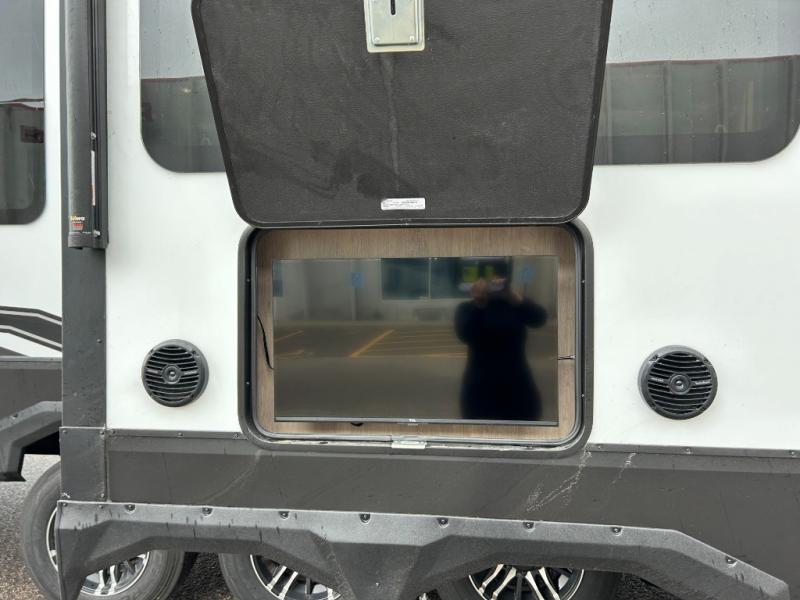 You want a toy hauler to carry your toys to the trails, and you can get an extra living room/bedroom out of this space once everything is unload when you add the Happi-Jac rollover sofas with a table with a top bed option. You might even like to add more optional features such a half bath and washer/dryer. There is an overhead loft bed and an L-shaped pull-out sofa in the main living area that offers sleeping space as well. Everyone can watch a movie on the LED TV with a fireplace below while sitting on the sofa, in the theatre seats, or while at the free standing dinette with four chairs. The chef will have upgraded appliances to make meals for everyone, an L-shaped countertop with a kitchen sink, and a USB charging outlet. You will love the sunken tub/shower with seat in the full bathroom with two space savings sliding doors that lead into the hallway, and into the front bedroom where you will have a walk-around queen bed, a slide out wardrobe and more USB charging outlets.