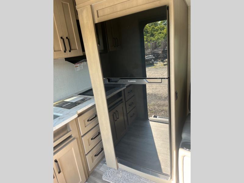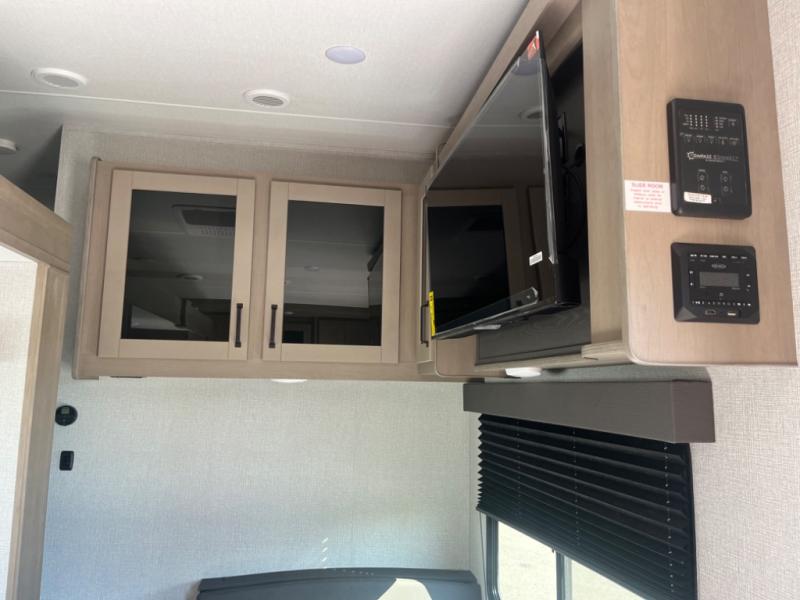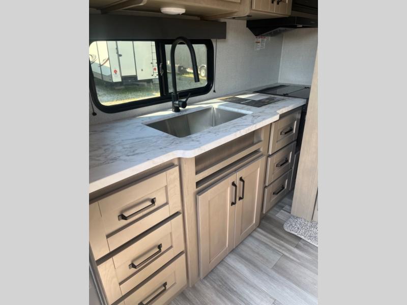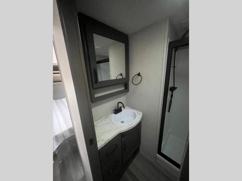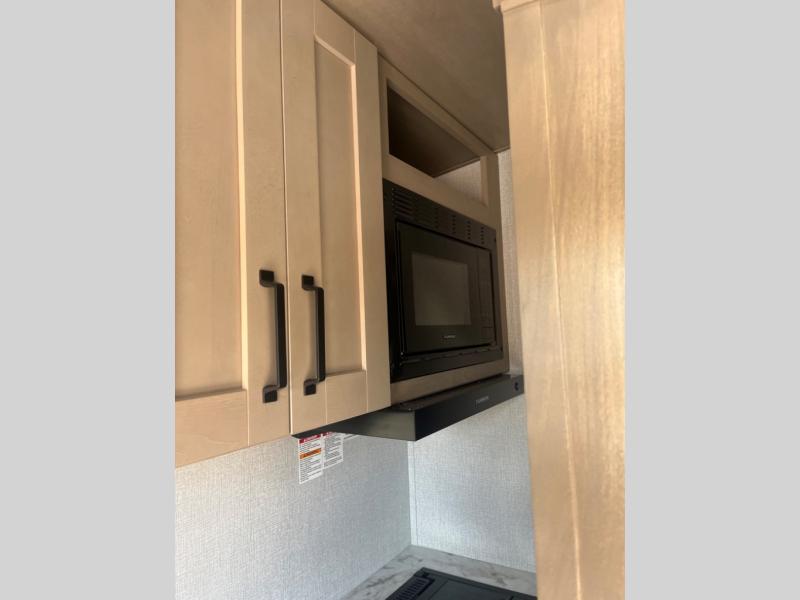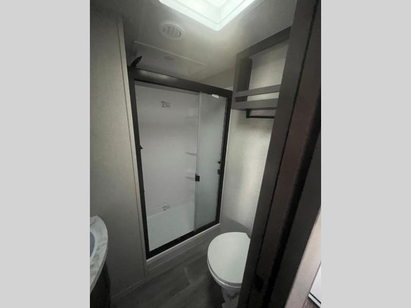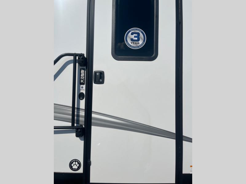 This rear kitchen fifth wheel is sure to meet all of your camping needs! Since the exterior length is only 26' 11", you can easily maneuver in and out of campgrounds. The rear kitchen includes ample counter space to prep meals, a three burner cooktop, and overhead storage for all your necessities. There is a 10 cu. ft. 12V refrigerator within the slide out that also includes the theater seating, and the booth dinette provides a place to dine or play a card game. You will appreciate having convenient storage by the entry door, along with pull-out pet bowls, a functional wardrobe closet in the bedroom and an exterior pass-thru for belongings and camping gear. When you're ready to turn in for the night, the queen bed is sure to bring a great night's rest, while your guests sleep on the booth dinette or optional tri-fold sofa if you replace the theater seating!