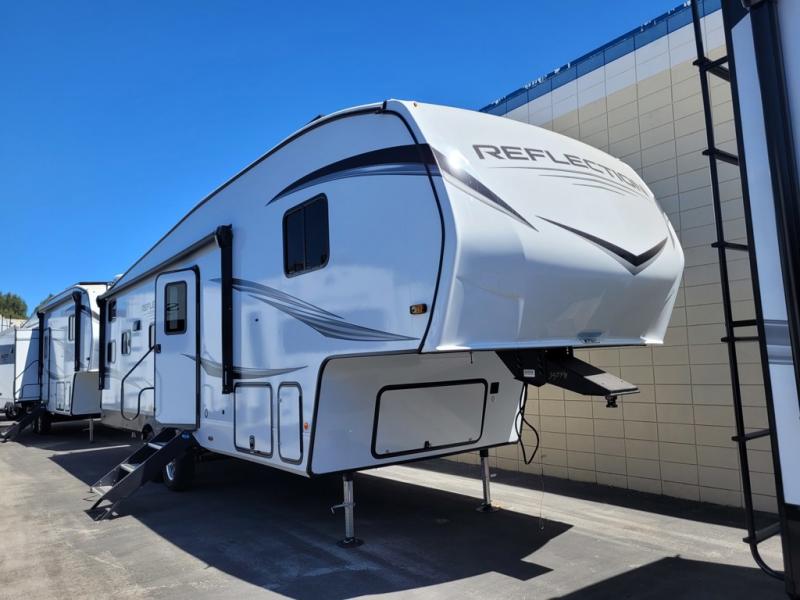 Each Reflection 100 Series fifth wheel by Grand Design is affordable and packed with luxury for unforgettable camping memories! The MorRyde CRE3000 suspension system and Goodyear Endurance tires will provide smooth towing from home to campground. And the solar package with a 180W solar panel, 60 Amp charge controller and 12V refrigerator will allow you to camp for longer periods of time and in more locations! A heated and enclosed underbelly with circulating heat is included in the Arctic 4-Seasons Protection Package, along with a double insulated roof and front cap, and thermofoil insulation under the holding tanks so you can camp all year long if you choose. You will appreciate having an on-demand water heater for hot showers after exploring, and the universal all-in-one docking station will let you monitor your RVs tanks levels and functions with ease. These models also include many luxurious interior features, such as premium Congoleum flooring, pleated shades, residential cabinetry, and matte black fixtures and hardware. Don't let the Reflection 100 Series fifth wheels pass you by!