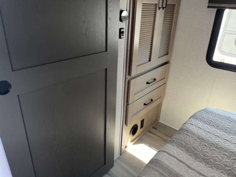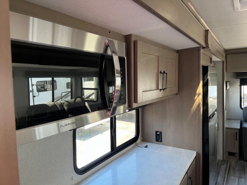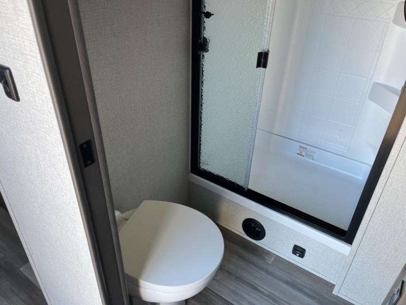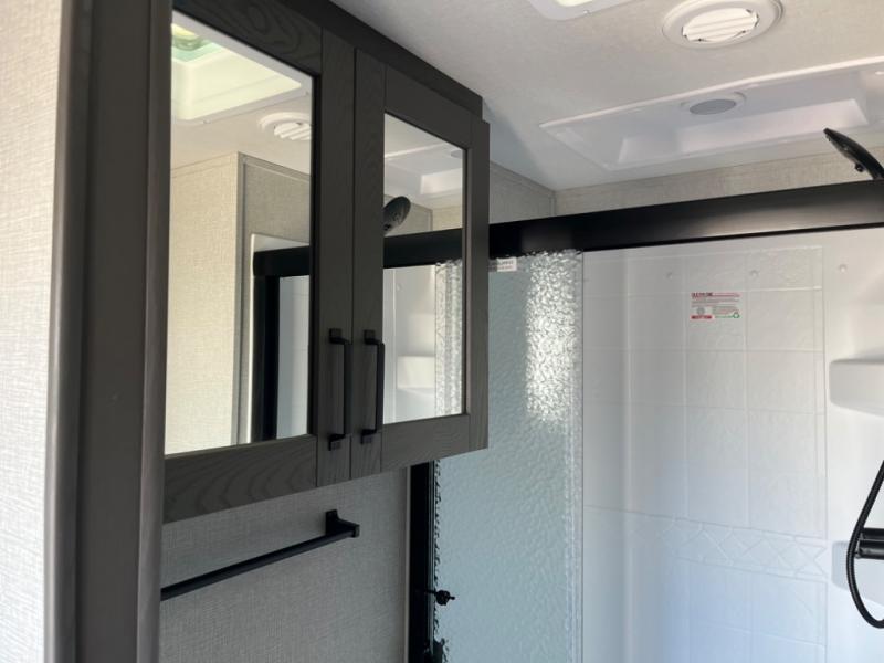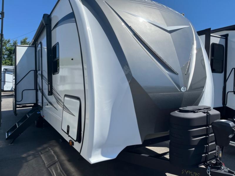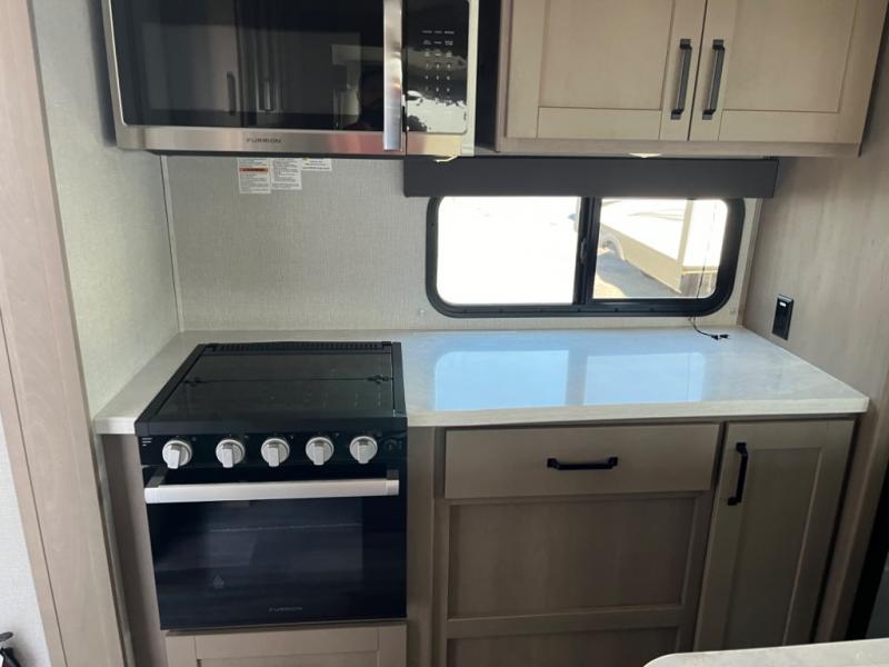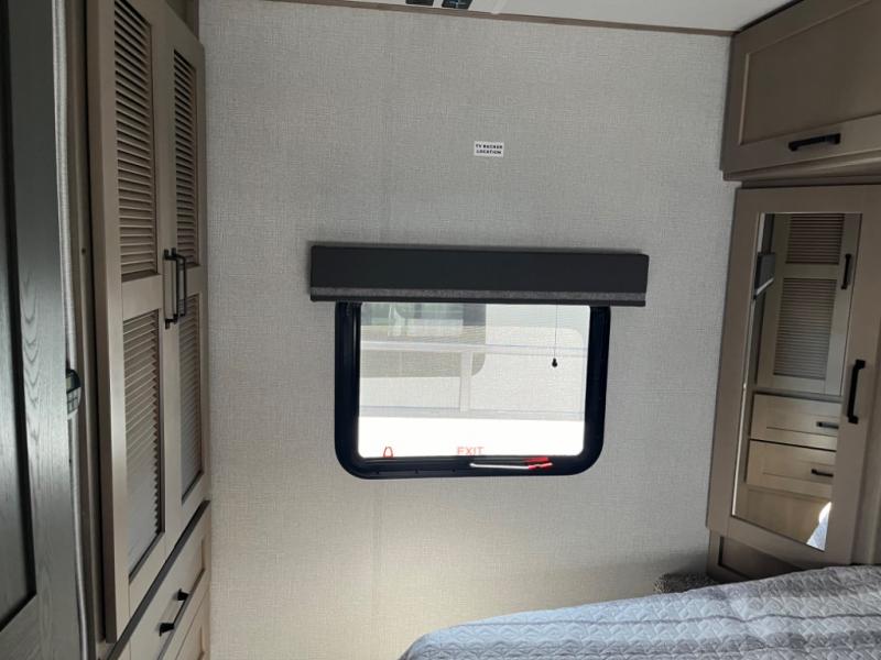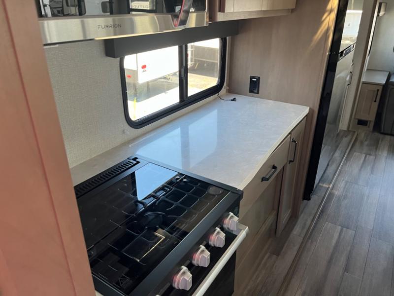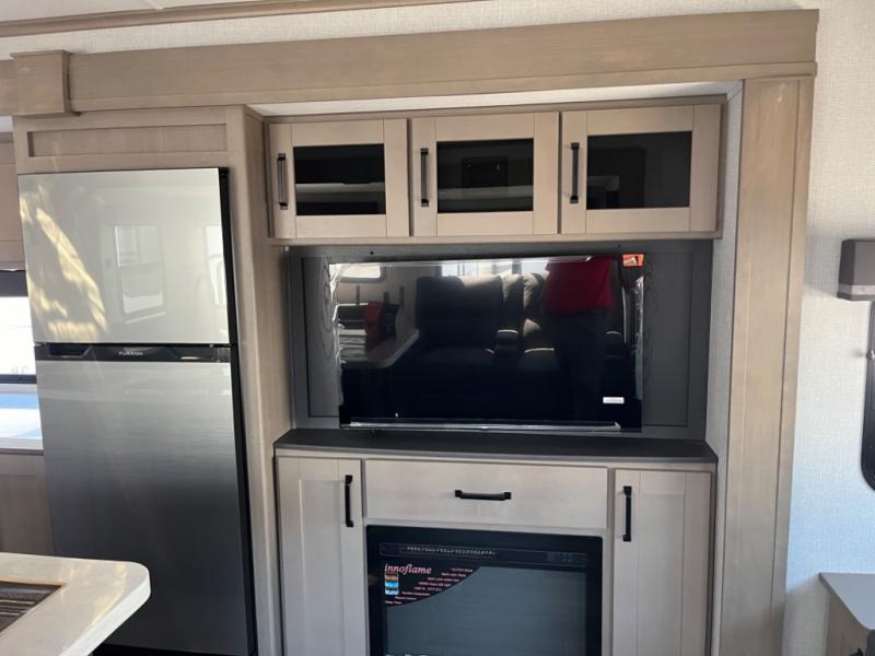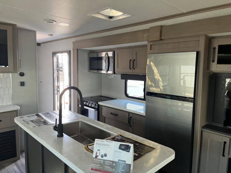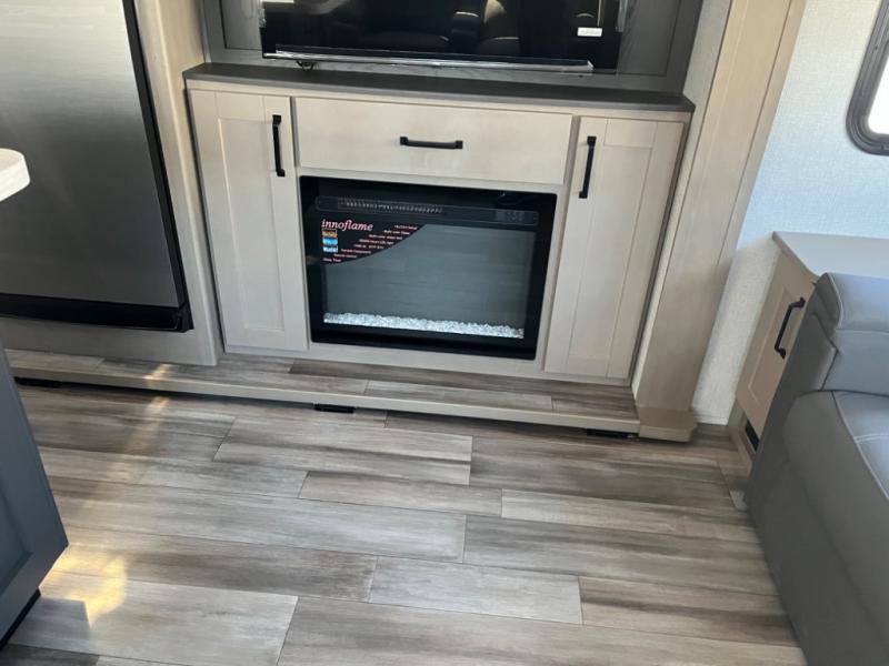 Whether you travel to explore or relax, this trailer will give you the choice depending where you park it! The outside kitchen provides another place to make meals when you want to be in the outdoors, and the inside kitchen amenities offer a gourmet kitchen including a 10 cu. ft. refrigerator, an island, and a hutch. You and your guests will find theatre seating with cupholders, a booth dinette or choose a free standing dinette option, and a tri-fold sofa to sit on and visit while you watch the 40" LED HDTV with fireplace below. The full bathroom includes a space saving sliding door and linen storage, and the bedroom gives you a front walk-around queen bed with storage for your clothes on each side, plus there is an additional wardrobe with drawers and the option to add a washer/dryer to the prepped space.