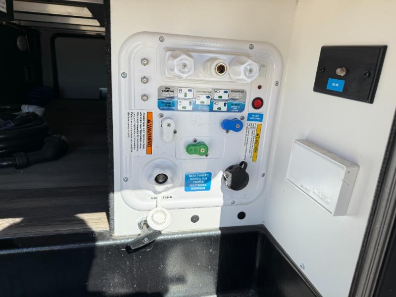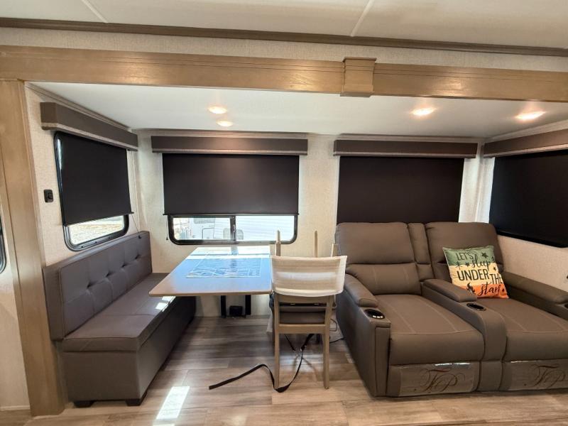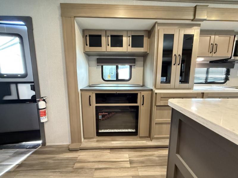 Enjoy a home away from home with this travel trailer! The chef will enjoy cooking either indoors in the rear kitchen with the kitchen island, hutch, and three burner cooktop, or outdoors with the outside griddle and outside 1.6 cu. ft. refrigerator to drink a cold beverage while grilling burgers. If mother nature rains on your parade then you can head indoors and either play games at the booth dinette or relax on the theater seating across from the entertainment center with a 40" TV and fireplace. Rinse the sand out of your hair in the full bathroom with the 30" x 36" shower then head to the front private bedroom and lay down on the queen bed slide which can be replace for an optional king bed. Keep your clothes clean with the prepped washer and dryer area and watch the big game outdoors with the coax TV hookup!