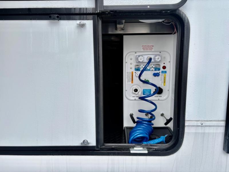 You can enjoy a spacious rear living area in this RV with dual opposing slides offering you entertainment, kitchen amenities, seating and windows for great views! The rear tri-fold sofa also converts into extra sleeping space for an extra guest or two, just like the booth dinette does. Yet you might like to add the free standing dinette option. There are theatre seats to enjoy while you place your drinks in the cupholders and watch the entertainment center with a 40" LED HDTV and fireplace. The pantry is big enough to store your favorite snacks, and the kitchen island will make meal prepping easier, plus there is a 16 cu. ft. refrigerator to store any leftovers. The full bathroom has a 30" x 48" fiberglass shower and a linen closet to store your towels. The front private bedroom has a comfortable queen bed slide that can be switched out for the optional king bed, a dresser with overhead cabinets, and a full wall wardrobe that is prepped to add the optional washer and dryer so that you can extend your camping trip with clean clothes!