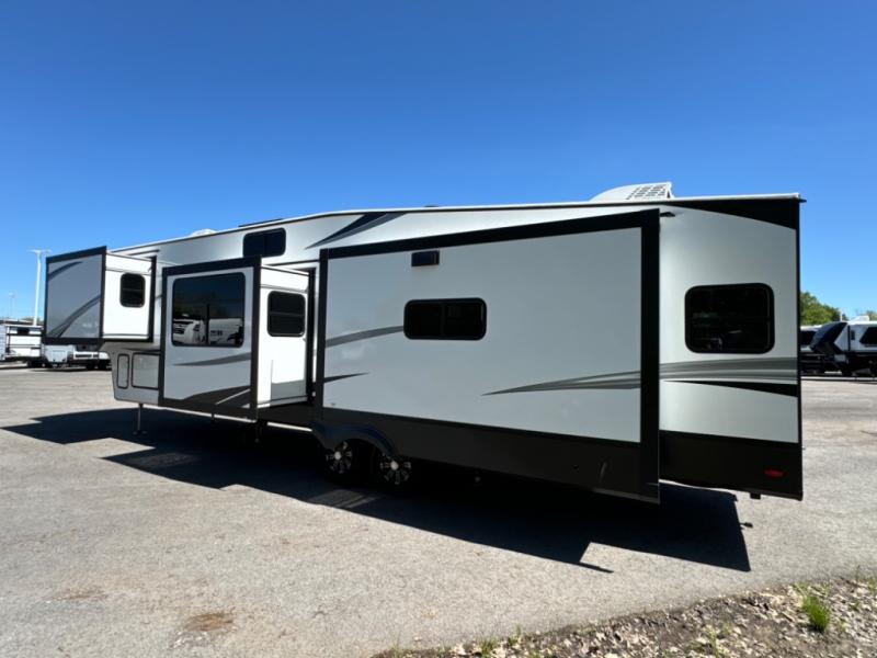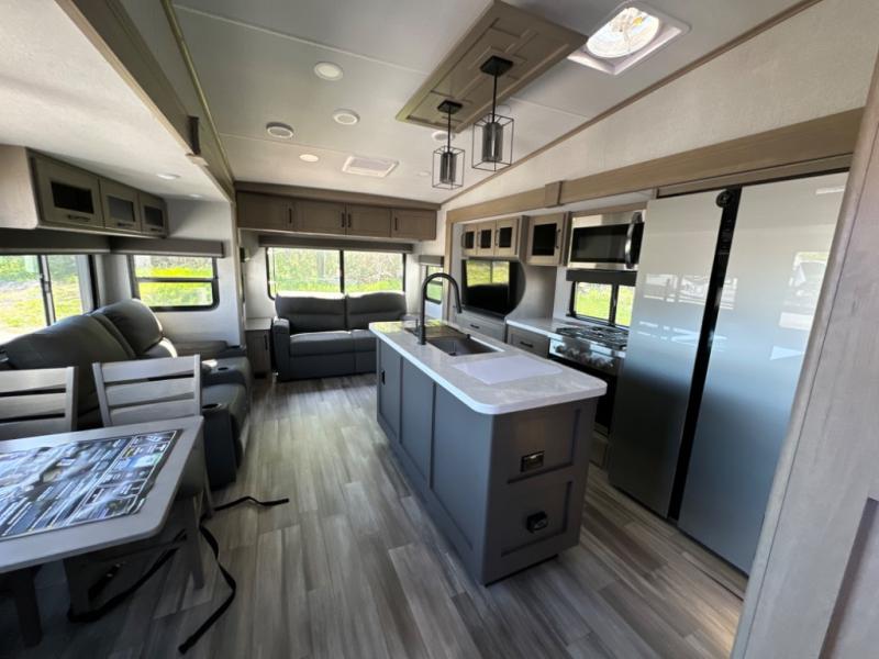 Travel to see new state parks, RV resorts or your family in other states as you tow this fifth wheel to each destination! You will enjoy comfort and convenience, plus a place to work, and be able to offer extra sleeping space for friends and family when they visit. The middle extra room provides a tri-fold sofa slide, a desk, a wardrobe, plus a 64" x 88" upper bed loft area with access from the hallway, which provides two different places to accommodate overnight guests. The full bathroom will keep everyone refreshed, and the front bedroom allows you to sleep on a queen bed slide or choose the king option. And you will love the front wardrobe, the dresser, and the option to add a washer/dryer. The main living and kitchen area provides plenty of seating from the rear tri-fold sofa, the booth dinette or choose the free standing dinette option, and the theatre seats with cupholders. And the kitchen island, the appliances, and the large pantry allow you to take everything you need with you.