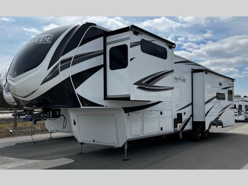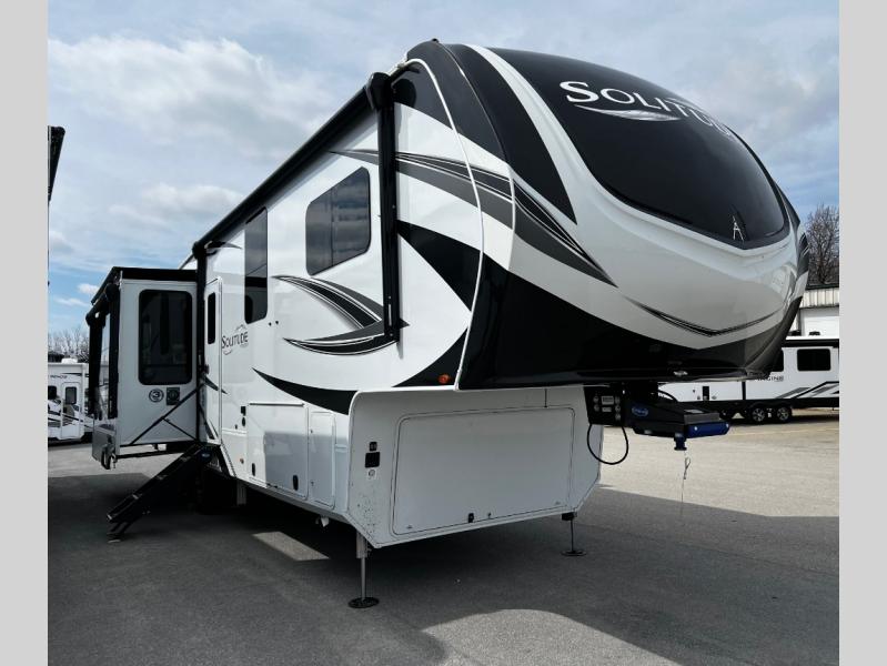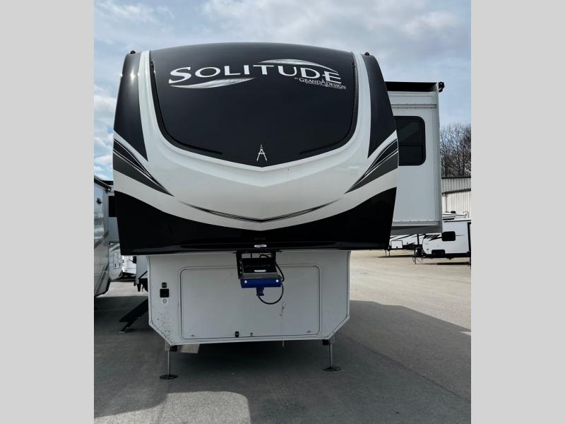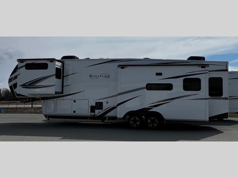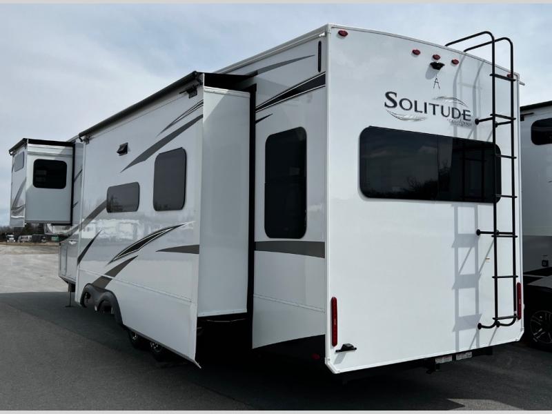 Each Solitude fifth wheel by Grand Design features a 101" wide-body construction, heavy duty 7,000 lb. axles, frameless tinted windows, and high-gloss gel coat sidewalls. You can camp year around thanks to the Weather-Tek Package that includes a 35K BTU high-capacity furnace, an all-in-one enclosed and heated utility center, and a fully enclosed underbelly with heated tanks and storage. Inside, you'll love the premium roller shades, hardwood cabinet doors, solid surface countertops and sinks, plus residential finishes throughout to make you truly feel at home. Each model also includes a MORryde CRE3000 suspension system, self adjusting brakes, and a MORryde pin box that will provide smooth towing from home to campground. Affordable luxury is possible with the Solitude fifth wheels; choose yours today!