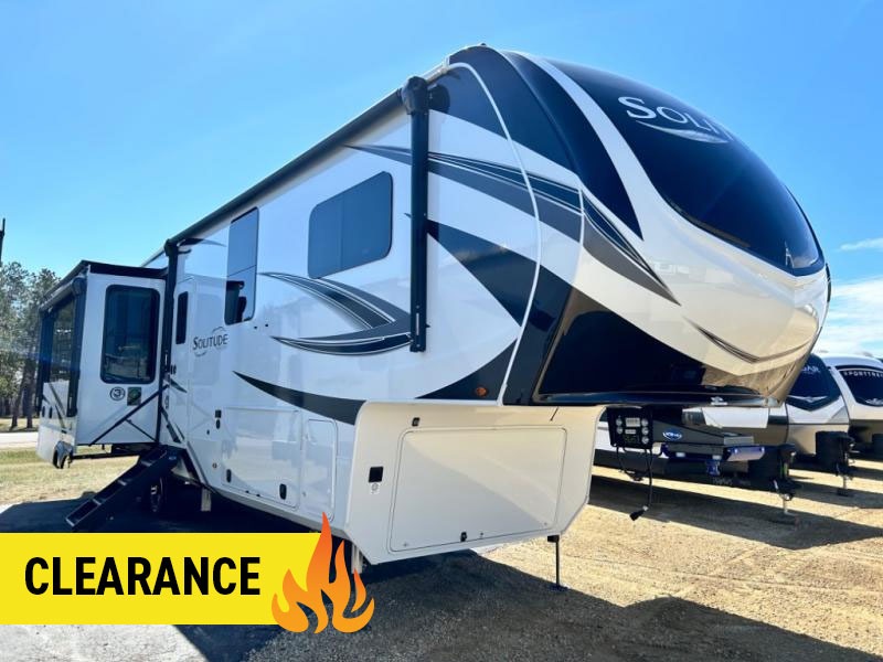 Each Solitude fifth wheel by Grand Design features a 101" wide-body construction, heavy duty 7,000 lb. axles, frameless tinted windows, and high-gloss gel coat sidewalls. You can camp year around thanks to the Weather-Tek Package that includes a 35K BTU high-capacity furnace, an all-in-one enclosed and heated utility center, and a fully enclosed underbelly with heated tanks and storage. Inside, you'll love the premium roller shades, hardwood cabinet doors, solid surface countertops and sinks, plus residential finishes throughout to make you truly feel at home. Each model also includes a MORryde CRE3000 suspension system, self adjusting brakes, and a MORryde pin box that will provide smooth towing from home to campground. Affordable luxury is possible with the Solitude fifth wheels; choose yours today!
