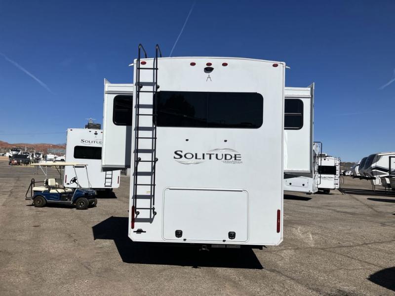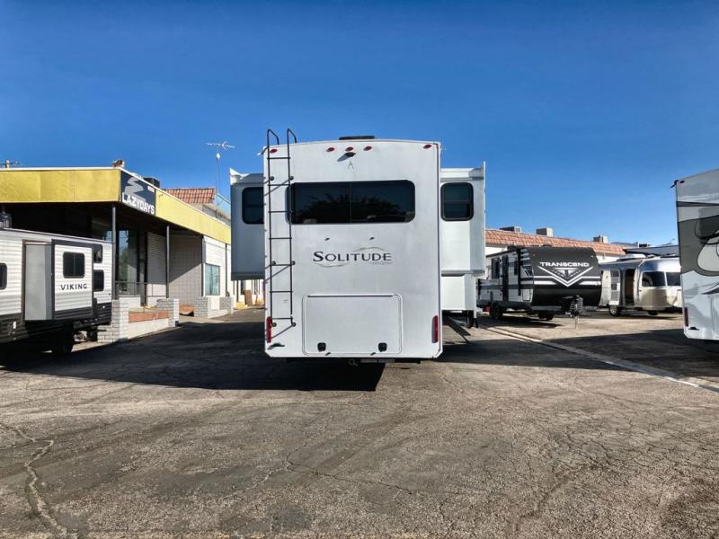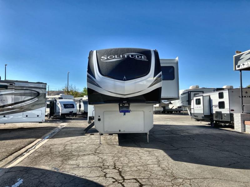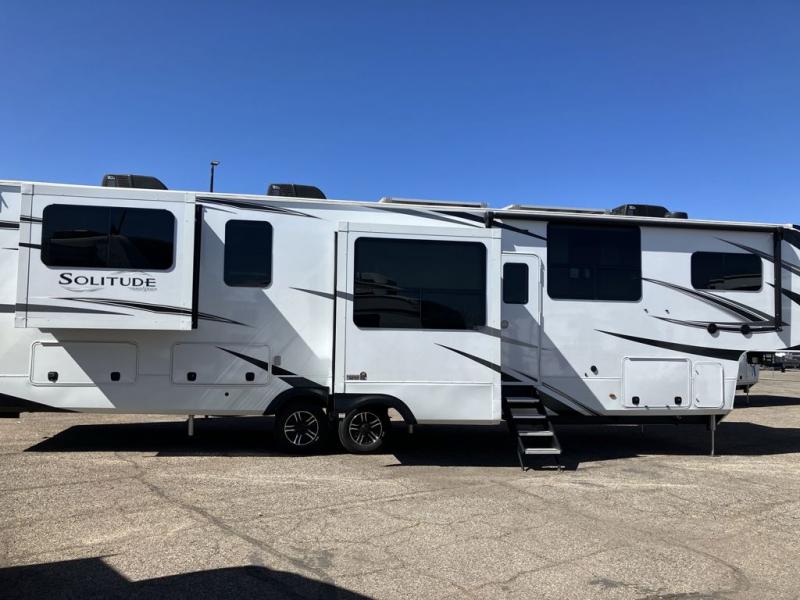 Each Solitude fifth wheel by Grand Design features a 101" wide-body construction, heavy duty 7,000 lb. axles, frameless tinted windows, and high-gloss gel coat sidewalls. You can camp year around thanks to the Weather-Tek Package that includes a 35K BTU high-capacity furnace, an all-in-one enclosed and heated utility center, and a fully enclosed underbelly with heated tanks and storage. Inside, you'll love the premium roller shades, hardwood cabinet doors, solid surface countertops and sinks, plus residential finishes throughout to make you truly feel at home. Each model also includes a MORryde CRE3000 suspension system, self adjusting brakes, and a MORryde pin box that will provide smooth towing from home to campground. Affordable luxury is possible with the Solitude fifth wheels; choose yours today!