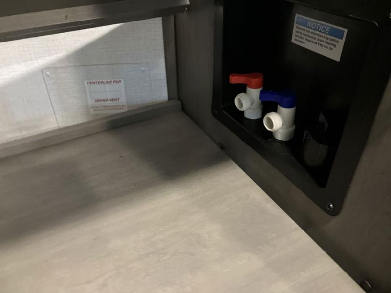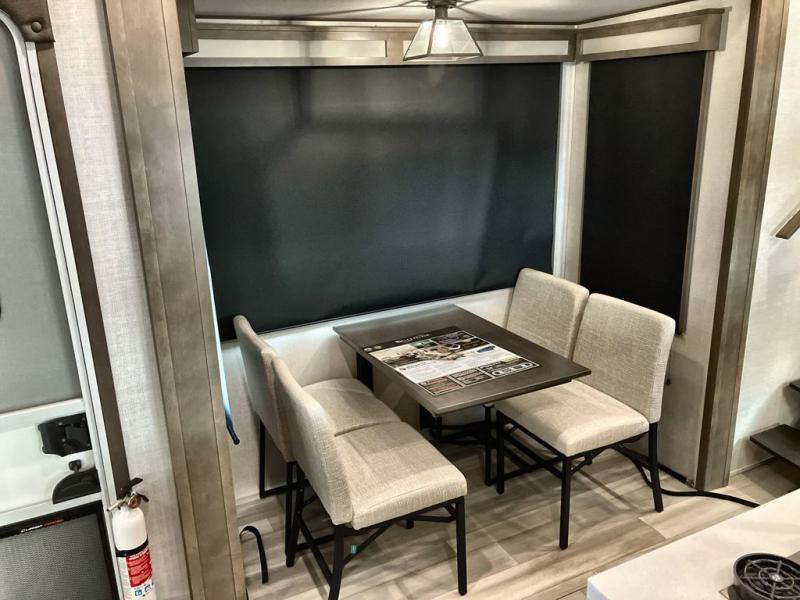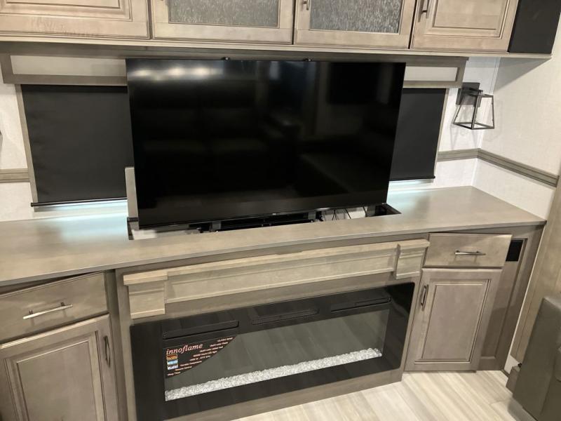 Each minute spent in this spacious fifth wheel will feel just like home! The rear living area includes a rear entertainment center with an LED Smart TV and a fireplace, overhead cabinets, theater seating, plus two tri-fold sofas for your guests to sleep on. You will have the front private bedroom all to yourselves with a queen bed slide out that can be switched out for an optional king bed, and the front closet provides all the space you need to store your belongings. This model includes a spacious full bath with a flip-up teak seat, a shower skylight, plus dual bath sinks for ultimate convenience. The chef of your group will love the middle kitchen with its convenient island including double sinks, a residential cooktop and 24" oven, 20 cu. ft. refrigerator, and free-standing dinette plus a hutch and buffet for storage. Head outdoors to find a 16' power awning with LED lights and middle pass through along with rear storage including a sliding tray, and you might want to add the optional pull-out kitchen.