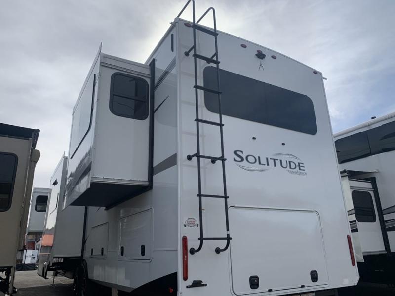 Each Solitude fifth wheel by Grand Design features a 101" wide-body construction, heavy duty 7,000 lb. axles, frameless tinted windows, and high-gloss gel coat sidewalls. You can camp year around thanks to the Weather-Tek Package that includes a 35K BTU high-capacity furnace, an all-in-one enclosed and heated utility center, and a fully enclosed underbelly with heated tanks and storage. Inside, you'll love the premium roller shades, hardwood cabinet doors, solid surface countertops and sinks, plus residential finishes throughout to make you truly feel at home. Each model also includes a MORryde CRE3000 suspension system, self adjusting brakes, and a MORryde pin box that will provide smooth towing from home to campground. Affordable luxury is possible with the Solitude fifth wheels; choose yours today!