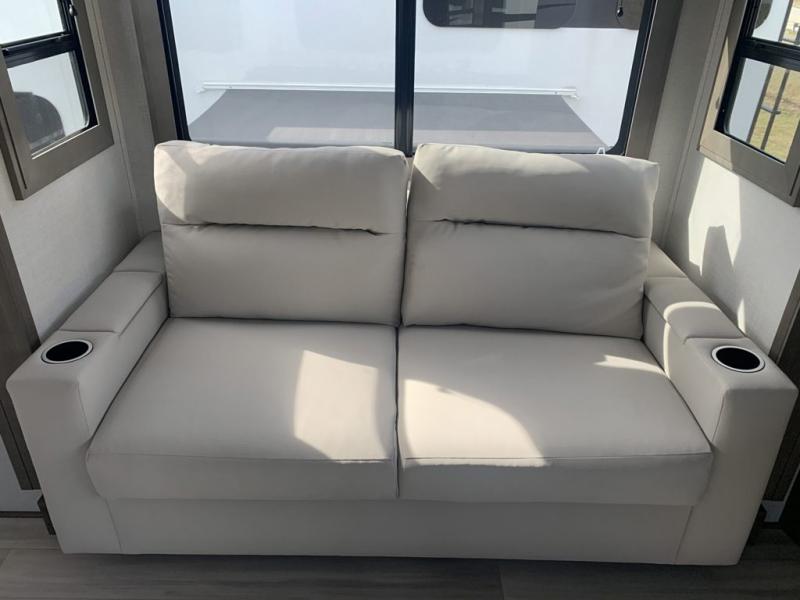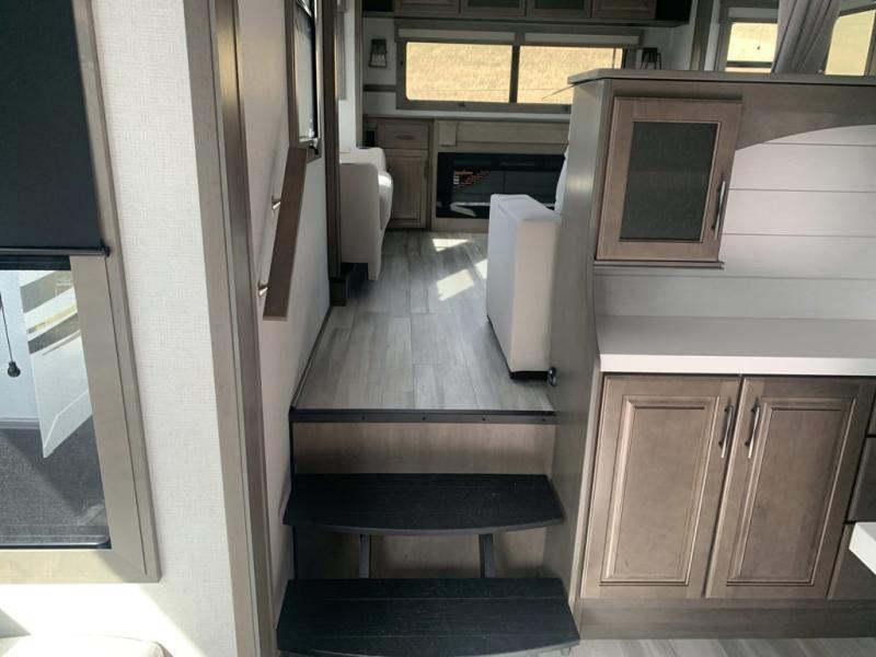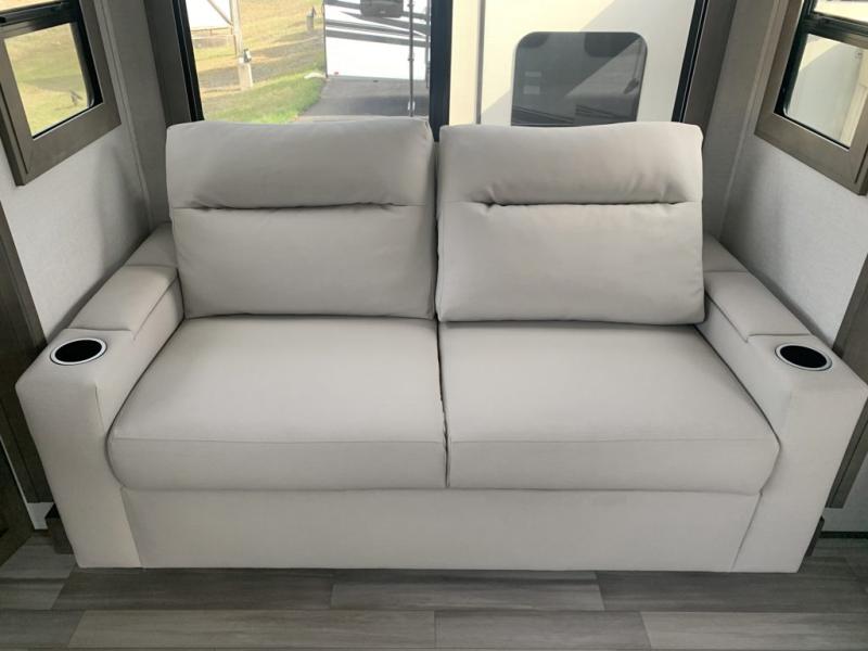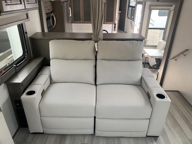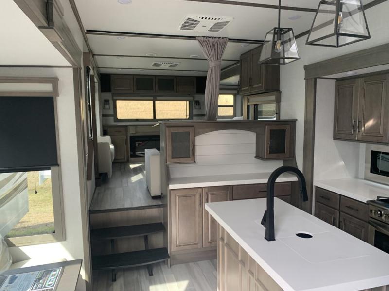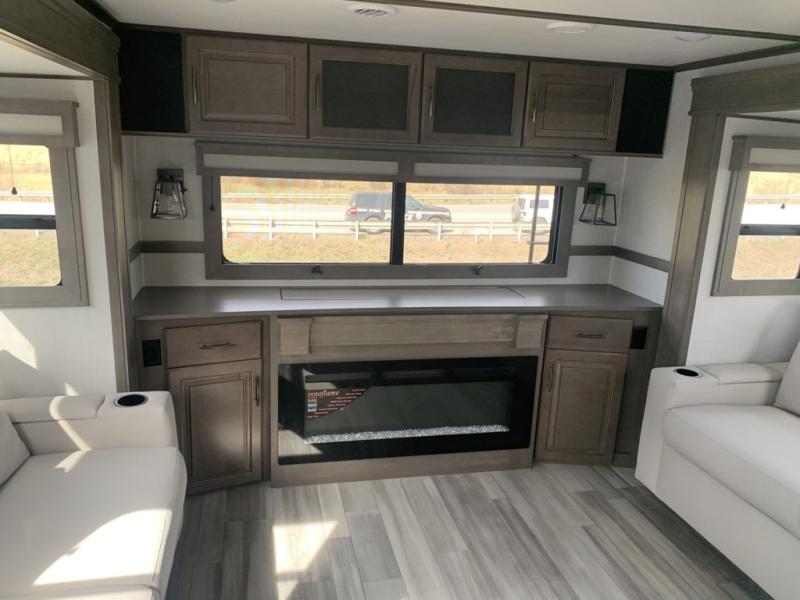 Each minute spent in this spacious fifth wheel will feel just like home! The rear living area includes a rear entertainment center with an LED Smart TV and a fireplace, overhead cabinets, theater seating, plus two tri-fold sofas for your guests to sleep on. You will have the front private bedroom all to yourselves with a queen bed slide out that can be switched out for an optional king bed, and the front closet provides all the space you need to store your belongings. This model includes a spacious full bath with a flip-up teak seat, a shower skylight, plus dual bath sinks for ultimate convenience. The chef of your group will love the middle kitchen with its convenient island including double sinks, a residential cooktop and 24" oven, 20 cu. ft. refrigerator, and free-standing dinette plus a hutch and buffet for storage. Head outdoors to find a 16' power awning with LED lights and middle pass through along with rear storage including a sliding tray, and you might want to add the optional pull-out kitchen.