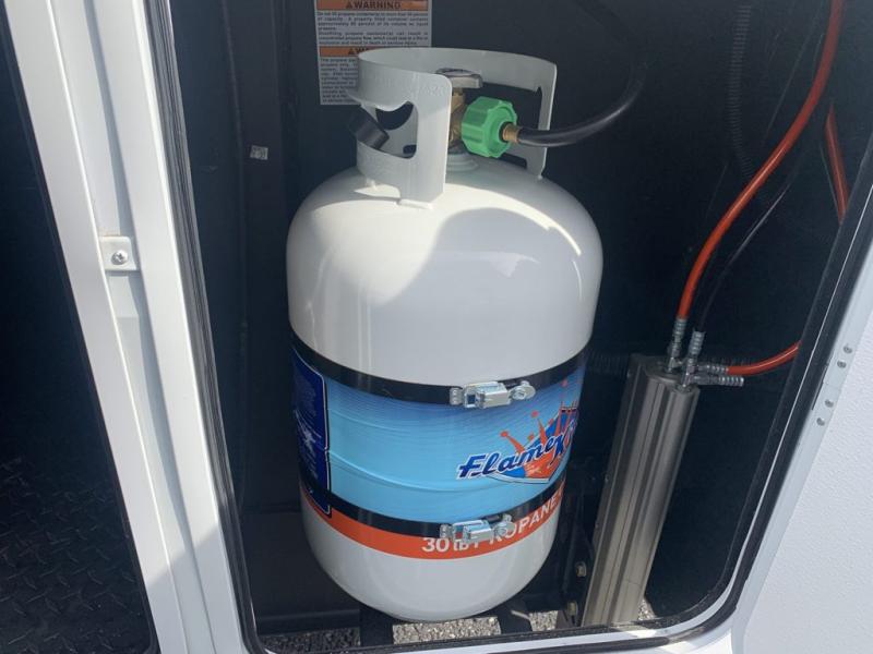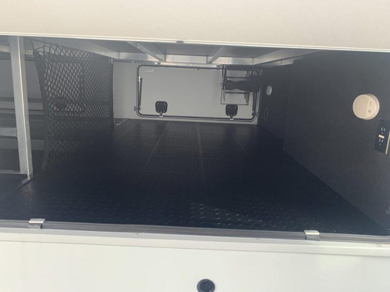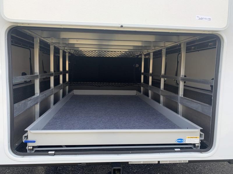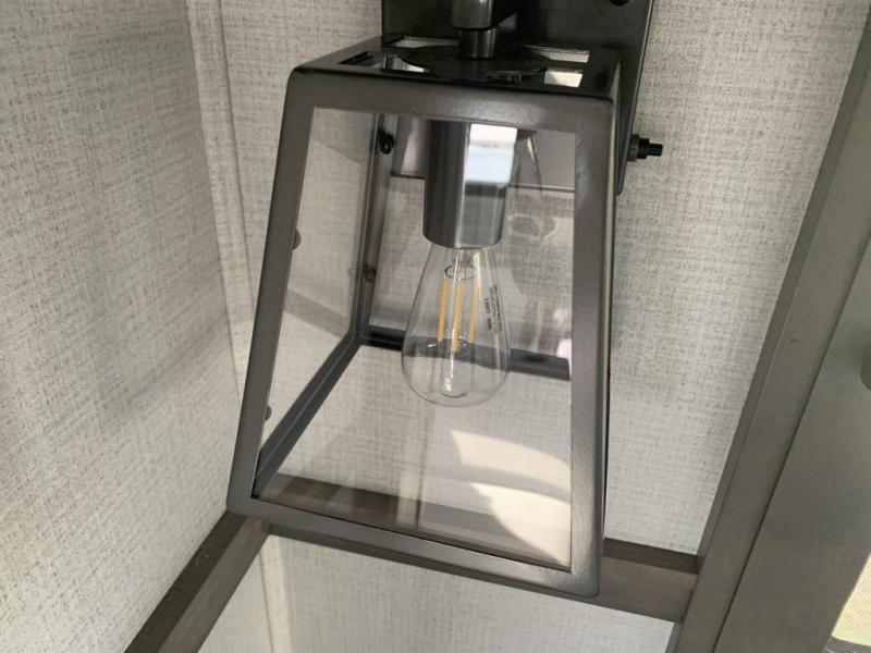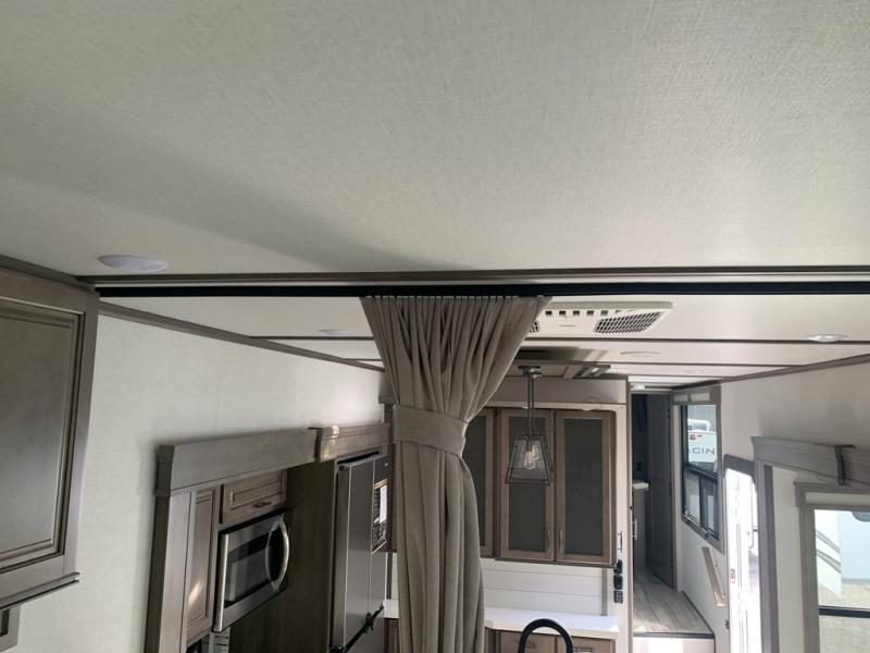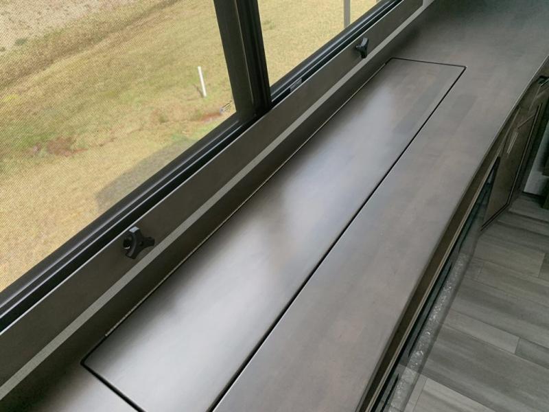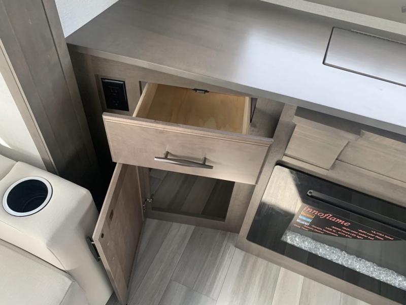 Each minute spent in this spacious fifth wheel will feel just like home! The rear living area includes a rear entertainment center with an LED Smart TV and a fireplace, overhead cabinets, theater seating, plus two tri-fold sofas for your guests to sleep on. You will have the front private bedroom all to yourselves with a queen bed slide out that can be switched out for an optional king bed, and the front closet provides all the space you need to store your belongings. This model includes a spacious full bath with a flip-up teak seat, a shower skylight, plus dual bath sinks for ultimate convenience. The chef of your group will love the middle kitchen with its convenient island including double sinks, a residential cooktop and 24" oven, 20 cu. ft. refrigerator, and free-standing dinette plus a hutch and buffet for storage. Head outdoors to find a 16' power awning with LED lights and middle pass through along with rear storage including a sliding tray, and you might want to add the optional pull-out kitchen.